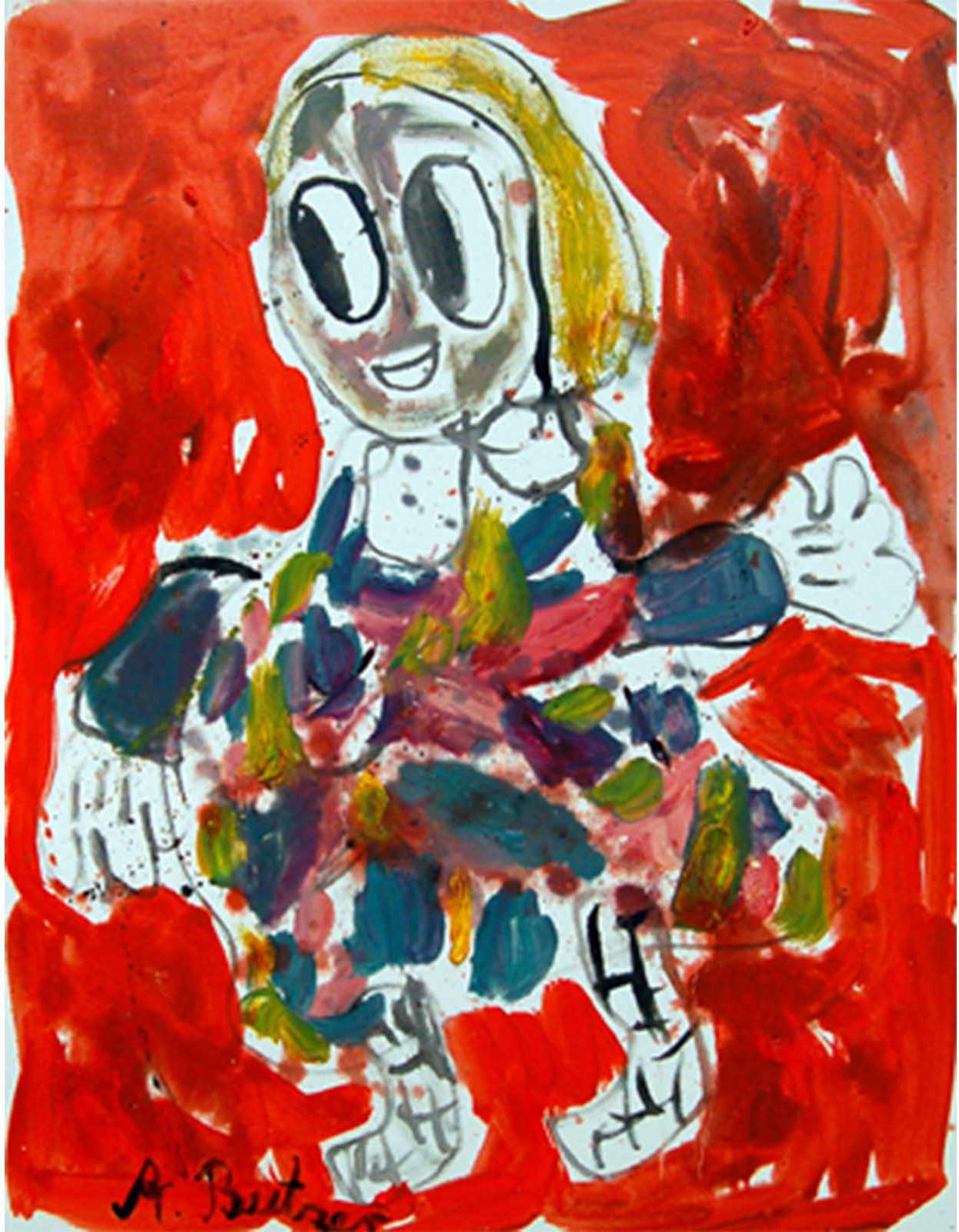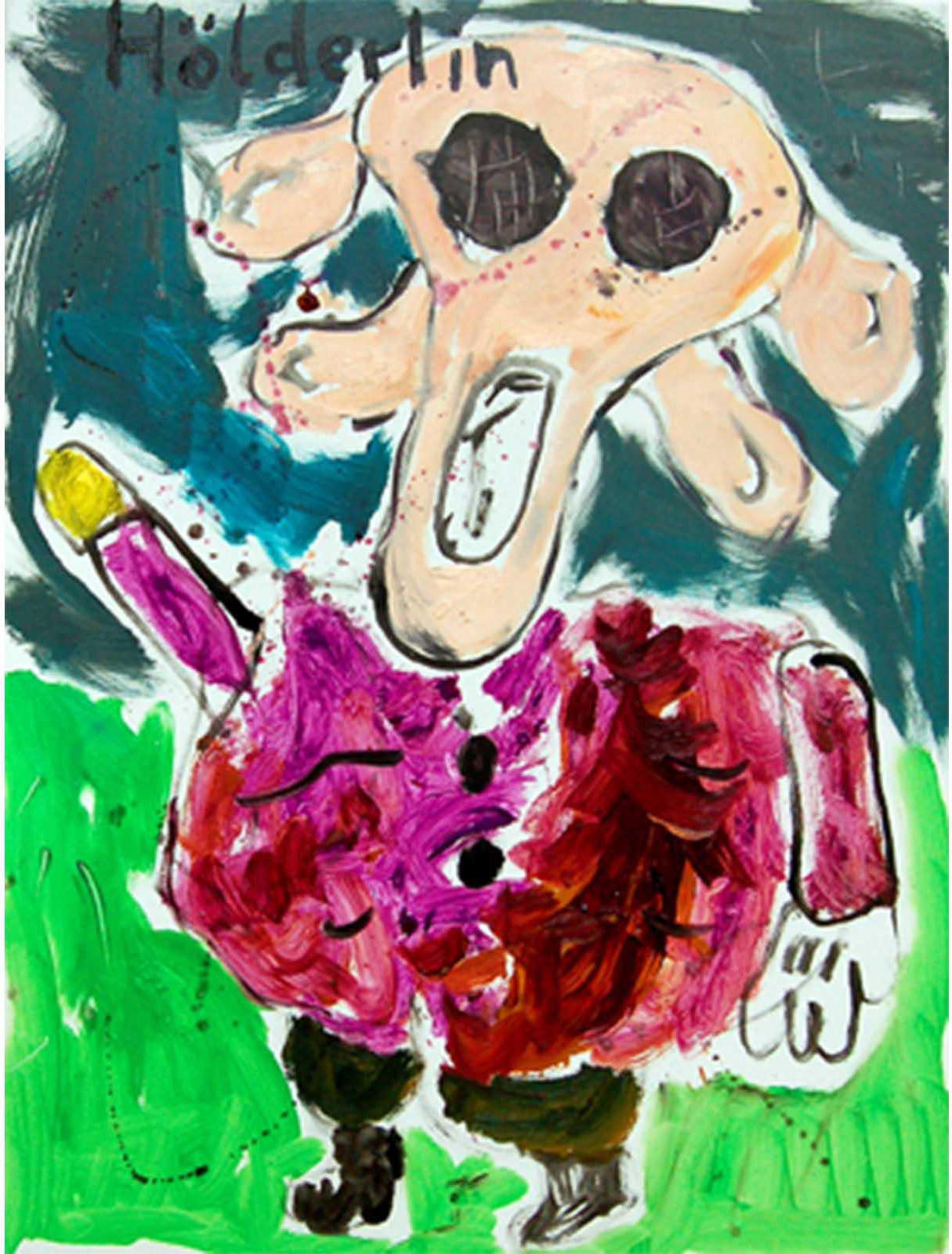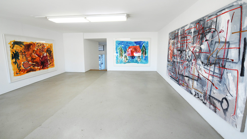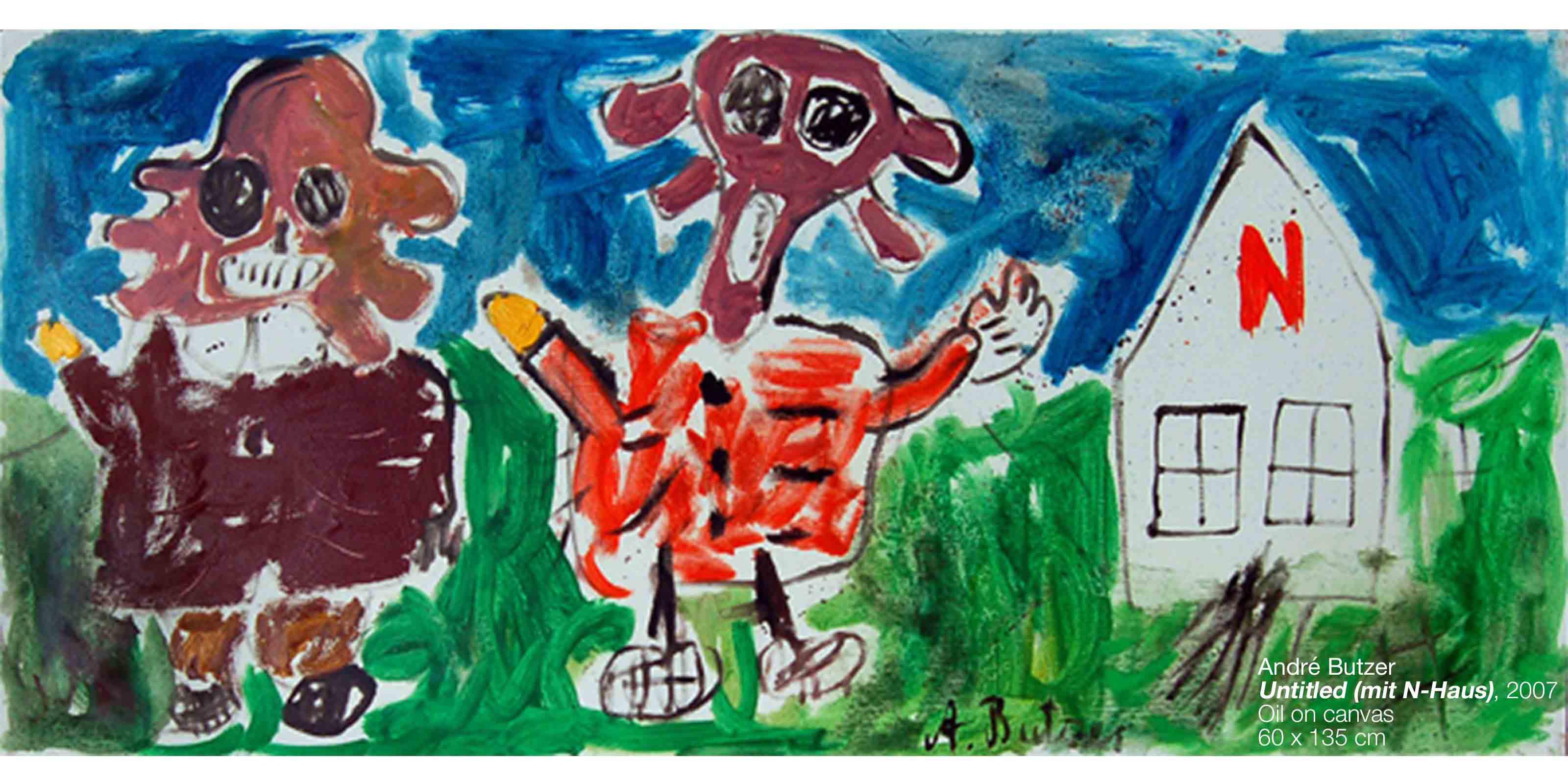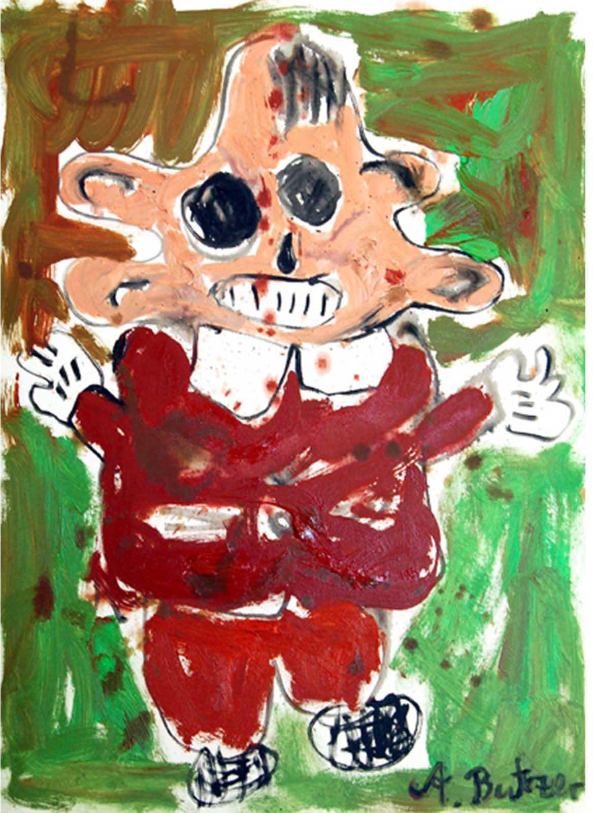 Butzer’s oil paintings refurbish the symbols of mass media commodity and nationalist propaganda with rare painterly authority, fusing the lineage of pure artistic integrity with his own agenda of historical revisionism and post-ideological futurism. In this new body of work, Butzer expands upon the formalist concerns set forth in his watercolours, exchanging his tribal pop symbolism for a more direct and articulate language, transposing the rules of graphic composition to hieroglyphic visual formulas. Spanning from the gutturally primal to the poignantly sophisticated, Butzer’s abject motifs such as skulls and cartoon characters have evolved into purely abstract tableaux, taking his highly idiosyncratic brand of expressionistic painting to heightened conclusions.