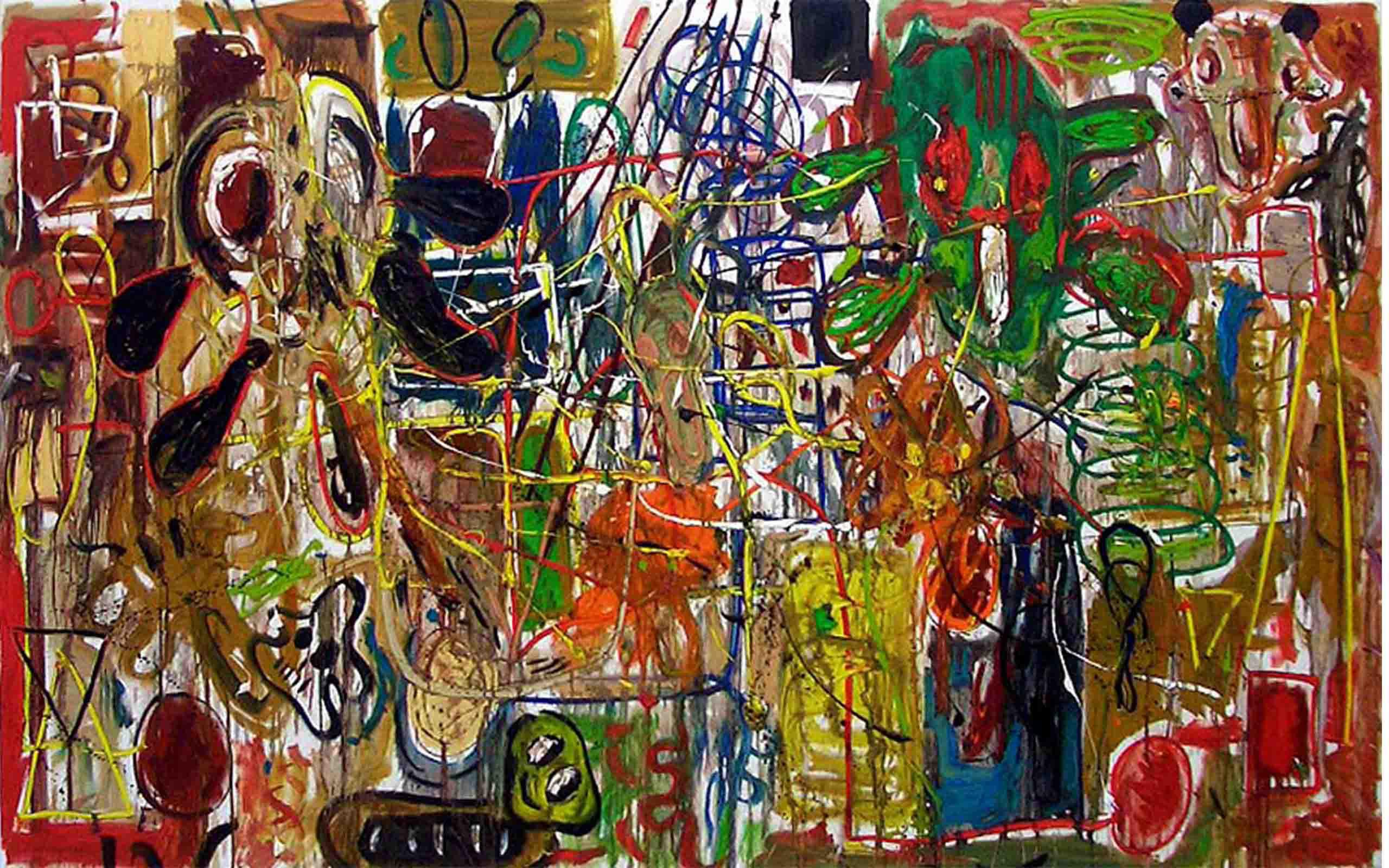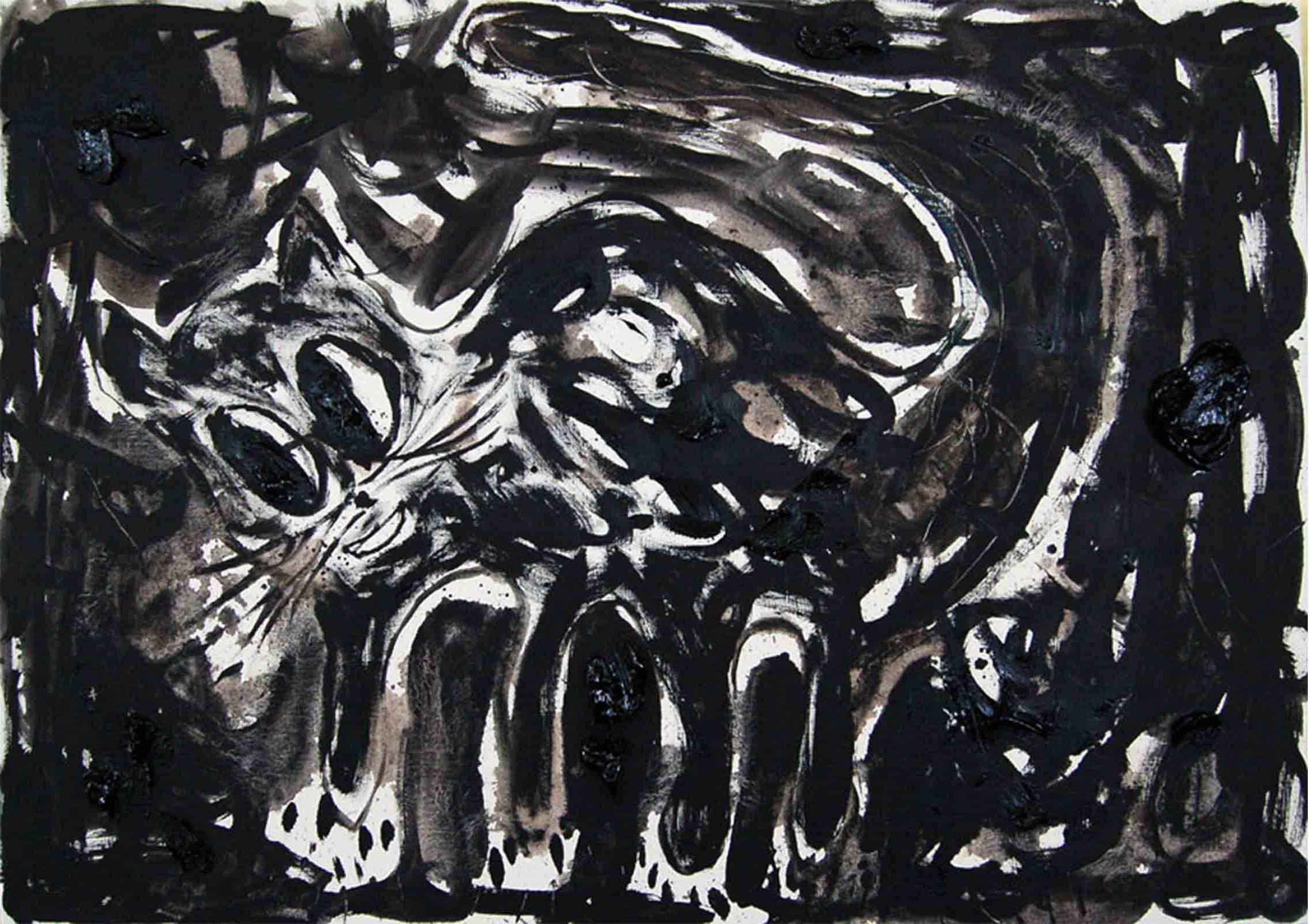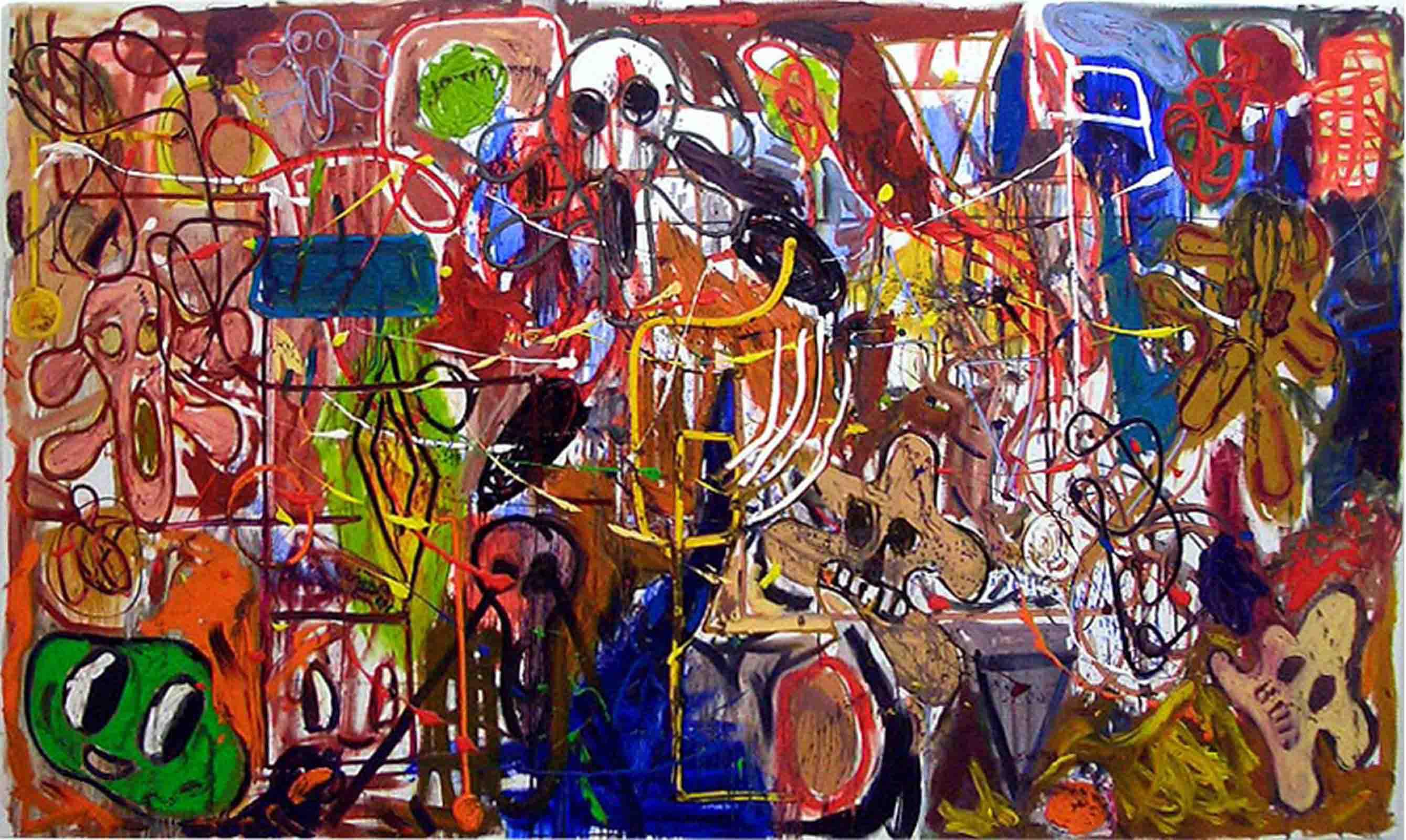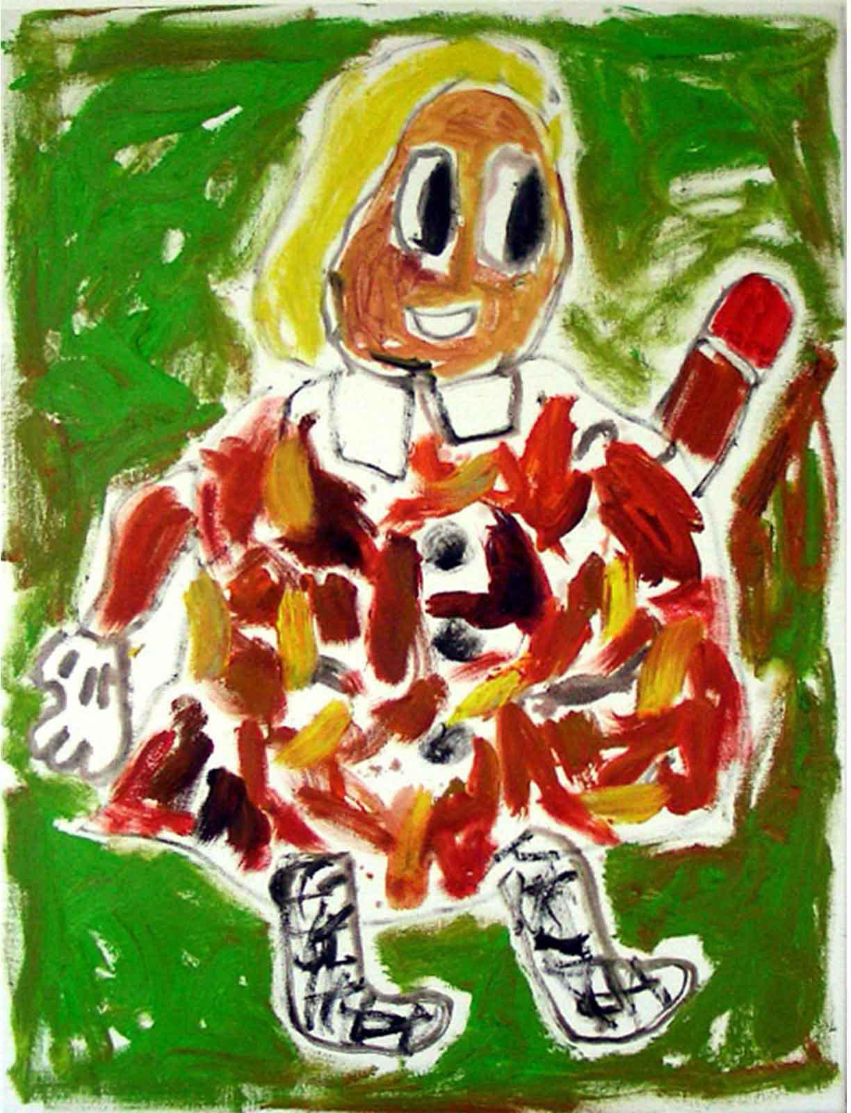 Butzer’s oil paintings refurbish the symbols of mass media commodity and nationalist propaganda with rare painterly authority, fusing the lineage of pure artistic integrity with his own agenda of historical revisionism and post-ideological futurism. In this new body of work, Butzer expands upon the formalist concerns set forth in his watercolours, exchanging his tribal pop symbolism for a more direct and articulate language, transposing the rules of graphic composition to hieroglyphic visual formulas. Spanning from the gutturally primal to the poignantly sophisticated, Butzer’s abject motifs such as skulls and cartoon characters have evolved into purely abstract tableaux, taking his highly idiosyncratic brand of expressionistic painting to heightened conclusions.