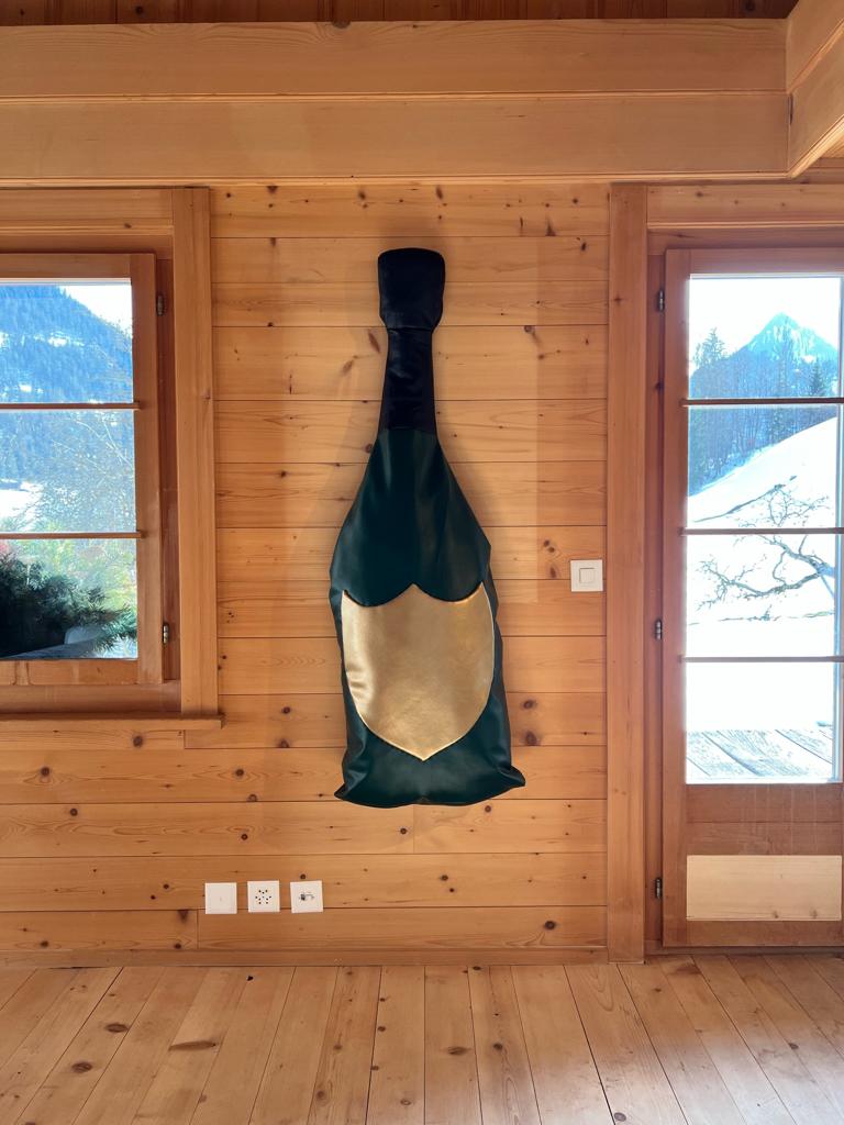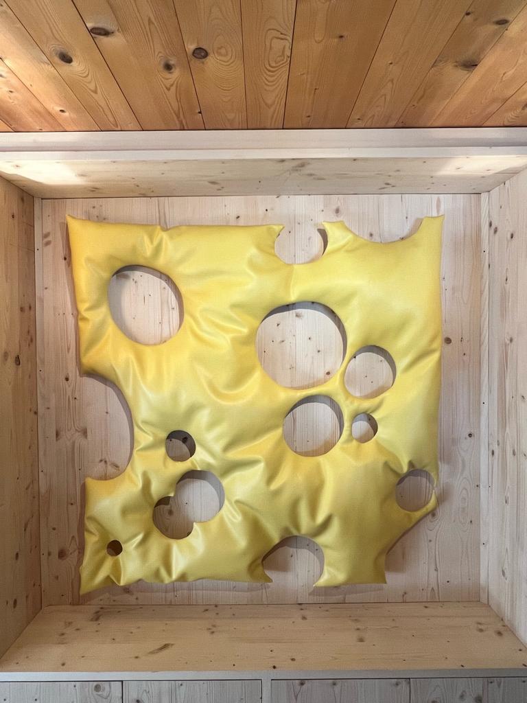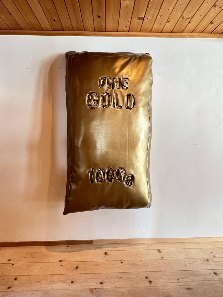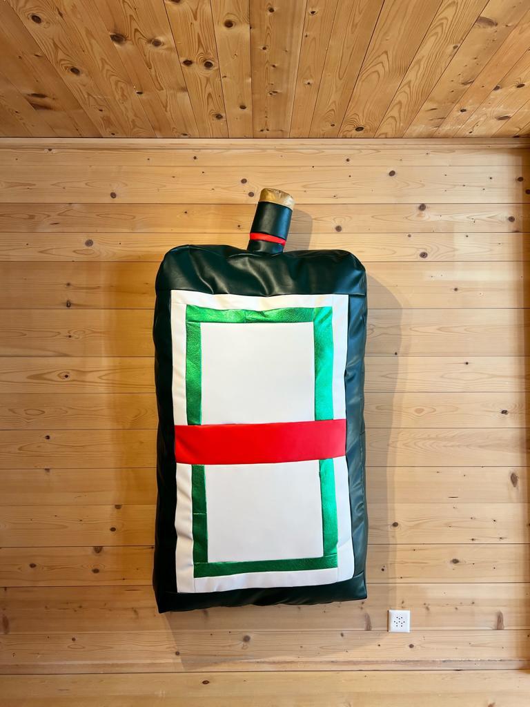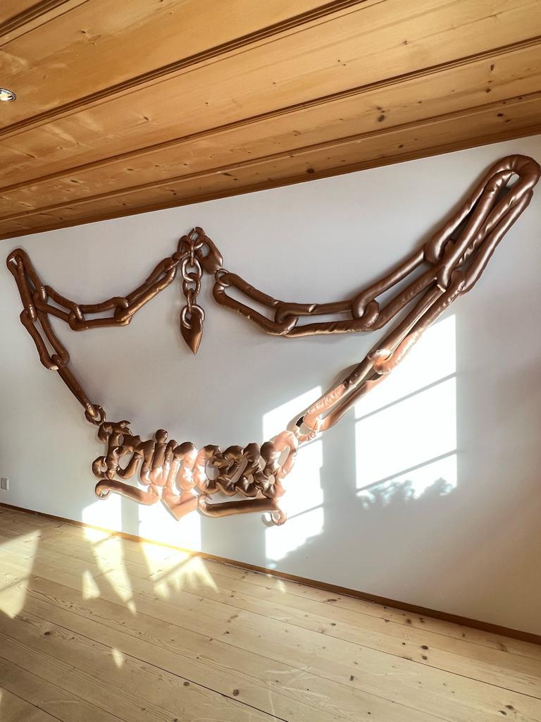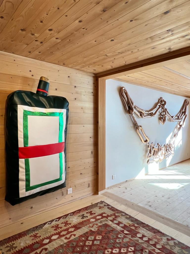 Known for her satirical sculptures in loosely stuffed vinyl, Freeman’s show is ironically named Aspen, after the famed ski resort in the US. The exhibition is comprised of large-scale replicas of recognisable consumer items in the artist’s preferred material of stuffed vinyl, from local signifiers like a slice of Emmental cheese and a Swiss Army knife to a bottle of Jägermeister, a gold “Princess” necklace, a bottle of Dom Perignon, and a gold bar. Freeman’s soft, wall-mounted sculptures simultaneously objectify and let the air out of all the clichés that can be associated with the idyllic barn and locale in which the show takes place.