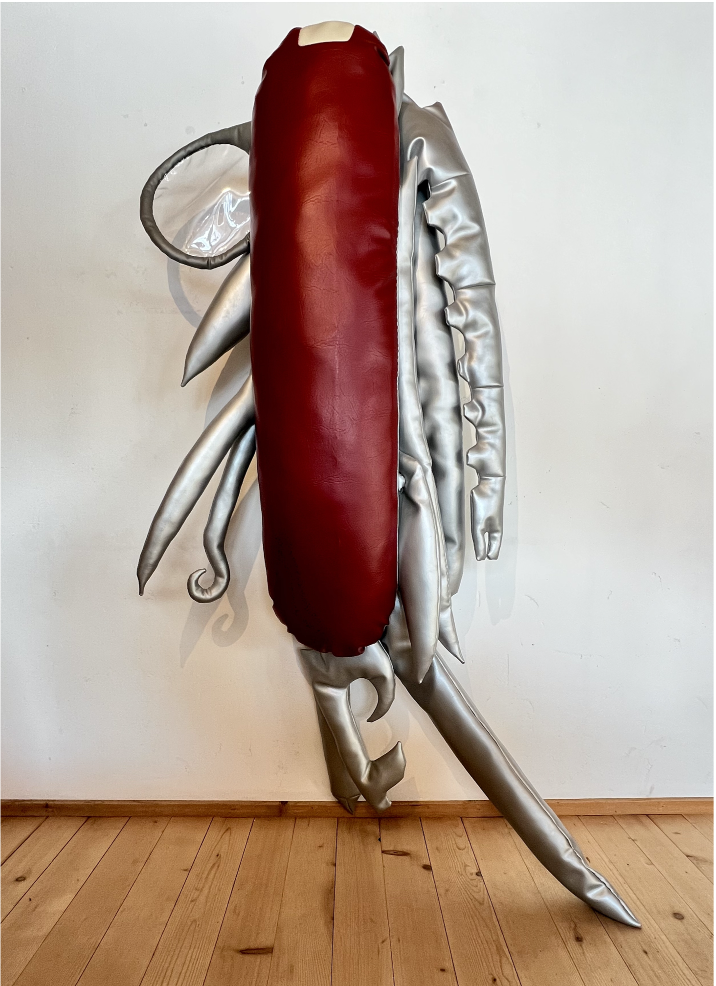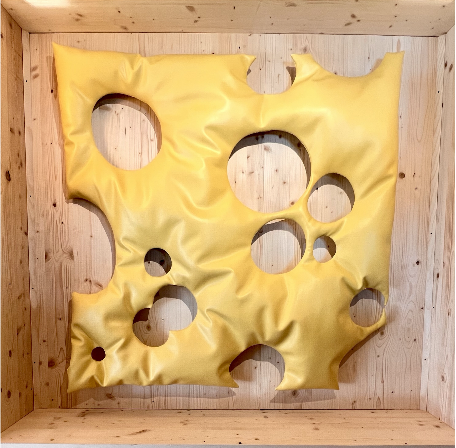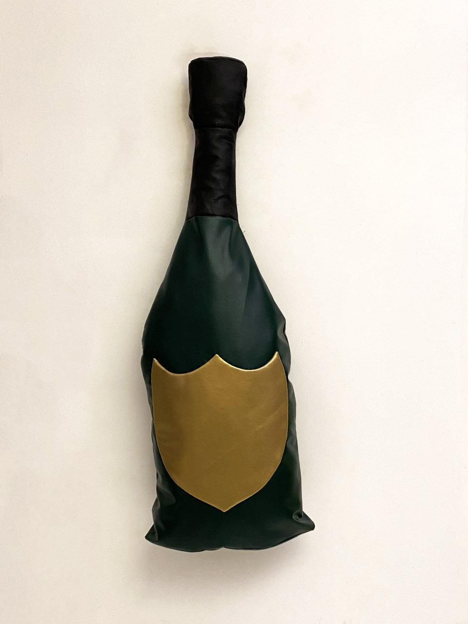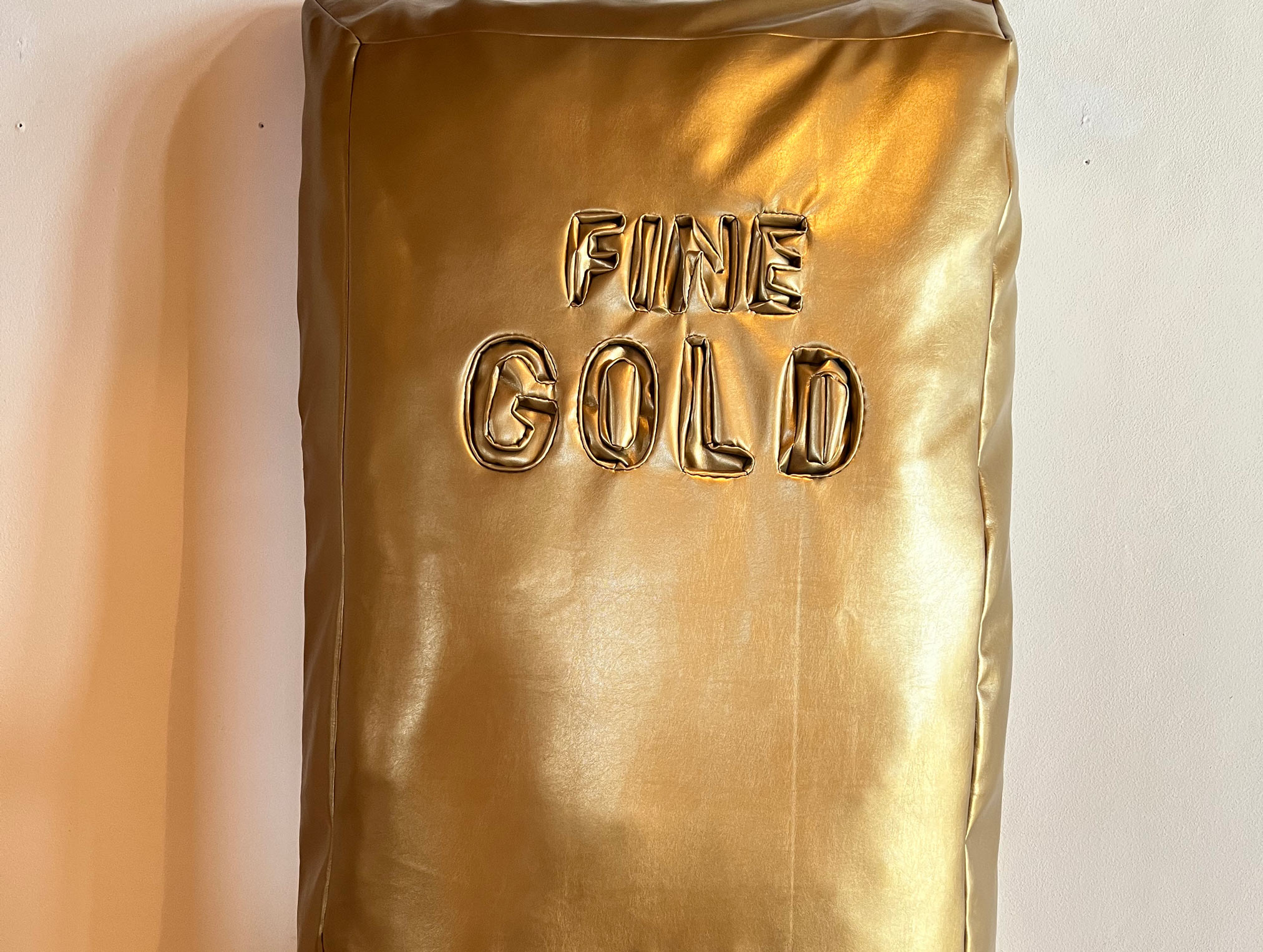 Known for her satirical sculptures in loosely stuffed vinyl, Freeman’s show is ironically named Aspen, after the famed ski resort in the US. The exhibition is comprised of large-scale replicas of recognisable consumer items in the artist’s preferred material of stuffed vinyl, from local signifiers like a slice of Emmental cheese and a Swiss Army knife to a bottle of Jägermeister, a gold “Princess” necklace, a bottle of Dom Perignon, and a gold bar. Freeman’s soft, wall-mounted sculptures simultaneously objectify and let the air out of all the clichés that can be associated with the idyllic barn and locale in which the show takes place.