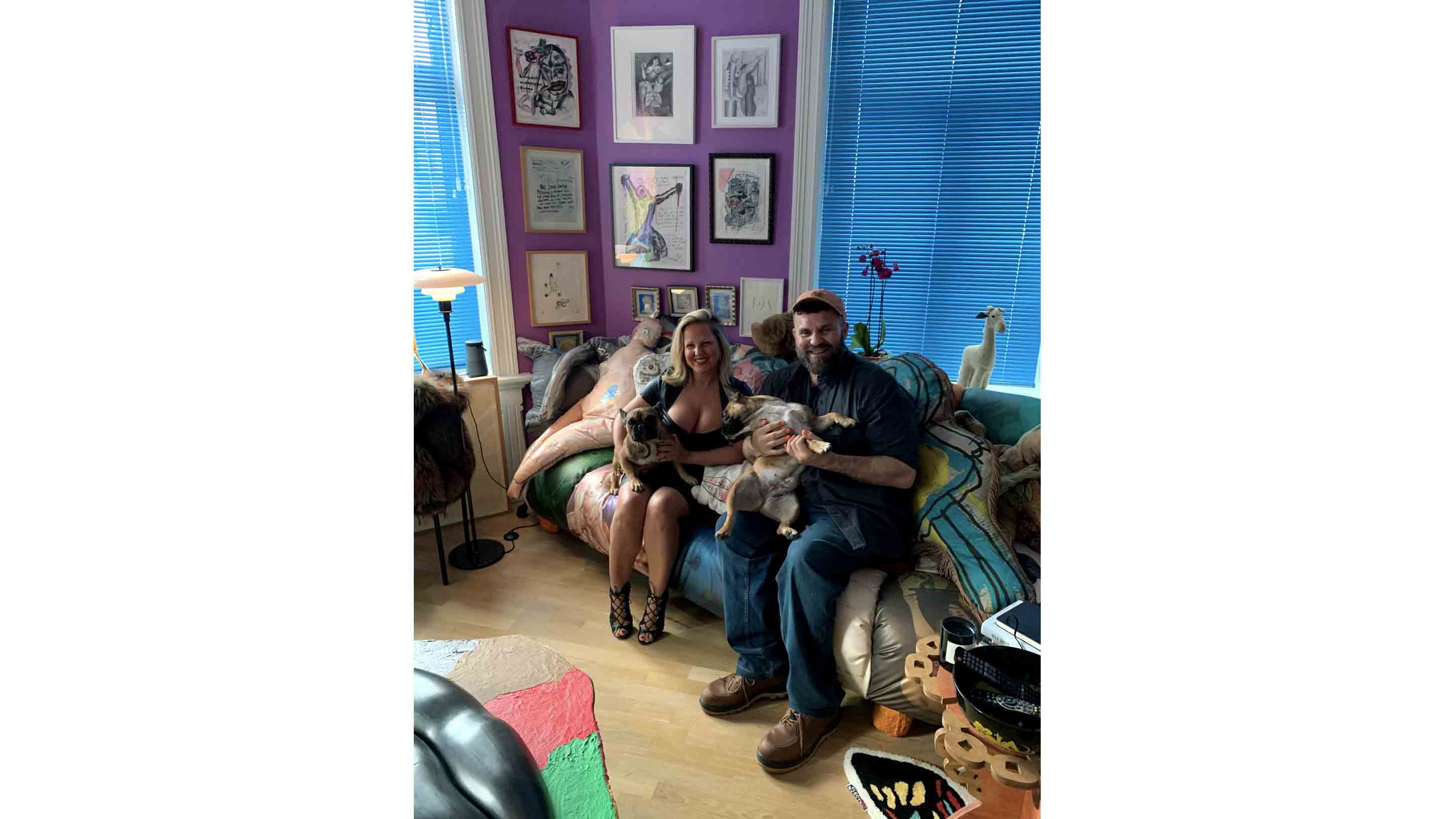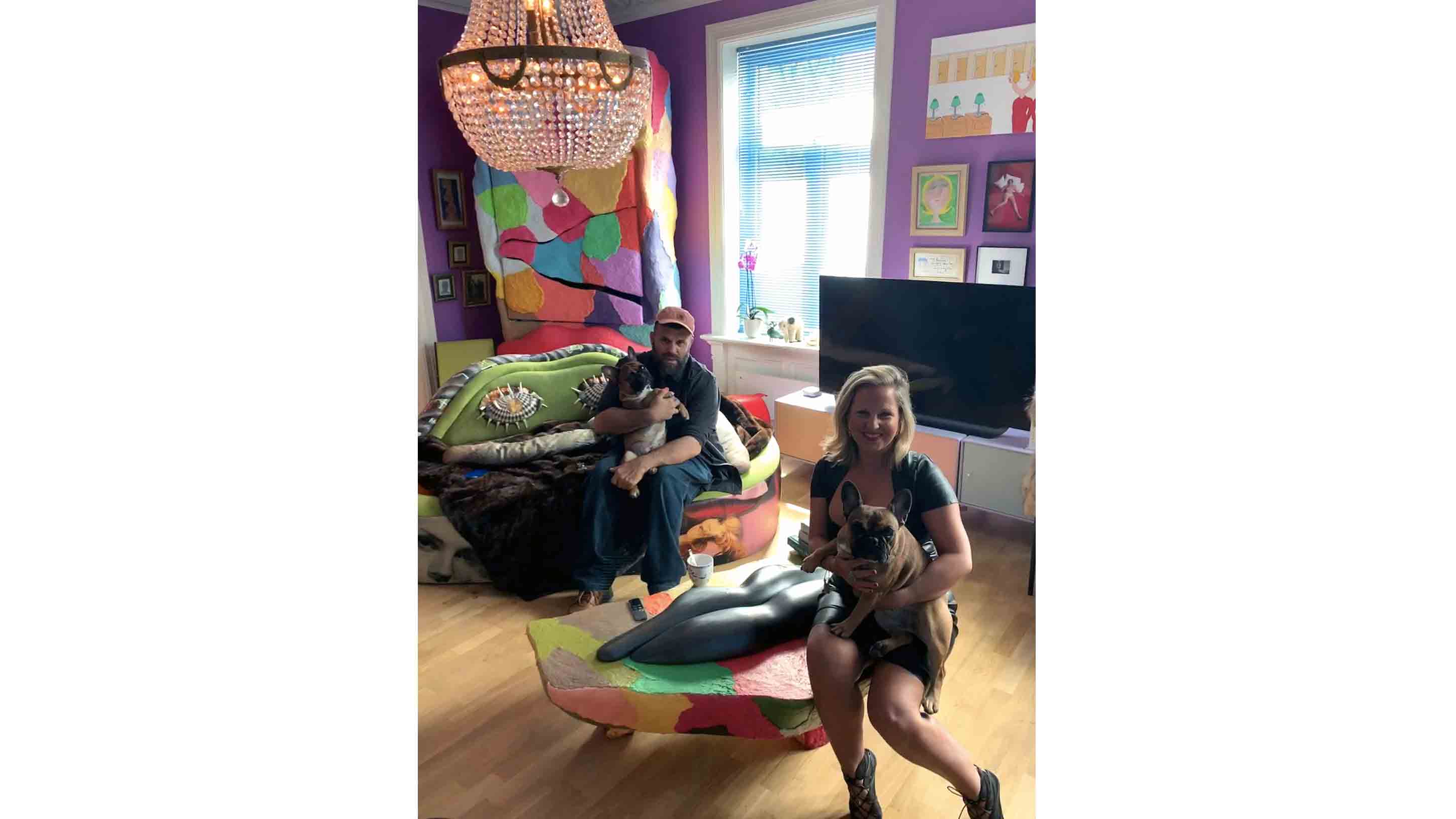 The exhibition’s title NO FISTING TONIGHT references an extreme form of adult play. The title came about through playful conversations between the artist and gallery owner Patricia Low, their manicured nails and difference in hand sizes inspiring the phrase. Such celebrations of the colloquial and unseemly are typical of Melgaard’s methods of enquiry and unflinching gaze. Patricia Low also features alongside the artist on two newly produced wallpapers that will be fitted in the gallery and act as a backdrop for the paintings. The repeated use of trashy portraits and self-portraits, alongside text and simple graphics, place the wallpaper design in the realm of Instagram and social media style aesthetics in contrast to the analogue hand produced paintings.