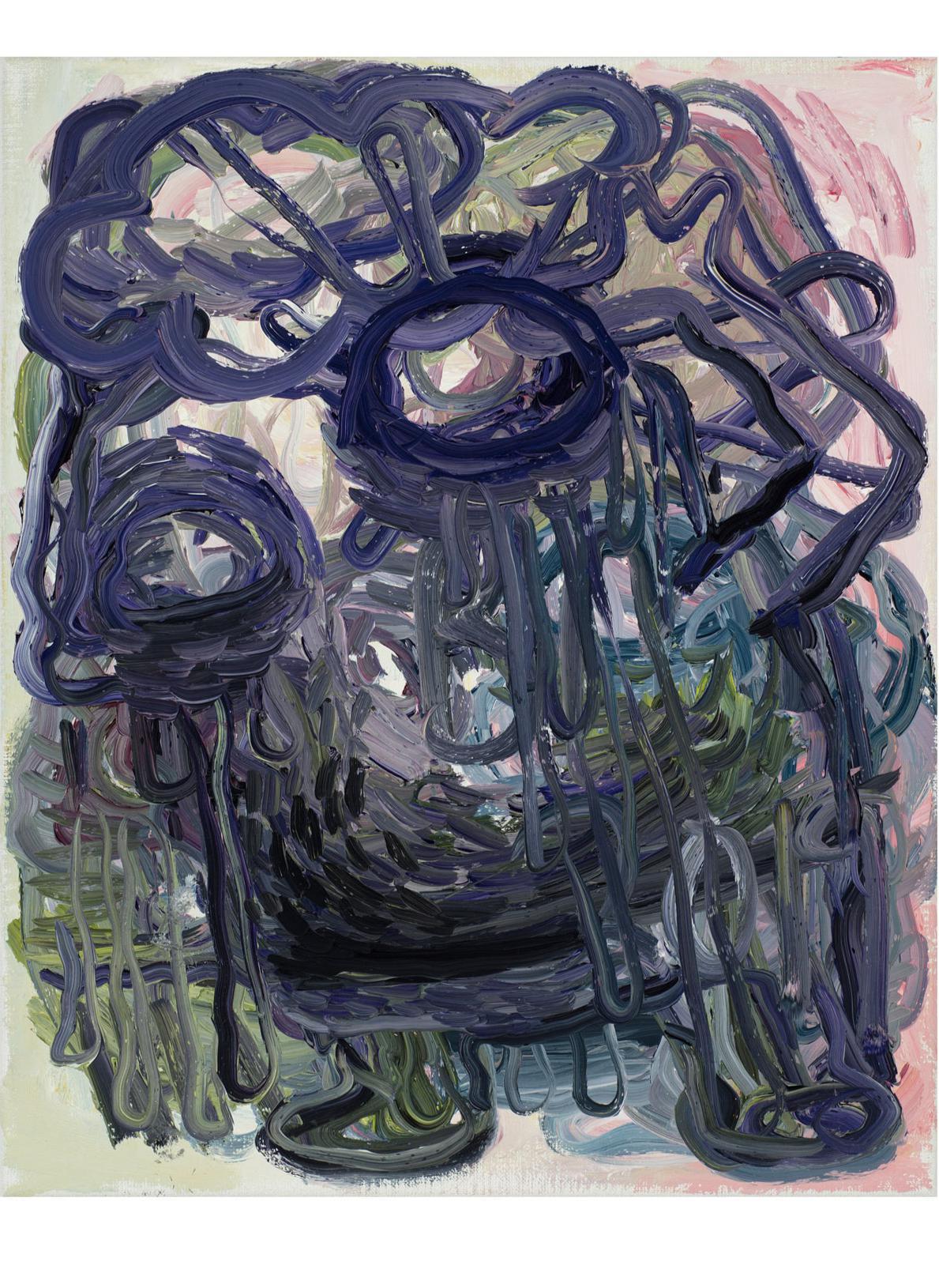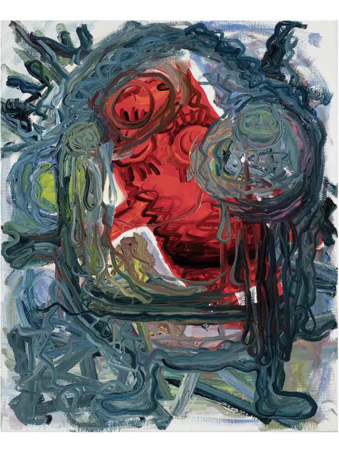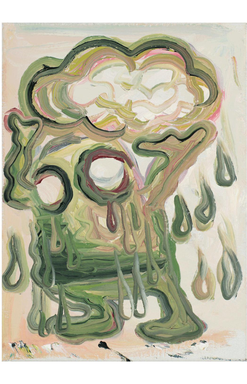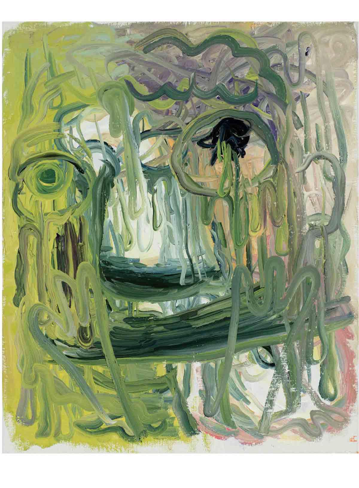The works are both remnants of the performance of their own production and what the artist describes as the “amoral act” of painting. By this, Melgaard is talking about painting within contemporary art as “fetish objects” in the hyper-capitalist system. Painting as totem for the twenty first century. The pictures are brash and brutal in their sophistication, often focusing on demonic faces which melt into layers of blurred color. There are also bizarre dreamlike scenes that feature otherworldly creatures, part dolphin, part alligator.