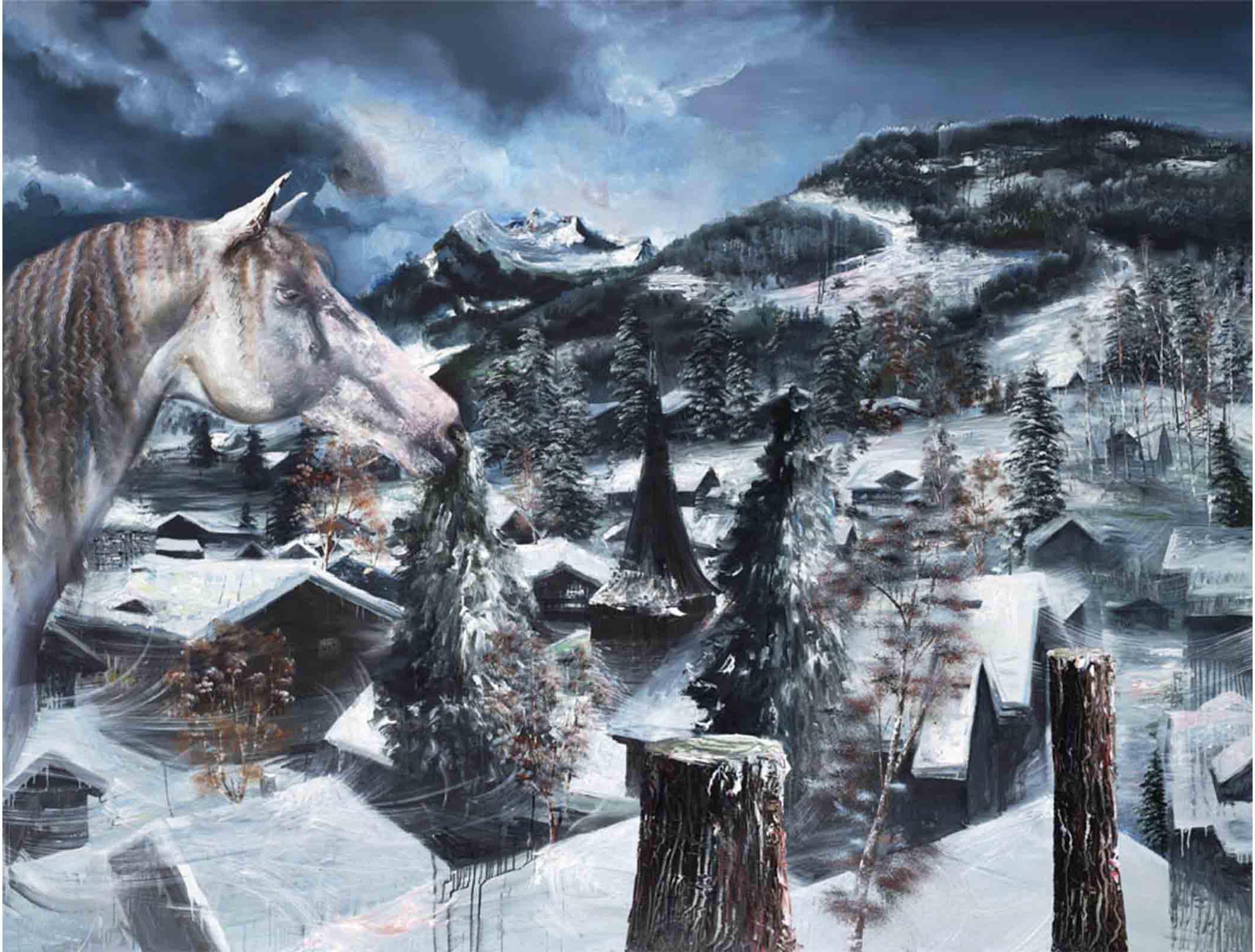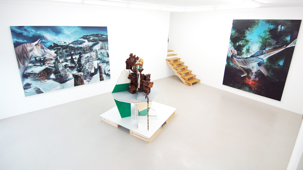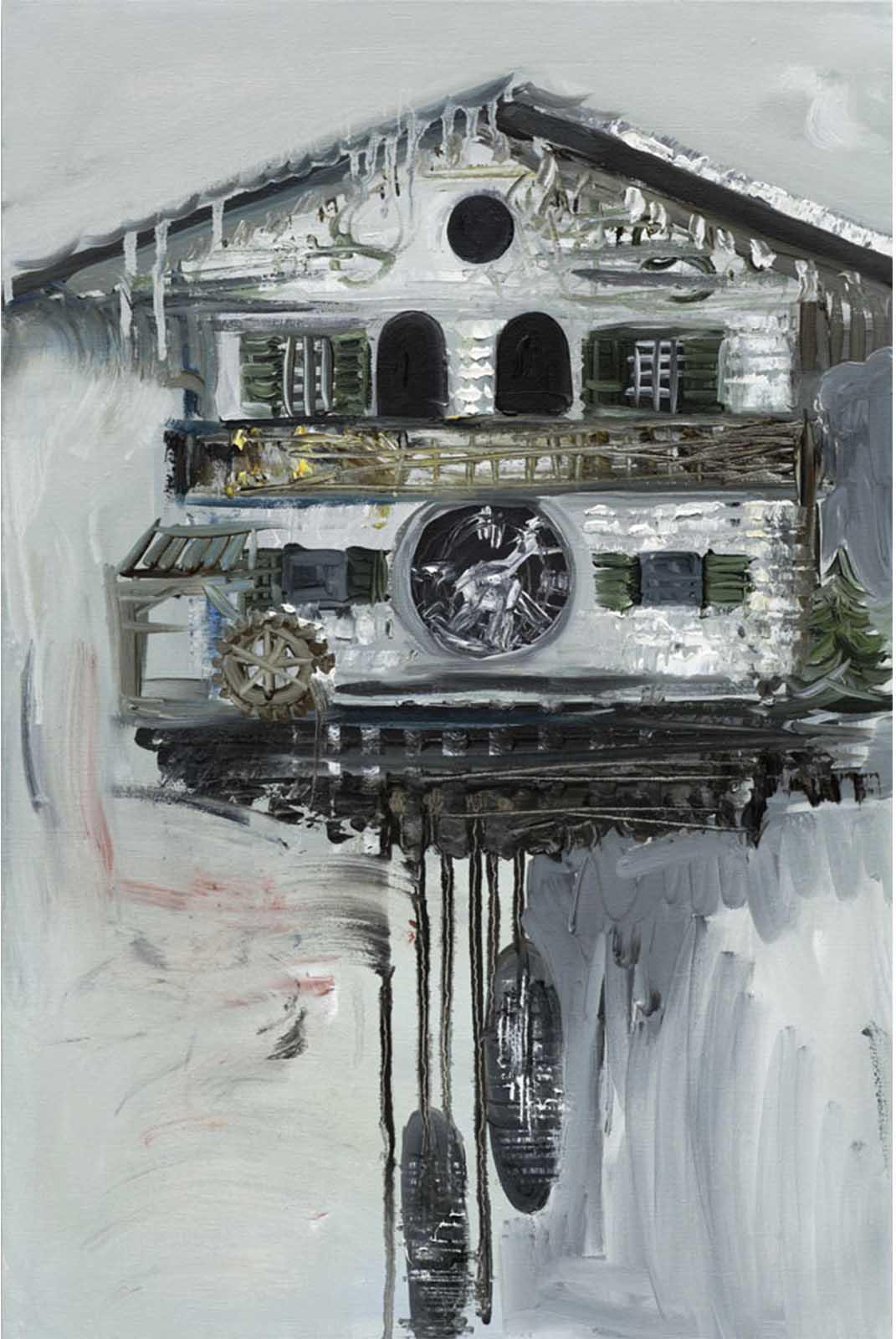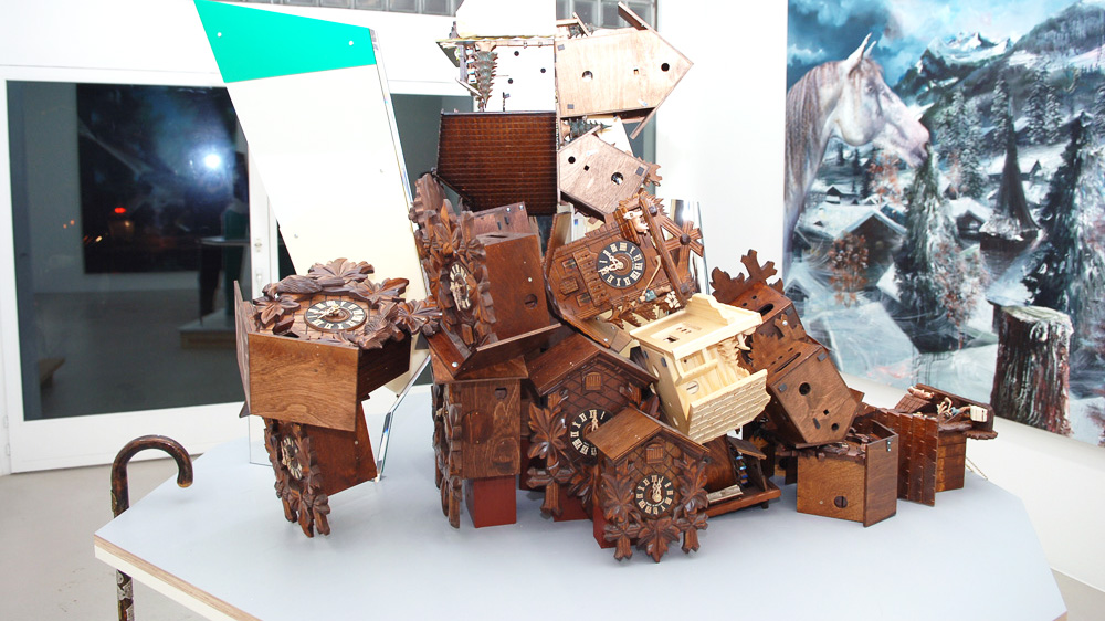 Using many of the pictorial devices found in his paintings, Martin’s sculptures create spatial and referential distortion through their eclectic materiality. Infused by a sense of drama and play, Martin’s life-sized architectures envision a ground between reality, illusion, and fantasy, theatrically placing the viewer as both viewer and participant in their topsy-turvy realm. For Brennholz + Ravioli, Martin has created a new work comprised of cuckoo clocks, thematically linking to his paintings.