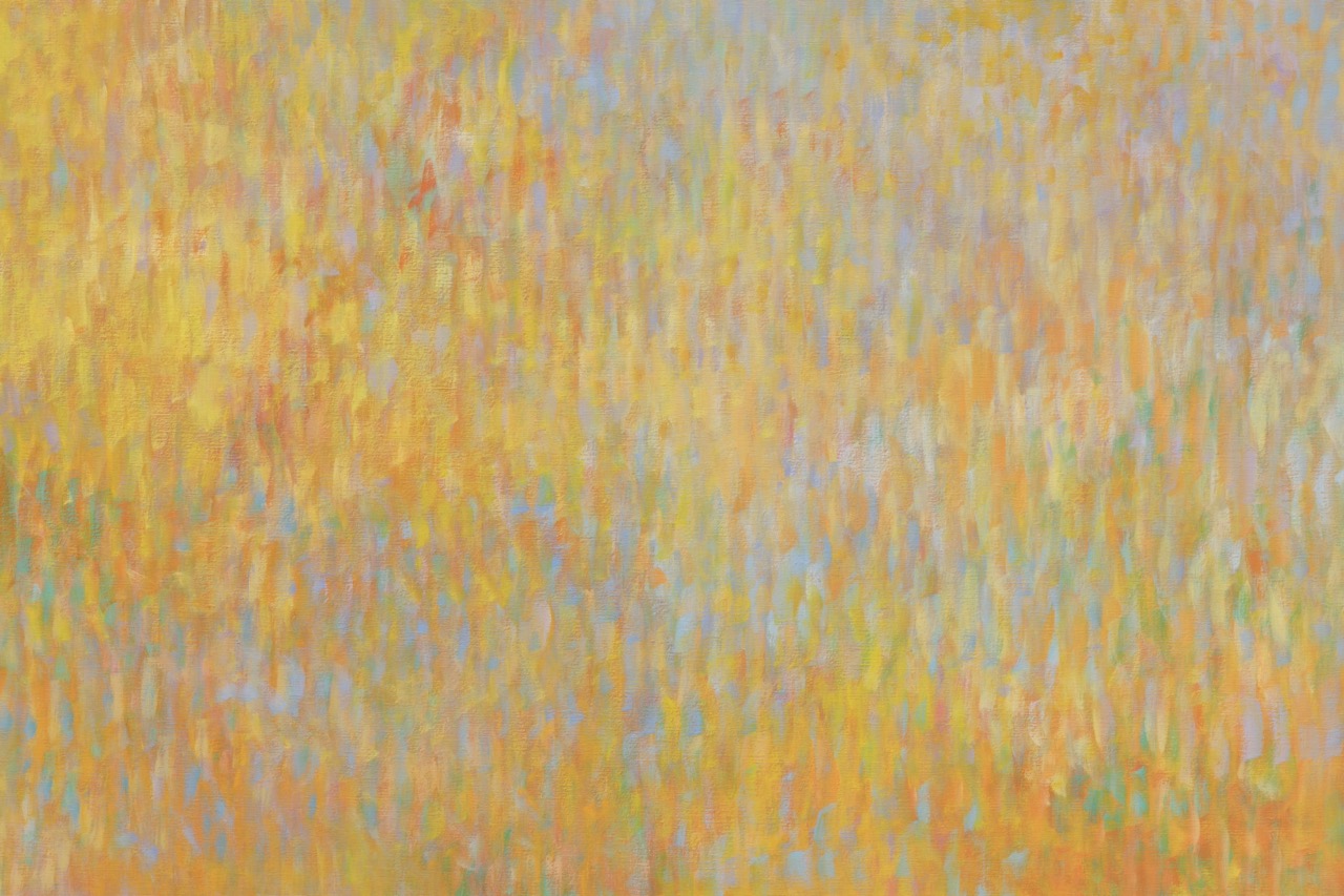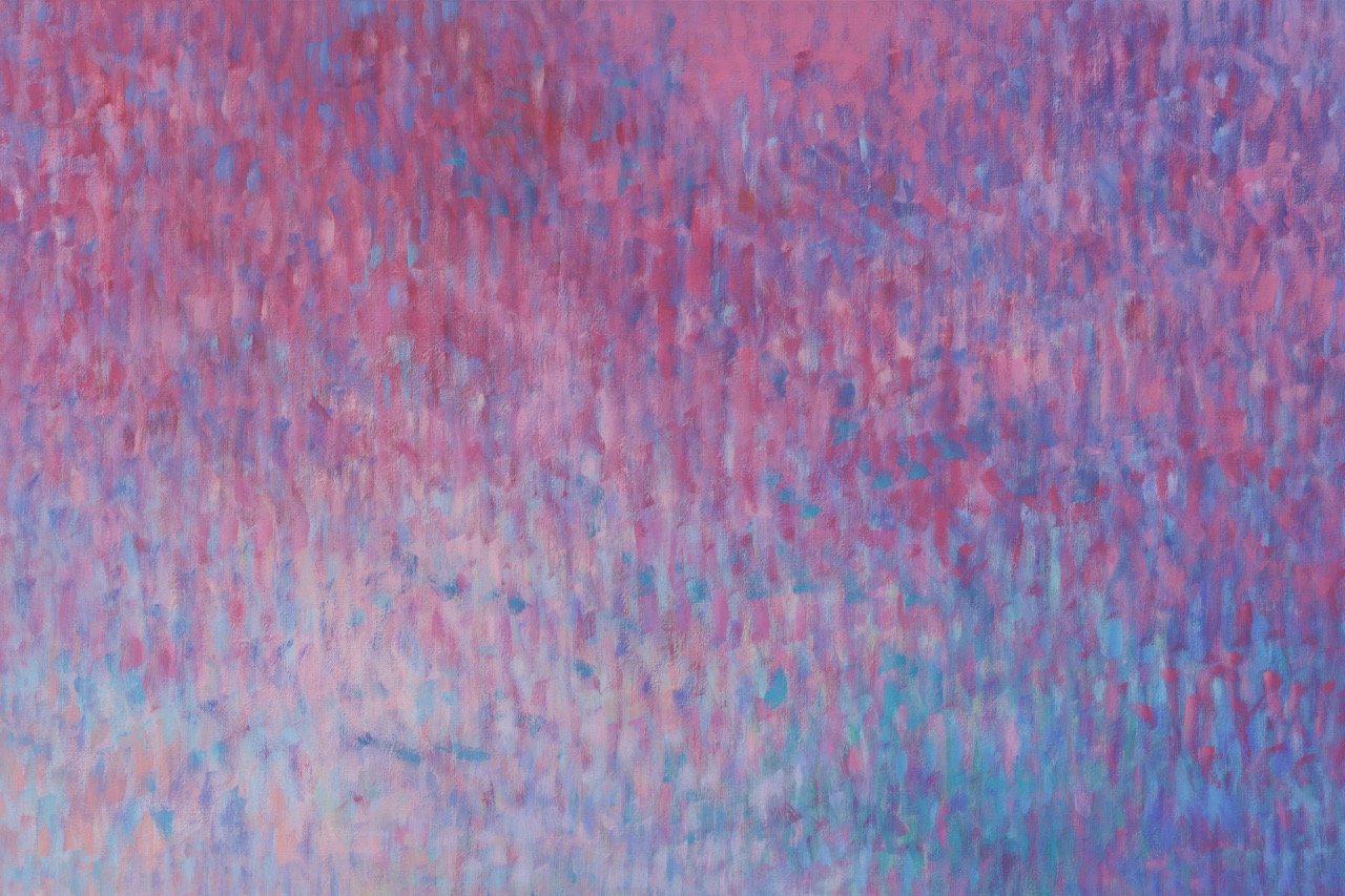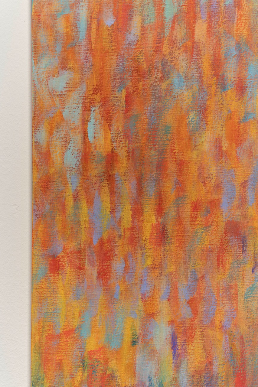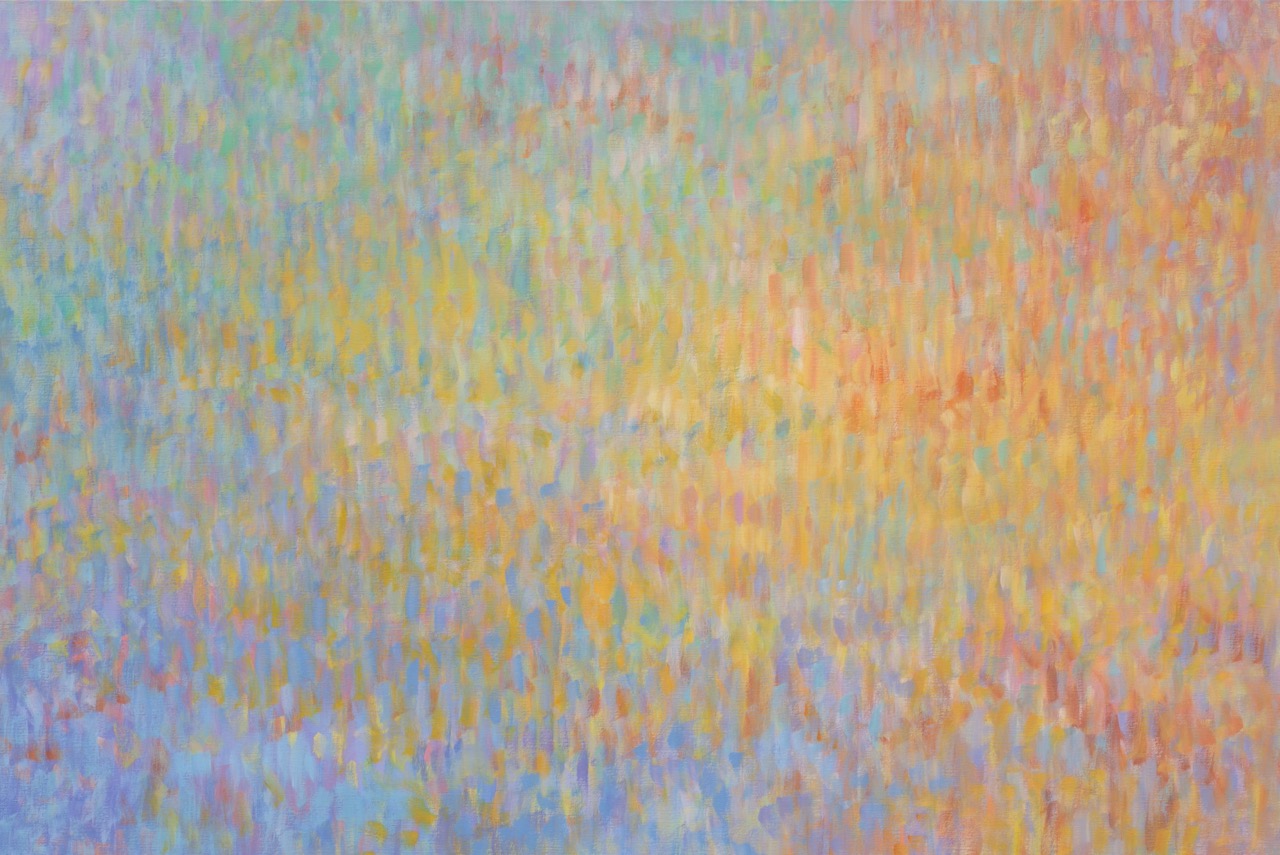 For those already familiar with Bernadet’s Fugues—arguably his most widely recognized paintings—the brushstrokes of his Venetian variations will appear less mechanical, as if the silence mentioned in Proust’s letter had subtly liquified the air around them. The artist’s pointillistic rhythms seem to loosen ever so slightly in these horizontal tableaux, making room for elusive but recognizable images. While previous Fugues alluded to Alfred Stieglitz’s famous photographs of clouds, here, we are looking down at the surface of water, recalling Peter Hujar’s horizonless photographs of the Hudson River.
