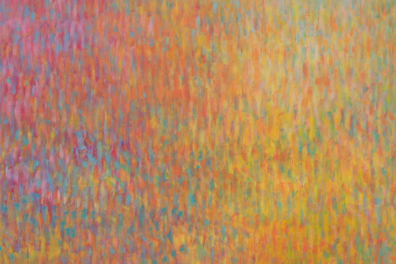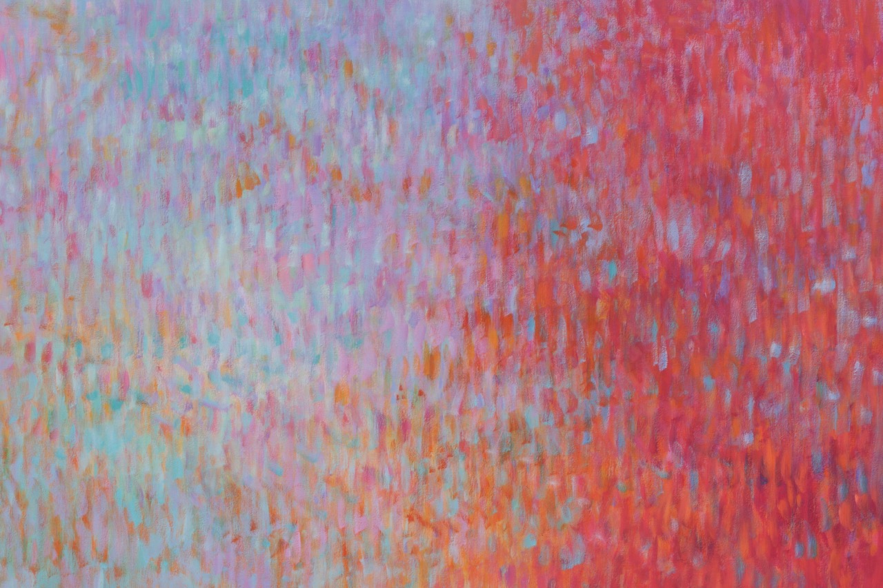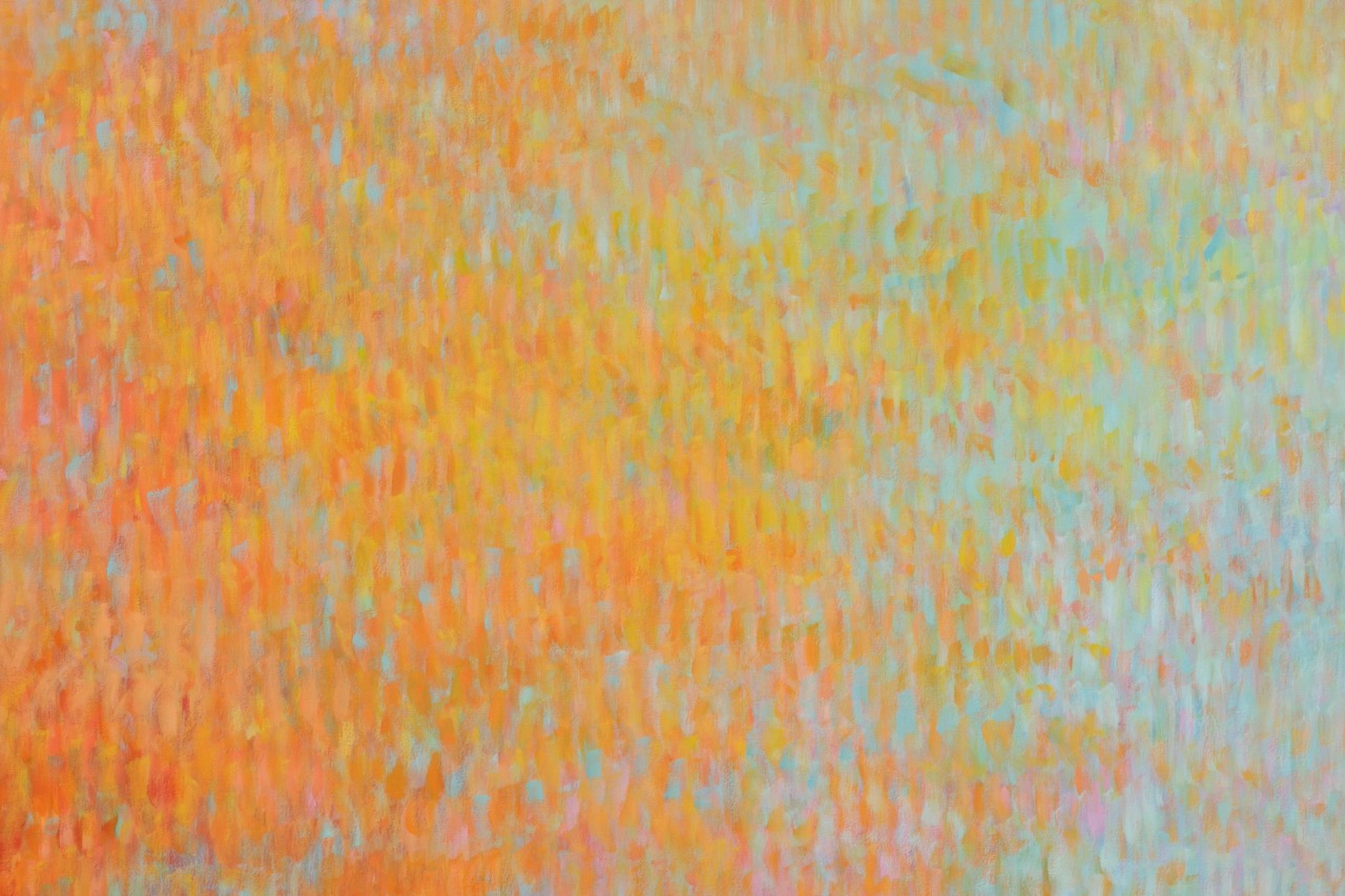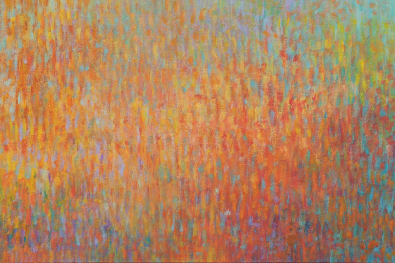 For those already familiar with Bernadet’s Fugues—arguably his most widely recognized paintings—the brushstrokes of his Venetian variations will appear less mechanical, as if the silence mentioned in Proust’s letter had subtly liquified the air around them. The artist’s pointillistic rhythms seem to loosen ever so slightly in these horizontal tableaux, making room for elusive but recognizable images. While previous Fugues alluded to Alfred Stieglitz’s famous photographs of clouds, here, we are looking down at the surface of water, recalling Peter Hujar’s horizonless photographs of the Hudson River.