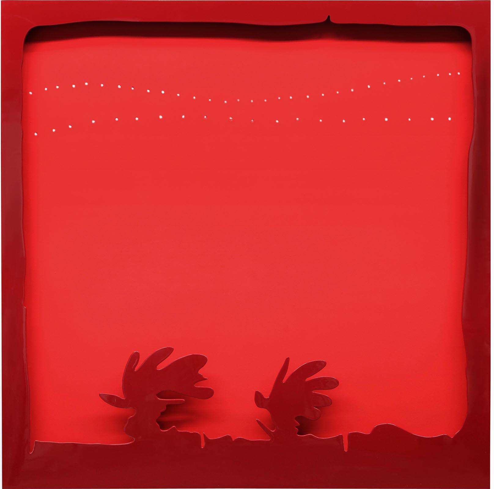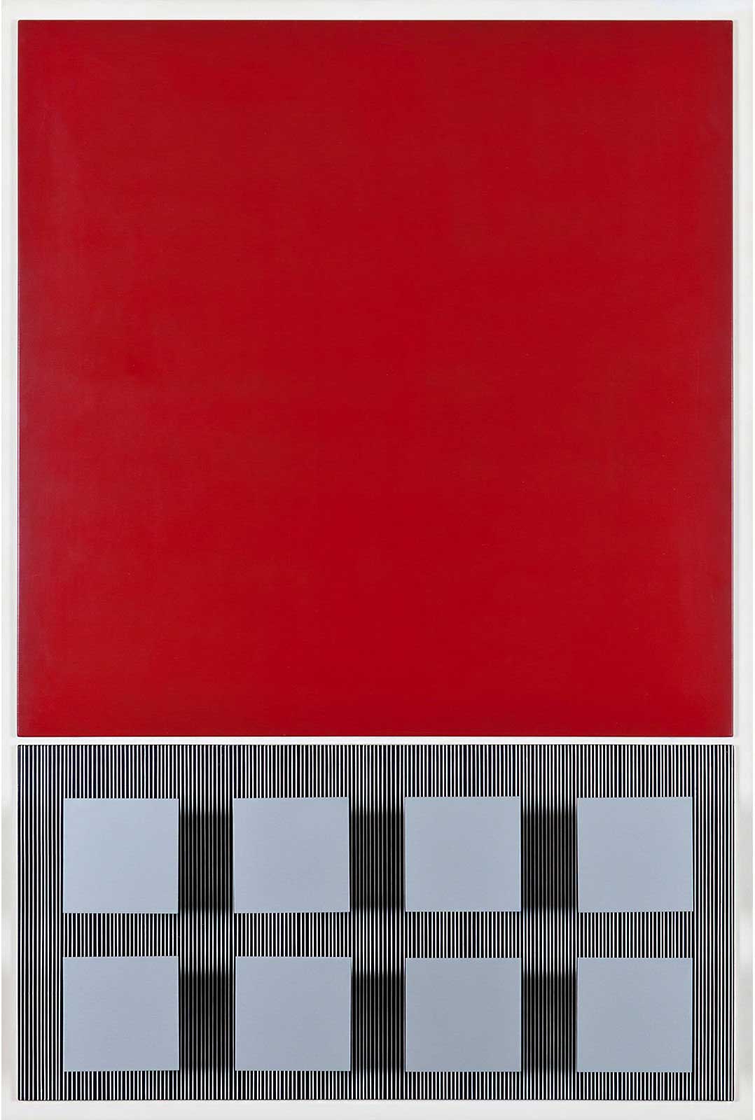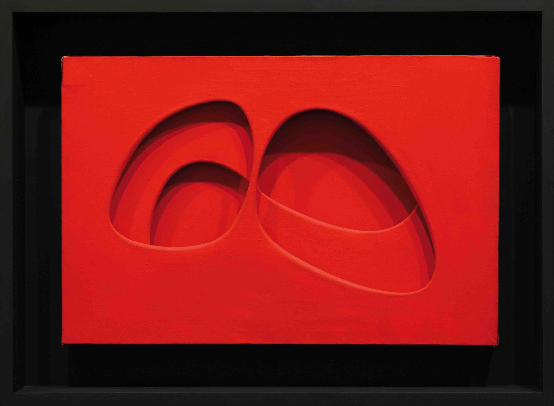 Red water-based paint on canvas and dark red lacquered wooden frame