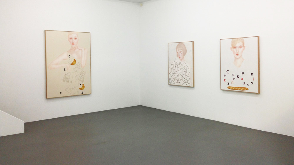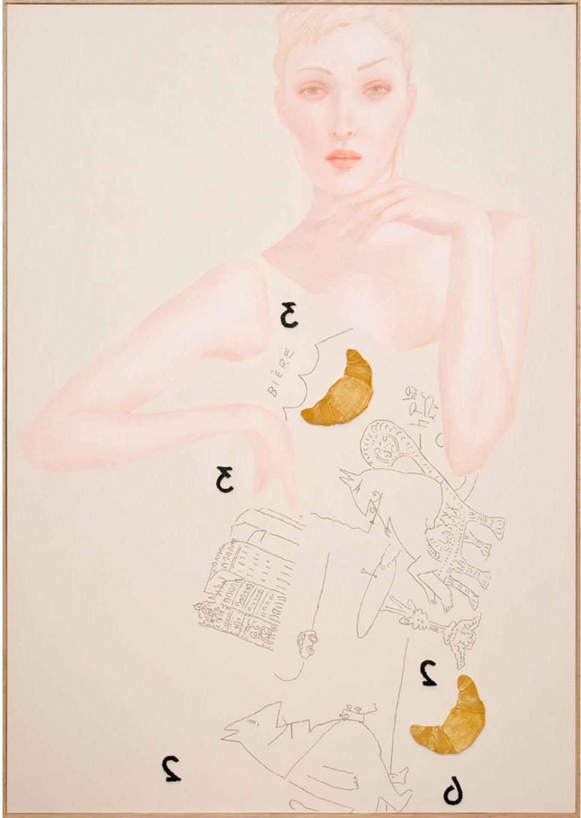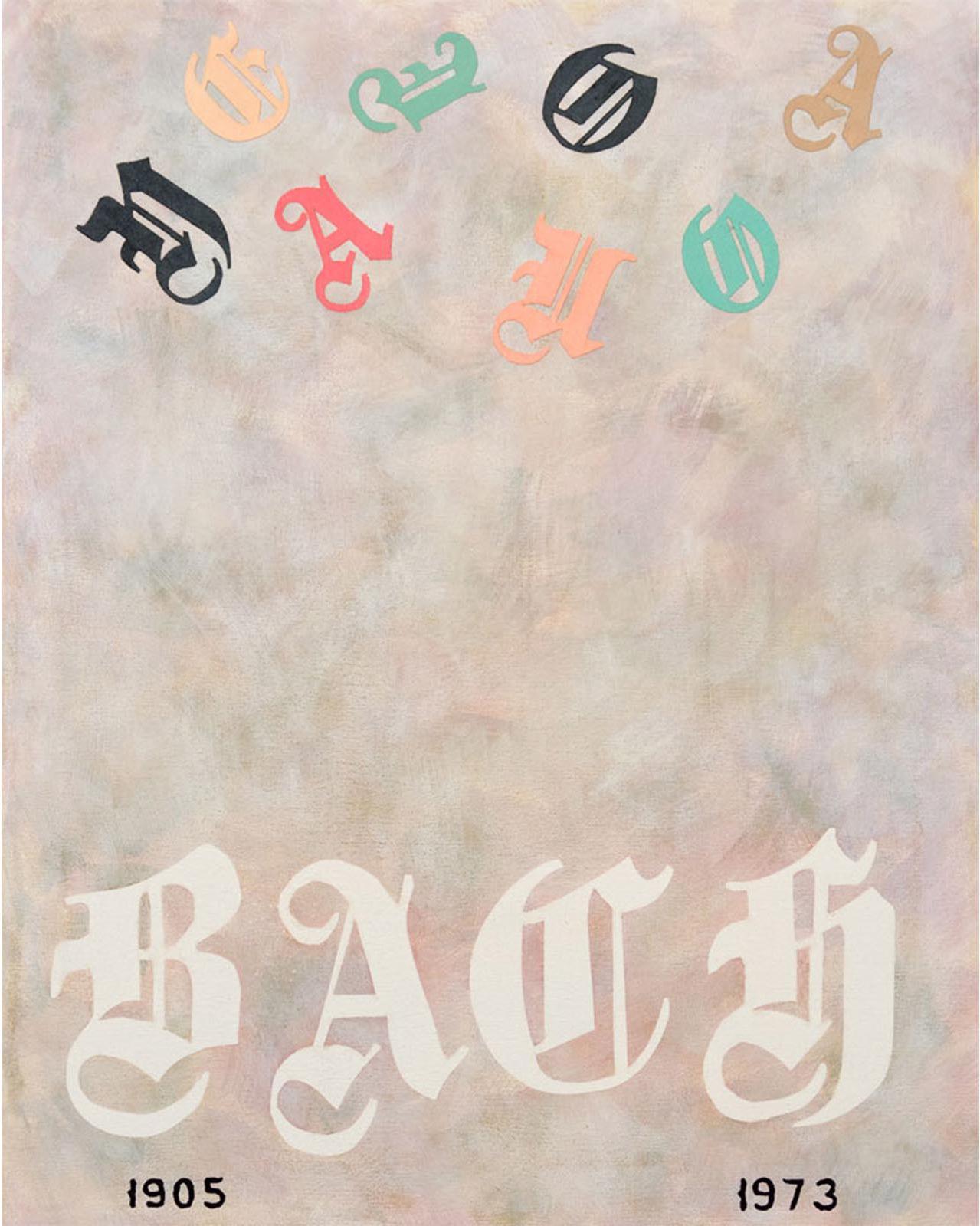 Staccato musical notes, names of canonized composers, floating vowels and letters of the English alphabet appear. Their consonant sounds stimulate the spatial relationships of figure to ground, ground to geometric overlay and cognitive perception. Clues to his influences are playfully encoded; the clarity and line of Poussin, late Cezanne, the erotic portraits of Pierre Klossowski, Bataille’s ‘Story of the Eye’, J.S. Bach.