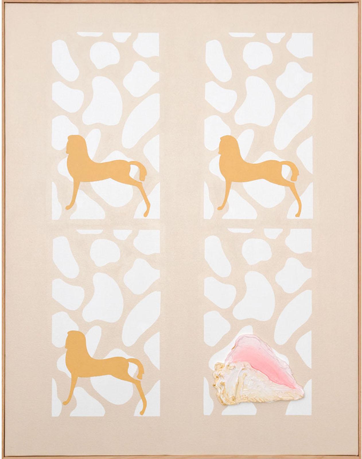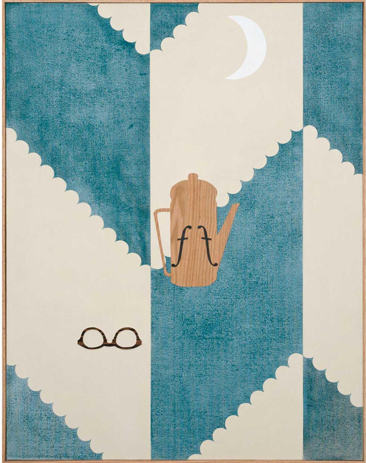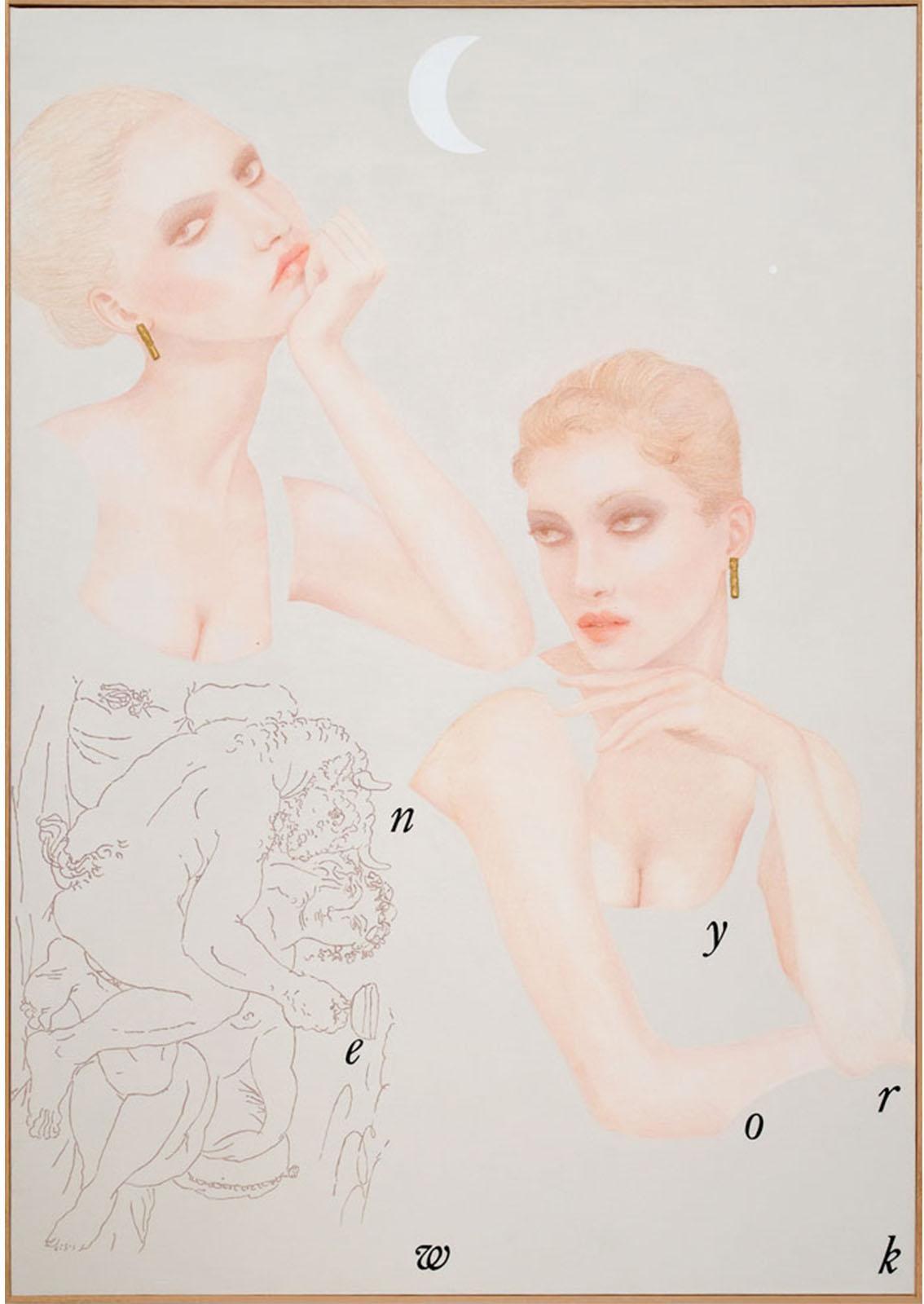 Staccato musical notes, names of canonized composers, floating vowels and letters of the English alphabet appear. Their consonant sounds stimulate the spatial relationships of figure to ground, ground to geometric overlay and cognitive perception. Clues to his influences are playfully encoded; the clarity and line of Poussin, late Cezanne, the erotic portraits of Pierre Klossowski, Bataille’s ‘Story of the Eye’, J.S. Bach.