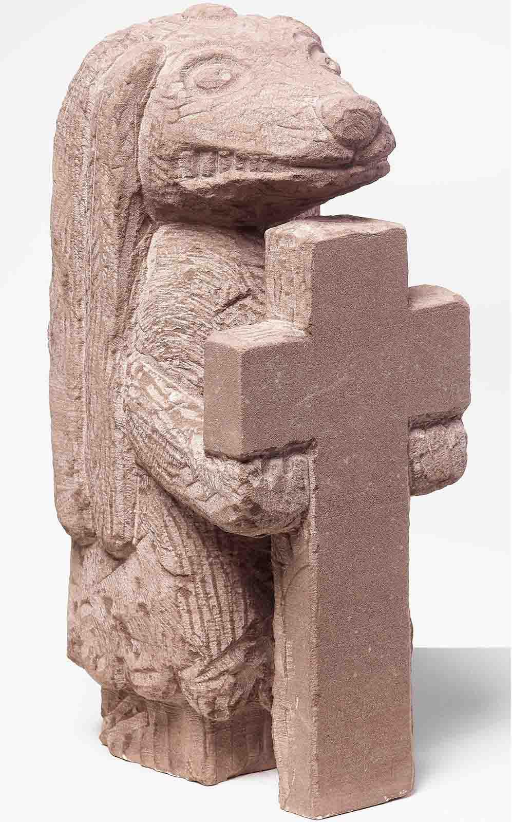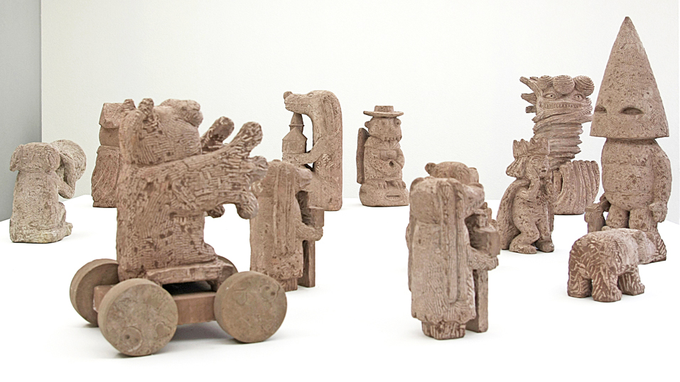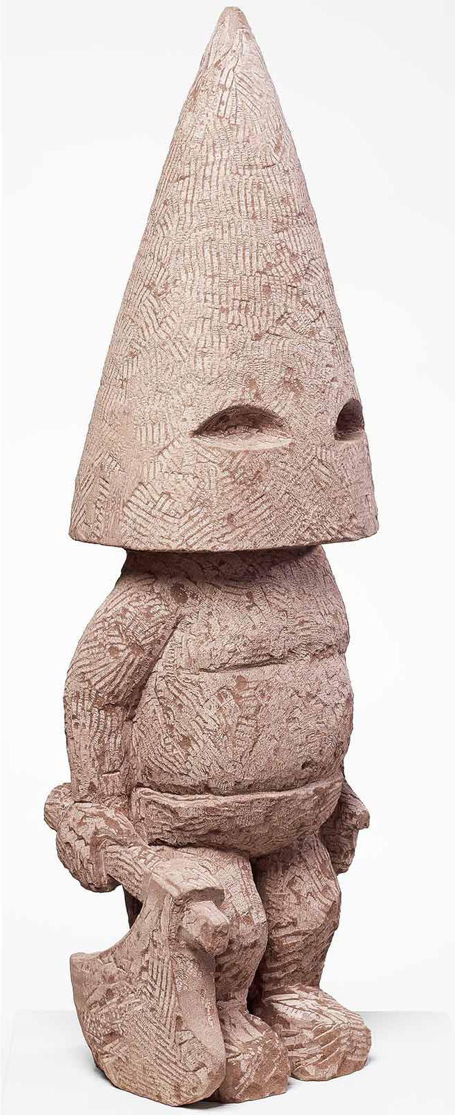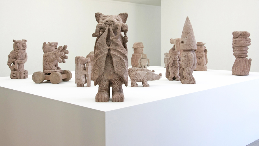 For the exhibition Rinck presents a series of sculptures carved from sandstone, a material used in Gothic cathedrals. These forms are ironic, sometimes kitsch conceptions of seemingly antique representations with the overarching theme ‘From Ovation to Resignation- From Emperor to Dwarf’. The menagerie of comically chimerical creatures ranges from serpents, snakes, demons, and owls, to noble personages, even pin-up girls. They have titles such as Napoleon Owl, The Storm, The frightened King, Agitator Owl, The Executioner, Leviathan, Inquisitor, Crusader, The Vampire and Ichneumon. These monstrosities allude to the dissolution of Western empire’s past and present with its propaganda, agitation, proletarian utopias, and austerity. Installed on an enormous low pedestal they are protagonists of derision and doubt that mock the ceremonial pomposity of today’s power brokers. Surrounded by dubious court jesters, the diminished kings of the world are reduced into frightened dwarfs.