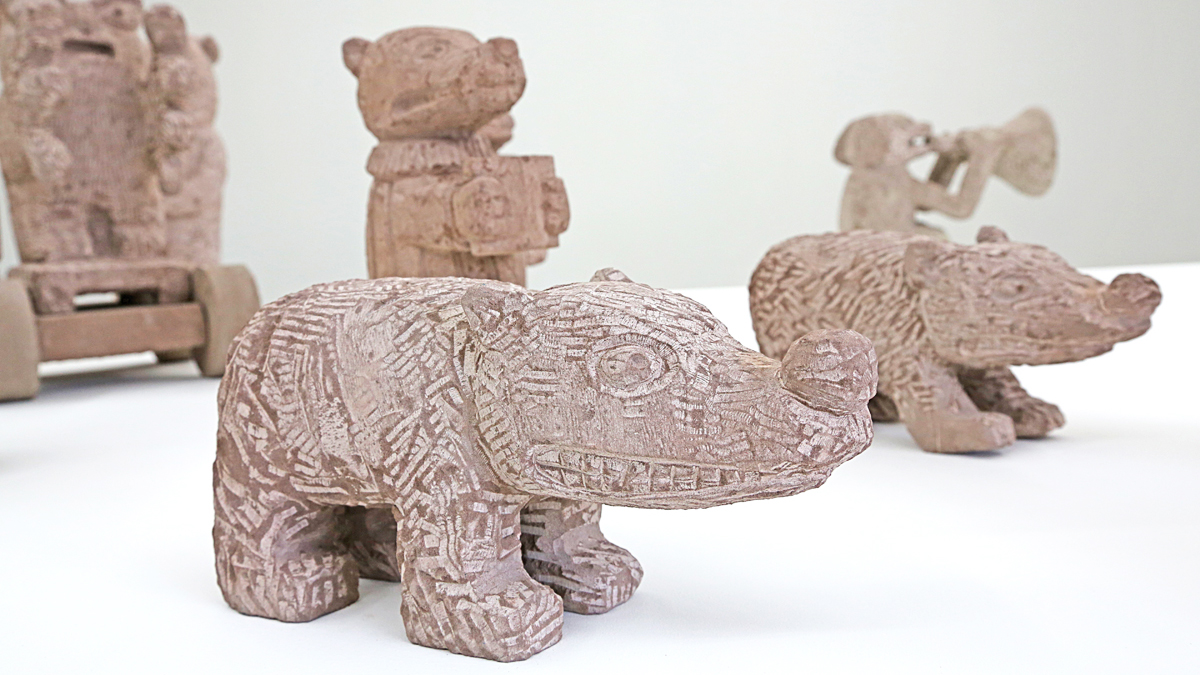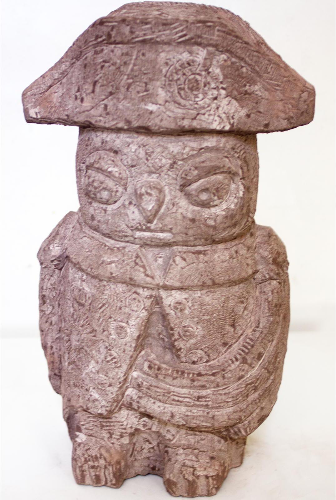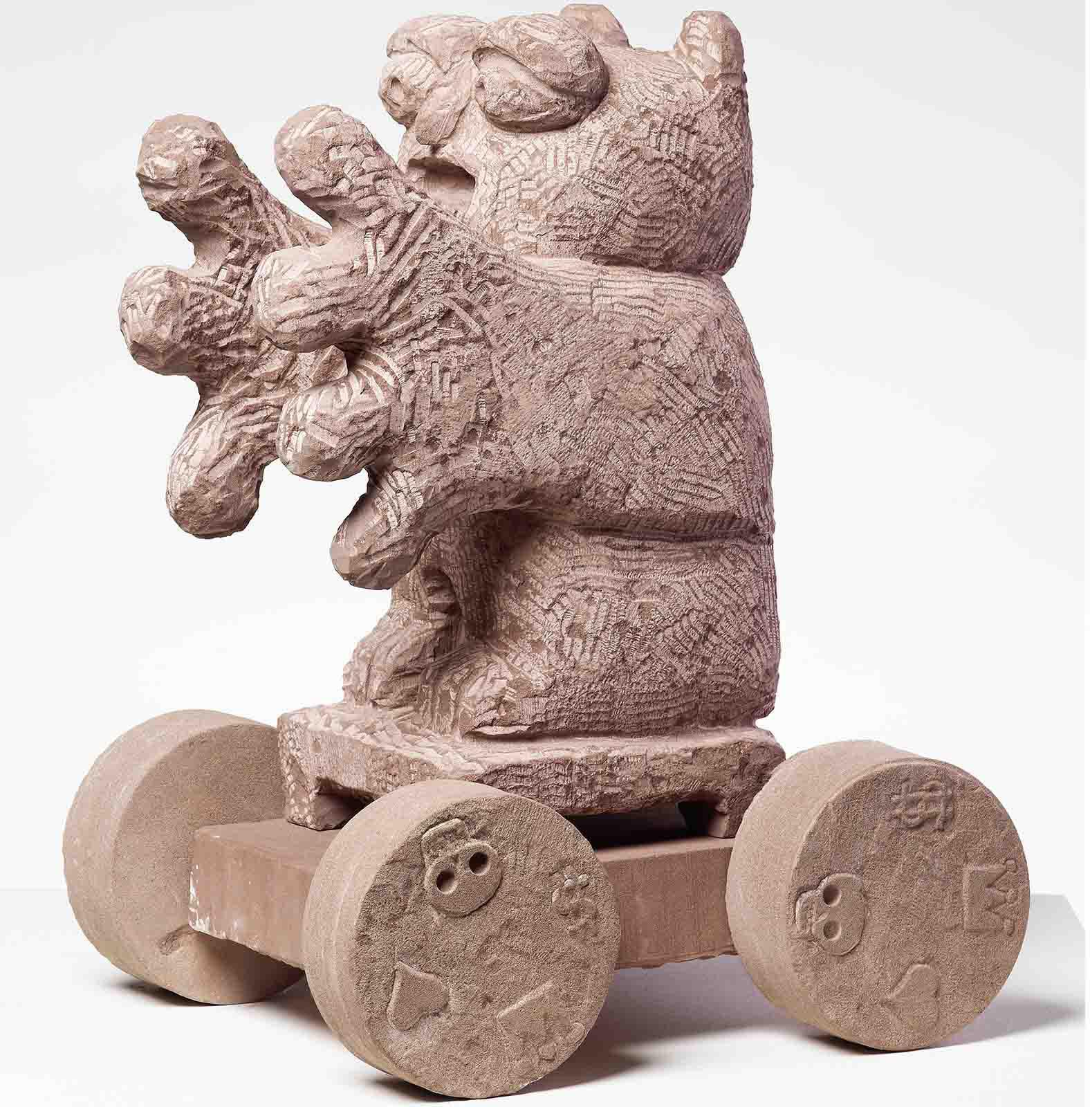For the exhibition Rinck presents a series of sculptures carved from sandstone, a material used in Gothic cathedrals. These forms are ironic, sometimes kitsch conceptions of seemingly antique representations with the overarching theme ‘From Ovation to Resignation- From Emperor to Dwarf’. The menagerie of comically chimerical creatures ranges from serpents, snakes, demons, and owls, to noble personages, even pin-up girls. They have titles such as Napoleon Owl, The Storm, The frightened King, Agitator Owl, The Executioner, Leviathan, Inquisitor, Crusader, The Vampire and Ichneumon. These monstrosities allude to the dissolution of Western empire’s past and present with its propaganda, agitation, proletarian utopias, and austerity. Installed on an enormous low pedestal they are protagonists of derision and doubt that mock the ceremonial pomposity of today’s power brokers. Surrounded by dubious court jesters, the diminished kings of the world are reduced into frightened dwarfs.