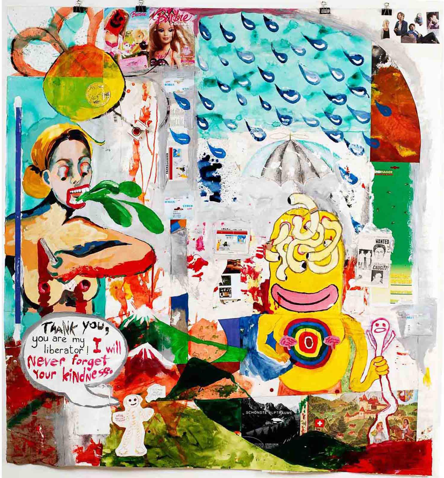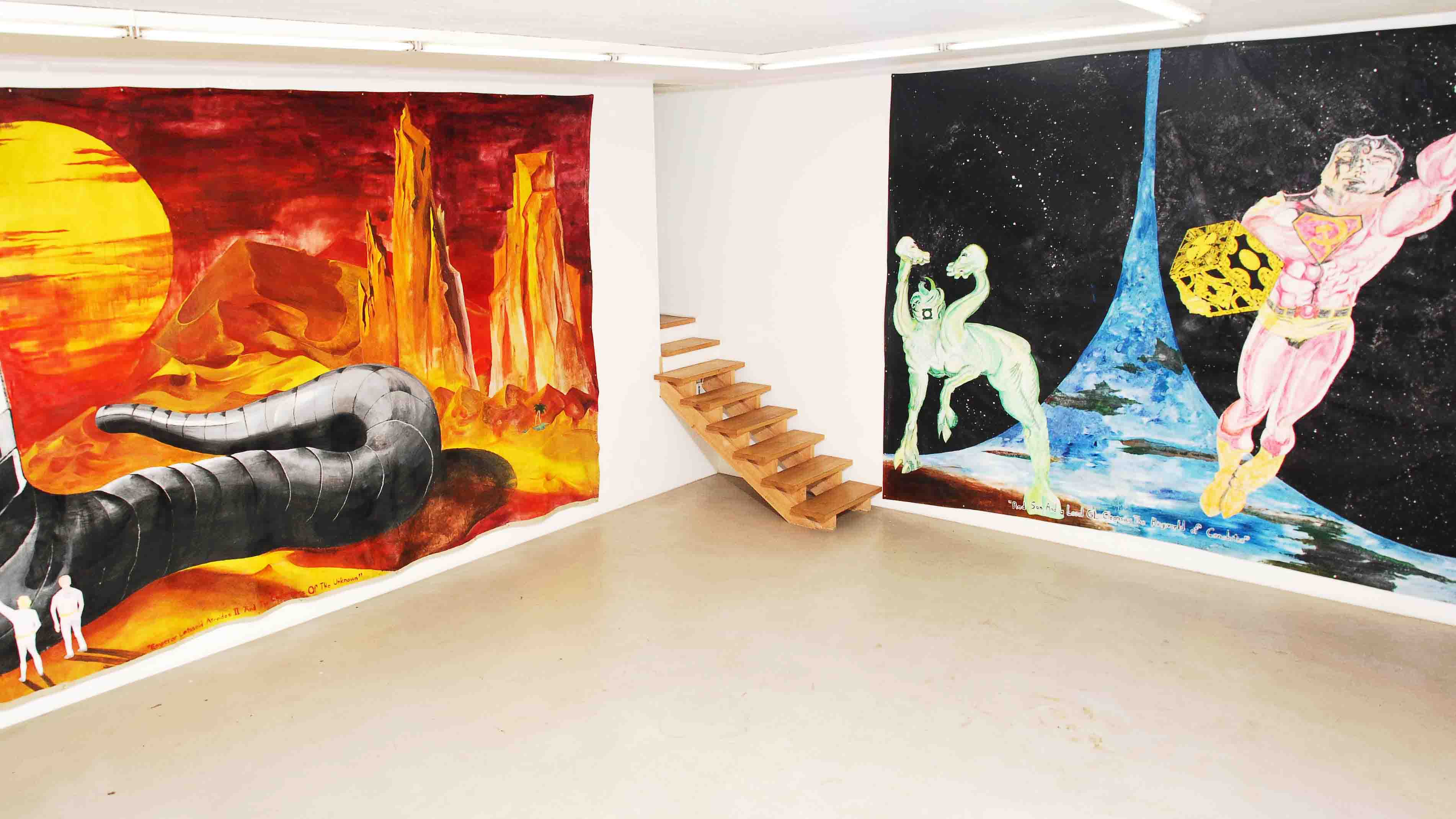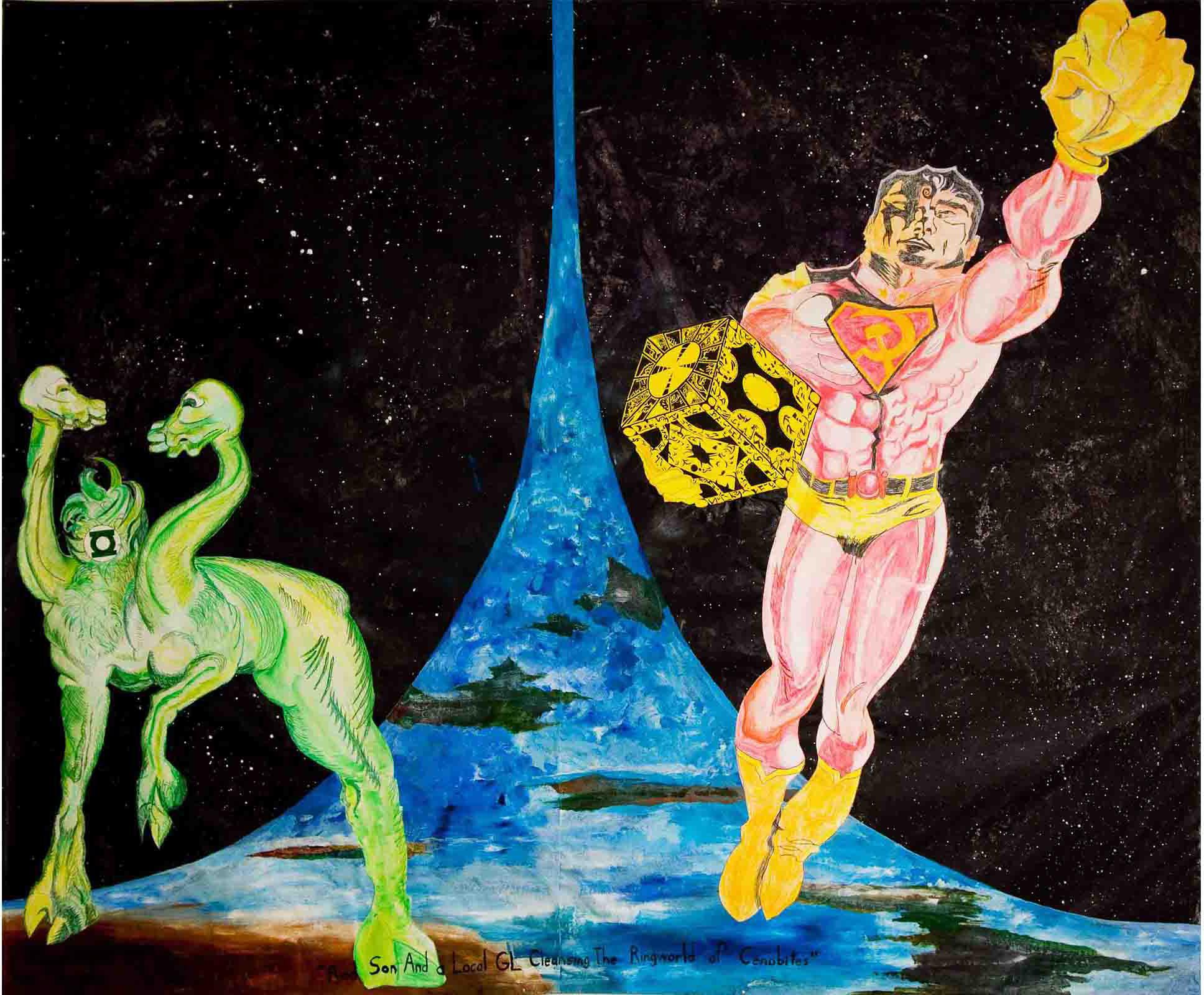This illusionism seemed to be in the service of creating a believable fantasy of outer space travel. The dilapidated spaceship, the glimmering textured surface of the painting that represented the stars, the drama of the spaceship’s pose, etc. It struck me that there is a warped logic in placing an illusionistic fantasy in a context where the unspoken rule is one of an object’s own self recognition. The classic example would be a painting that is highly aware of its own existence and status as an object, with the attendant Greenbergian truth to materials. What could be more perverse in regards to this rule than a completely illusionistic scene painting, a window into an imaginary fantasy world? And so I decided to create the two giant ‘Fan Paintings’ for this show in Gstaad. known as Dune. The second, Red Son of the Scrith, is set in Larry Niven’s Ringworld and combines an already hypothetical version of Superman as a Communist hero with Niven’s famous alien, the Peirson’s Puppeteer envisioned as a member of the Green Lantern Corp.