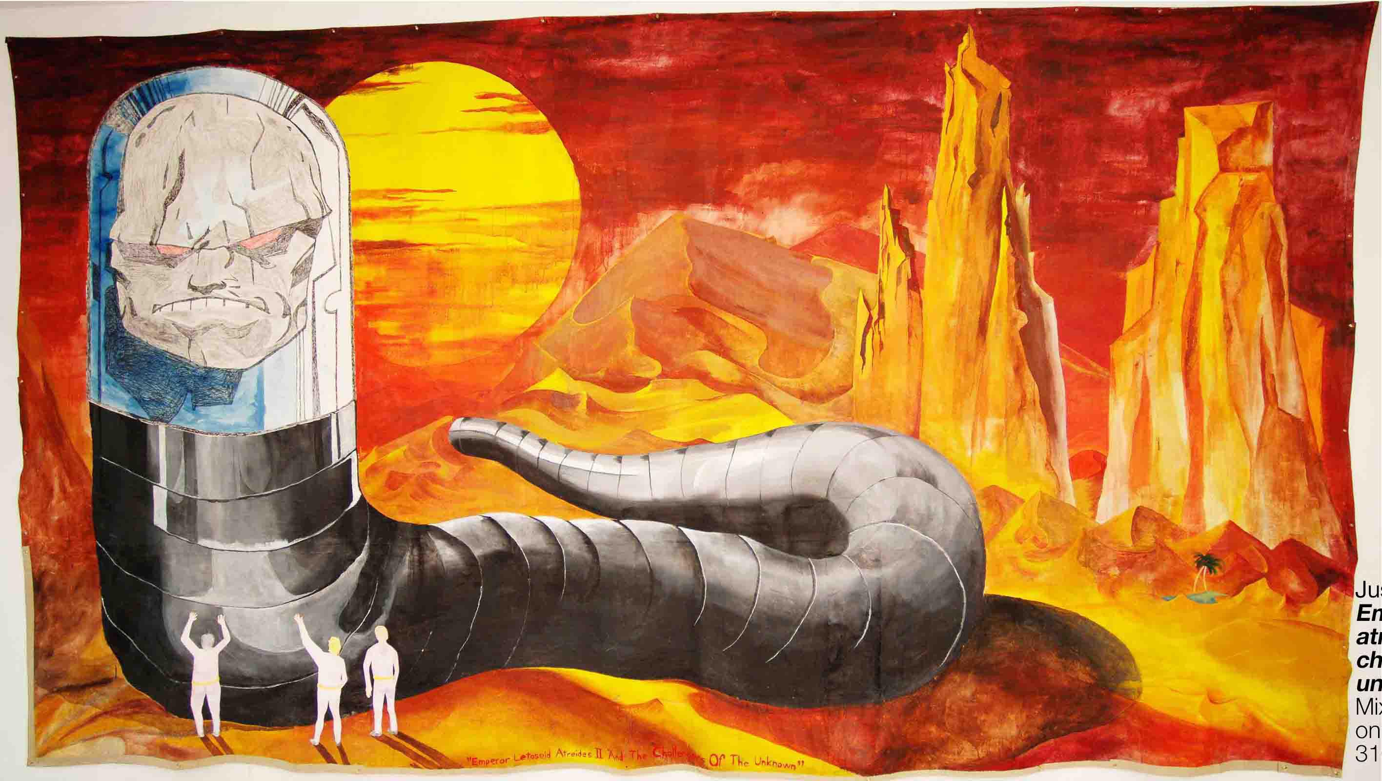 I have returned to the notion of fan art several times over but never in so explicit a form as these two paintings. The first, Emperor Letoseid Atreides II and the Challengers of the Unknown, posits a combination of two characters from science fiction : Darkseid, arch nemesis of Superman, and Duke Leto Atreides II, God Emperor of Arrakis, also Fan fiction as a rule has a very narrow audience, and rarely aspires to a larger one.