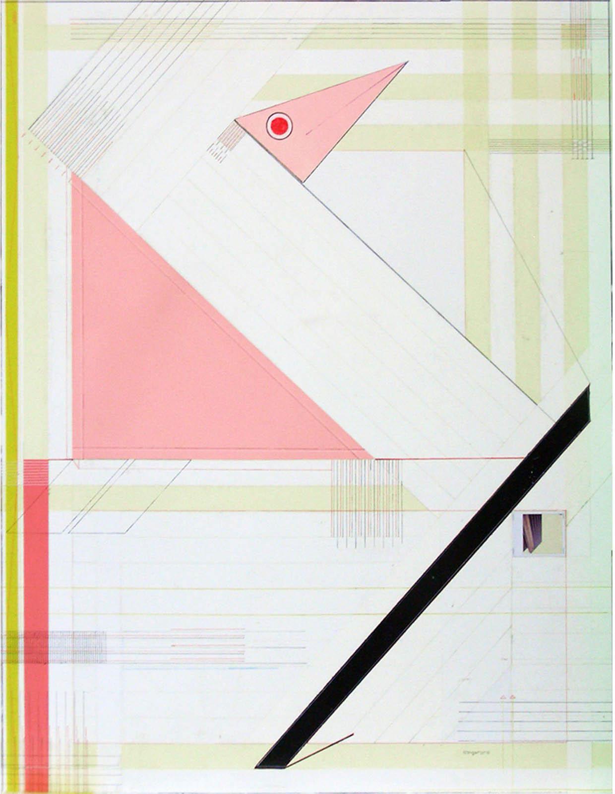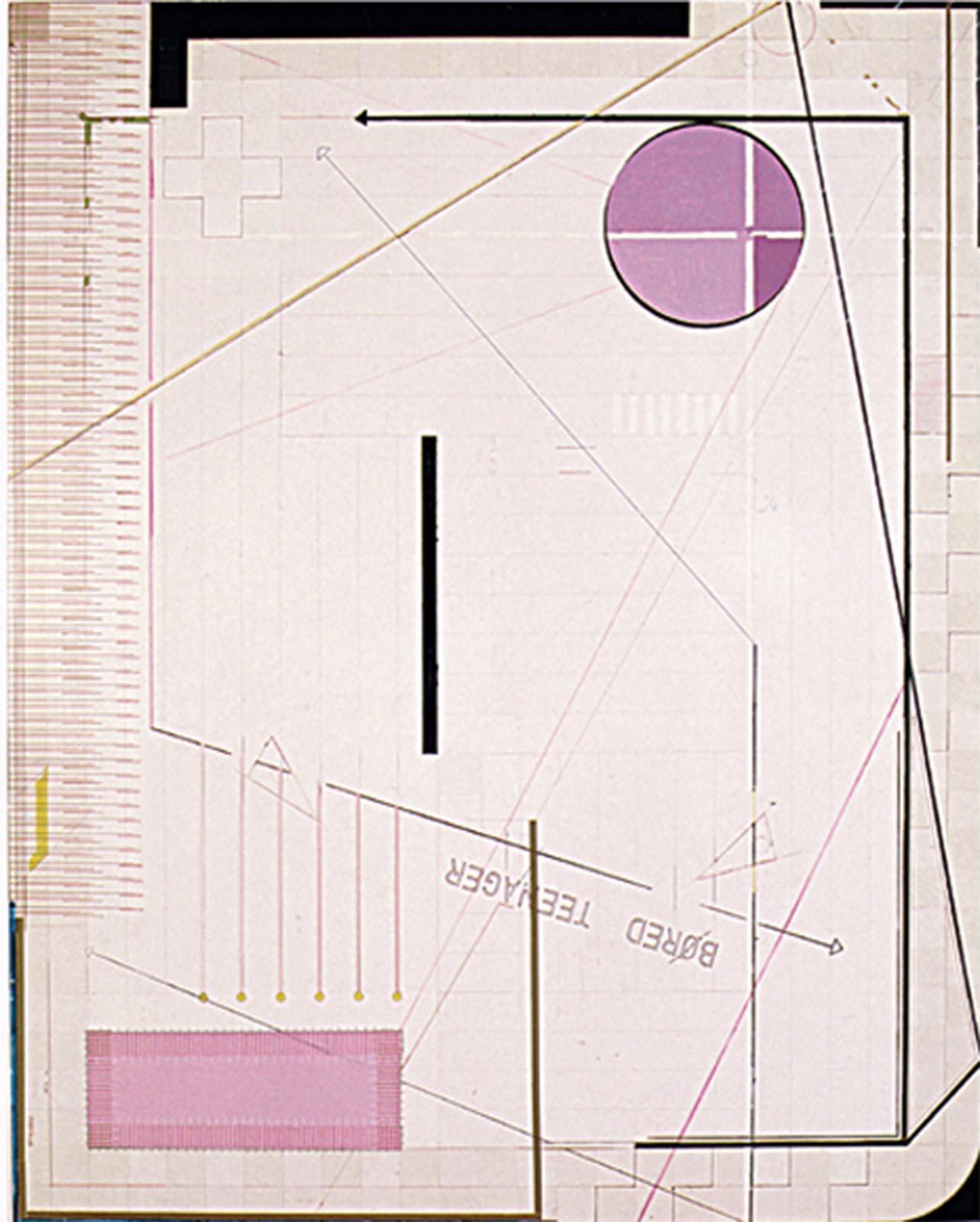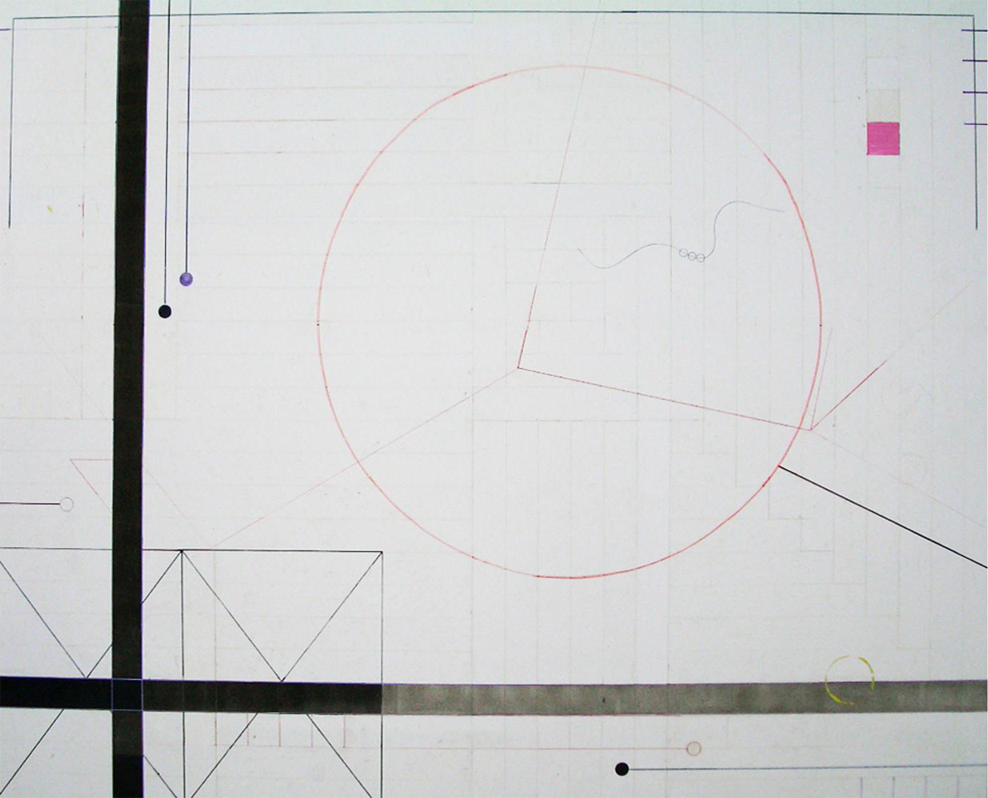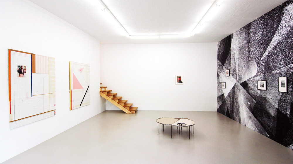 Markus Amm (b. 1969) lives and works in London. Amm works in a variety of media including painting, collages, sculpture and photographic works. The works on display in the exhibition Finding Neverland form a wall installation consisting of three large painted, collaged and drawn geometric abstract pictures in combination with black and white luminograms that trace a clear lineage to the early 20th Century Modernism. Moholy-Nagy has been the inventor of the lumino- or photograms, the direct exposure of a photosensitive film to light without camera. Amm has been obviously inspired by this technique as well as by the meticulous composed abstractions by Moholy-Nagy and his Bauhaus-colleagues that he now fills with a fresh timeliness. His approach may be conceptual, but it is not strategic in the sense of a masterful intellectual exercise. In his work, the core composition is the result of elementary shapes such as circles, triangles and rectangles, intertwined with parallel and crossing lines, which in turn fragment and splinter these very shapes. Interesting though how he plays off abstraction and figuration against each other, as most of the abstract shapes seem so familiar to the viewer’s eye that they tend to become figurative.