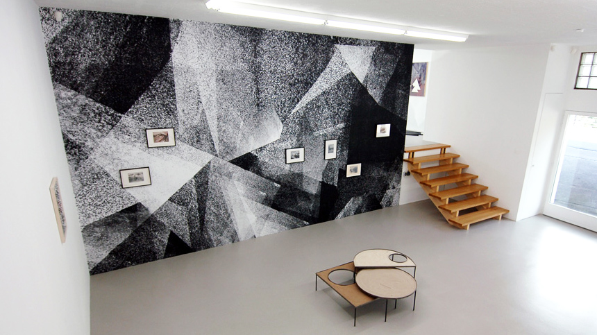 Claudia Wieser (b.1973) lives and works in Berlin. As most of the other artists in this group-show Claudia Wieser uses on purpose trashy, poor or even found materials for the production of her installations, pictures and drawings. She invents and constructs spaces as scenes where utopia and reality can meet. Here she installs two site-specific installations that are representative of her oeuvre: on the one hand a wall installation made of mirror fragments which are build up to a crystalline structure; on the other, a large, nevertheless delicate, black and white collage consisting of numerous photocopies brought on to the wall. The reference of the mirror as crystal derives from a central motif of inspiration in the art and architecture of the Early Twenties and the concern about the loss of utopia. Through her work Wieser crosses the boundaries towards applied arts and plays with the holistic idea of former modernistic times where life and art formed an entity.