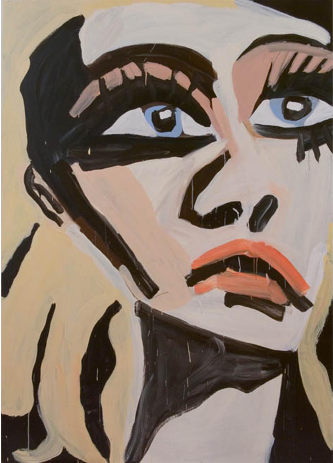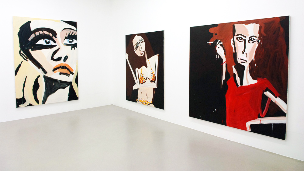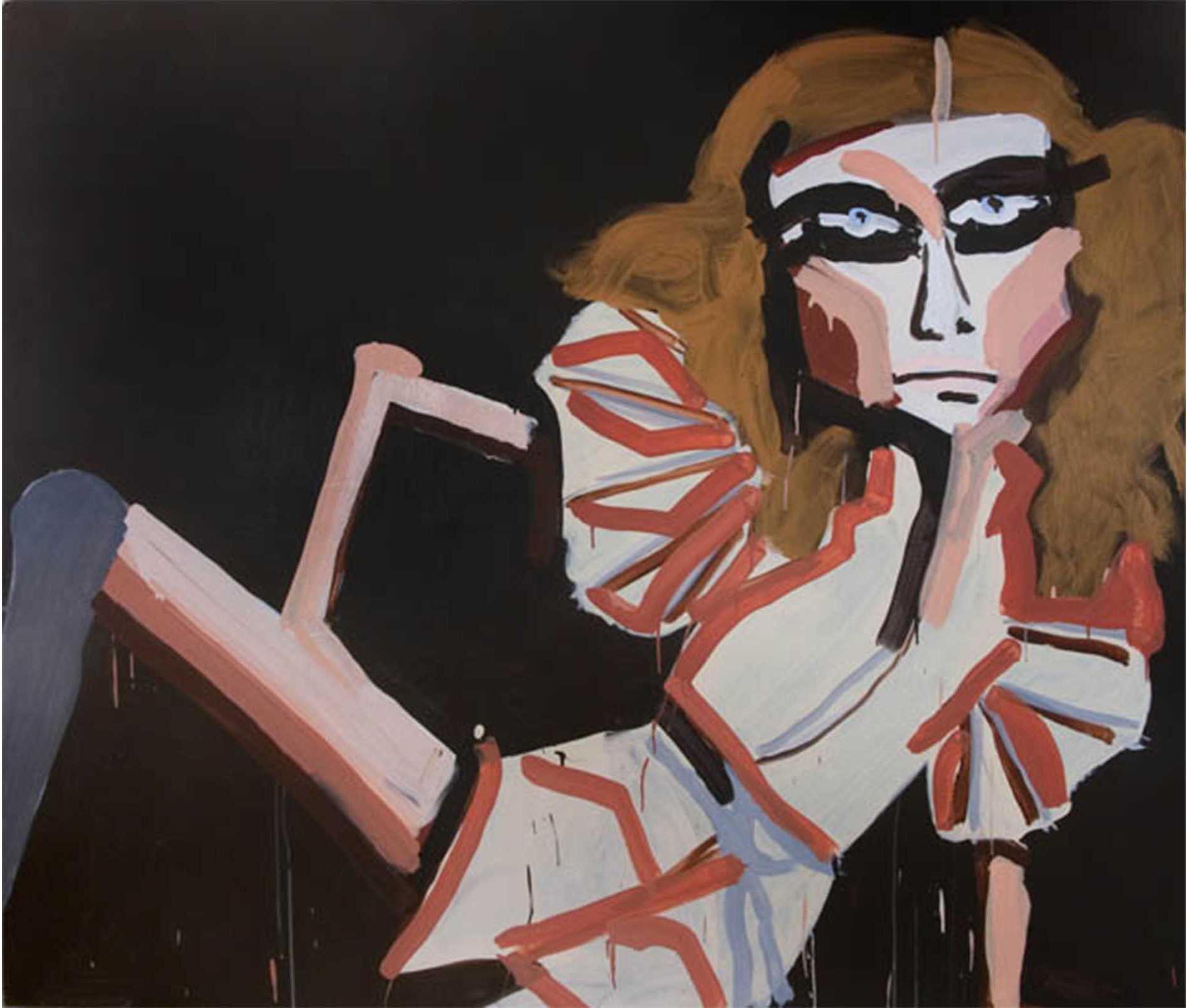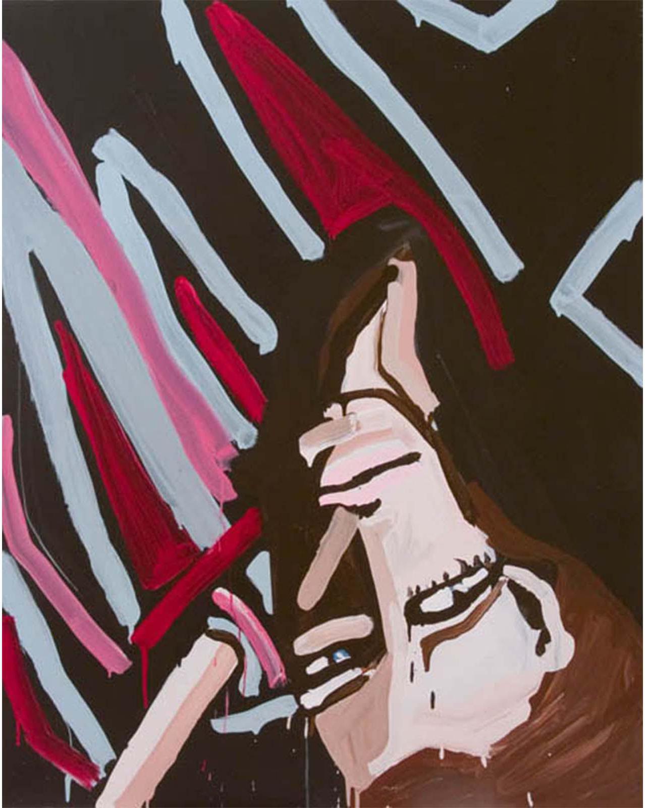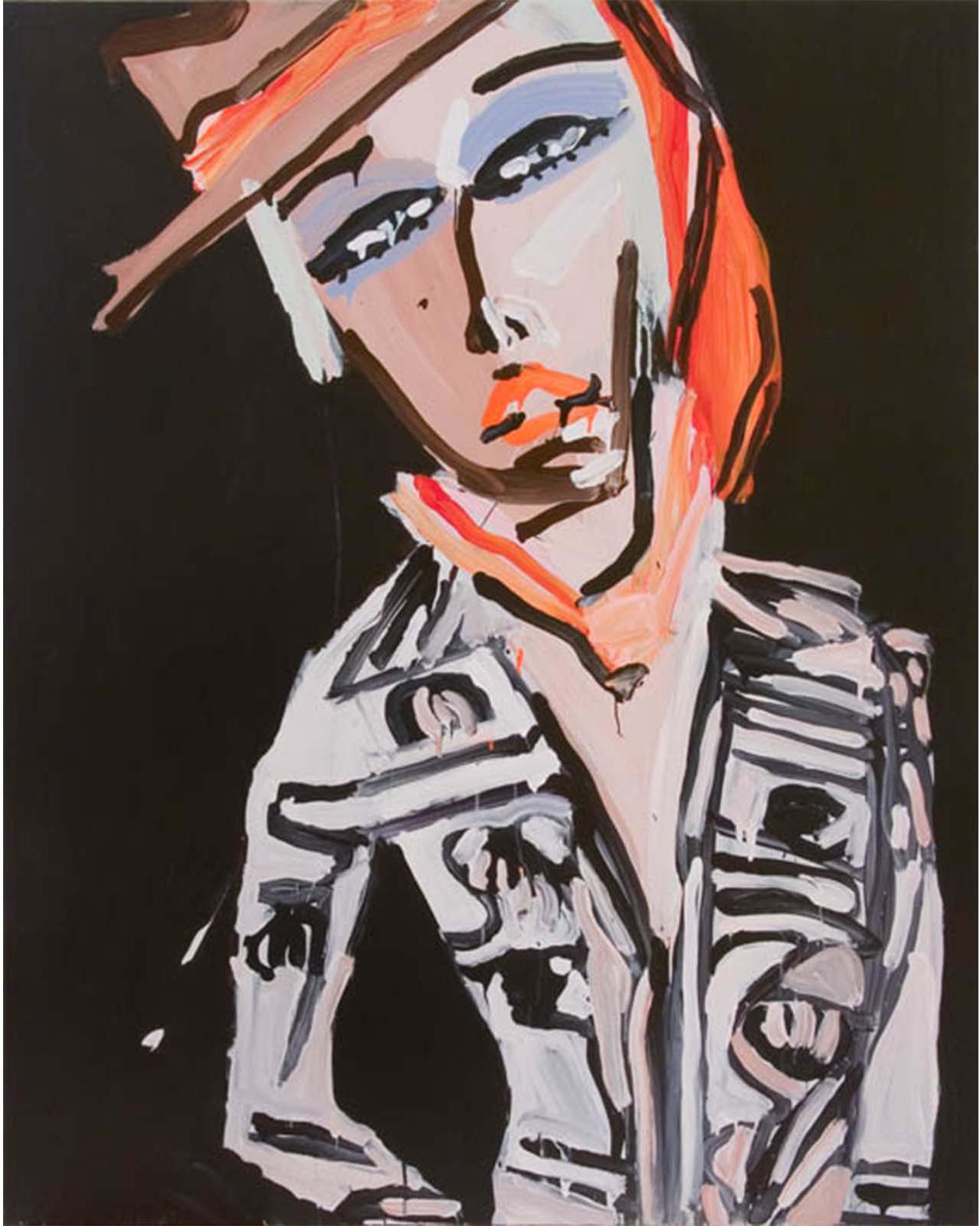 Approaching painting as a platform for fiction, Bernhardt’s imagined characters are richly contrived portraits encapsulating both the vacuity of media image and the unpredictable response of consumer over-identification. Rendered with the fury of both adulation and envy, Bernhardt’s models emerge as freakish inventions – all Max Factor raccoon eyes, emaciated limbs, and swollen red pouts; troubled beauties relishing both idolisation and abuse.