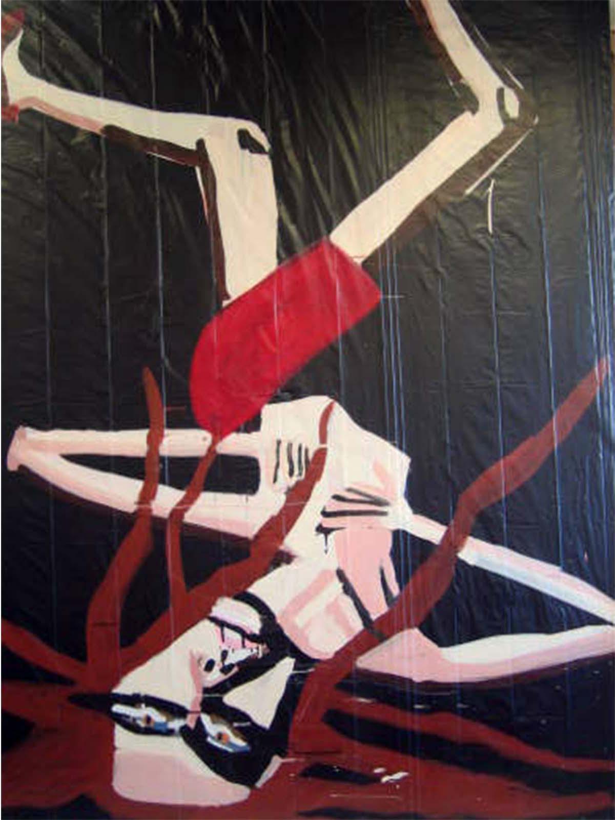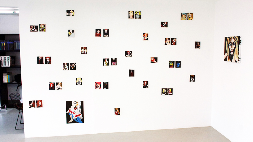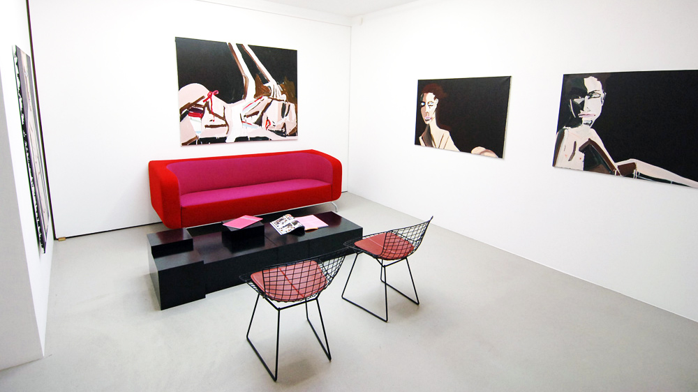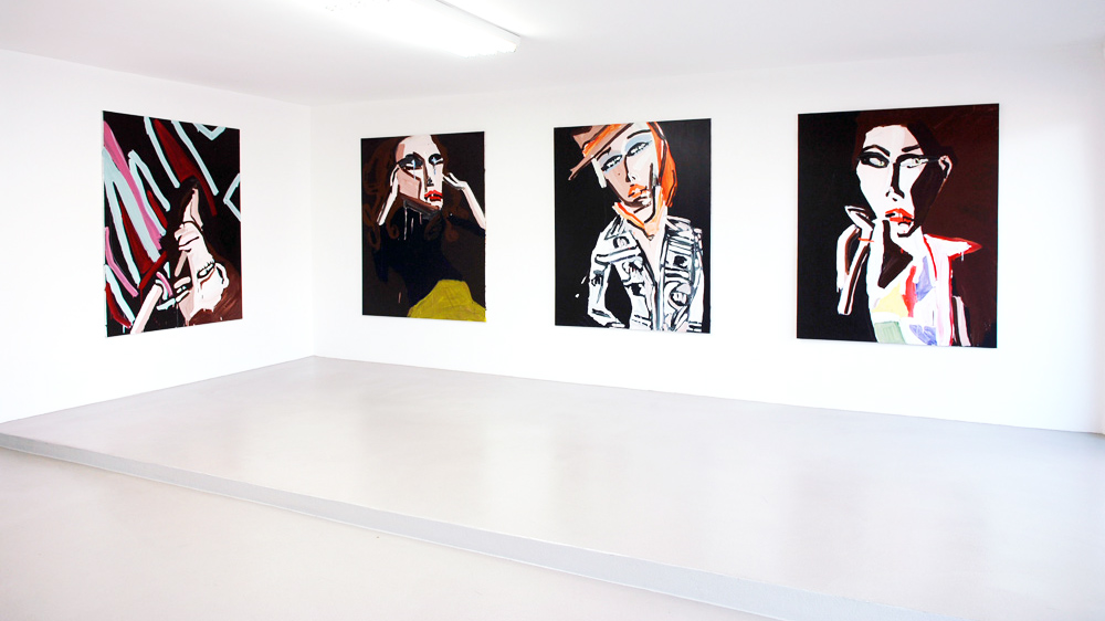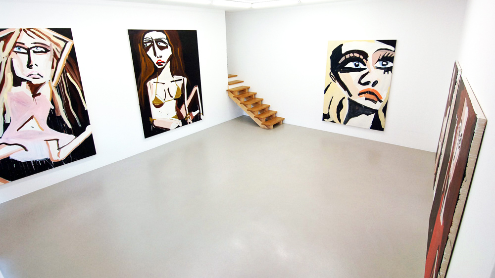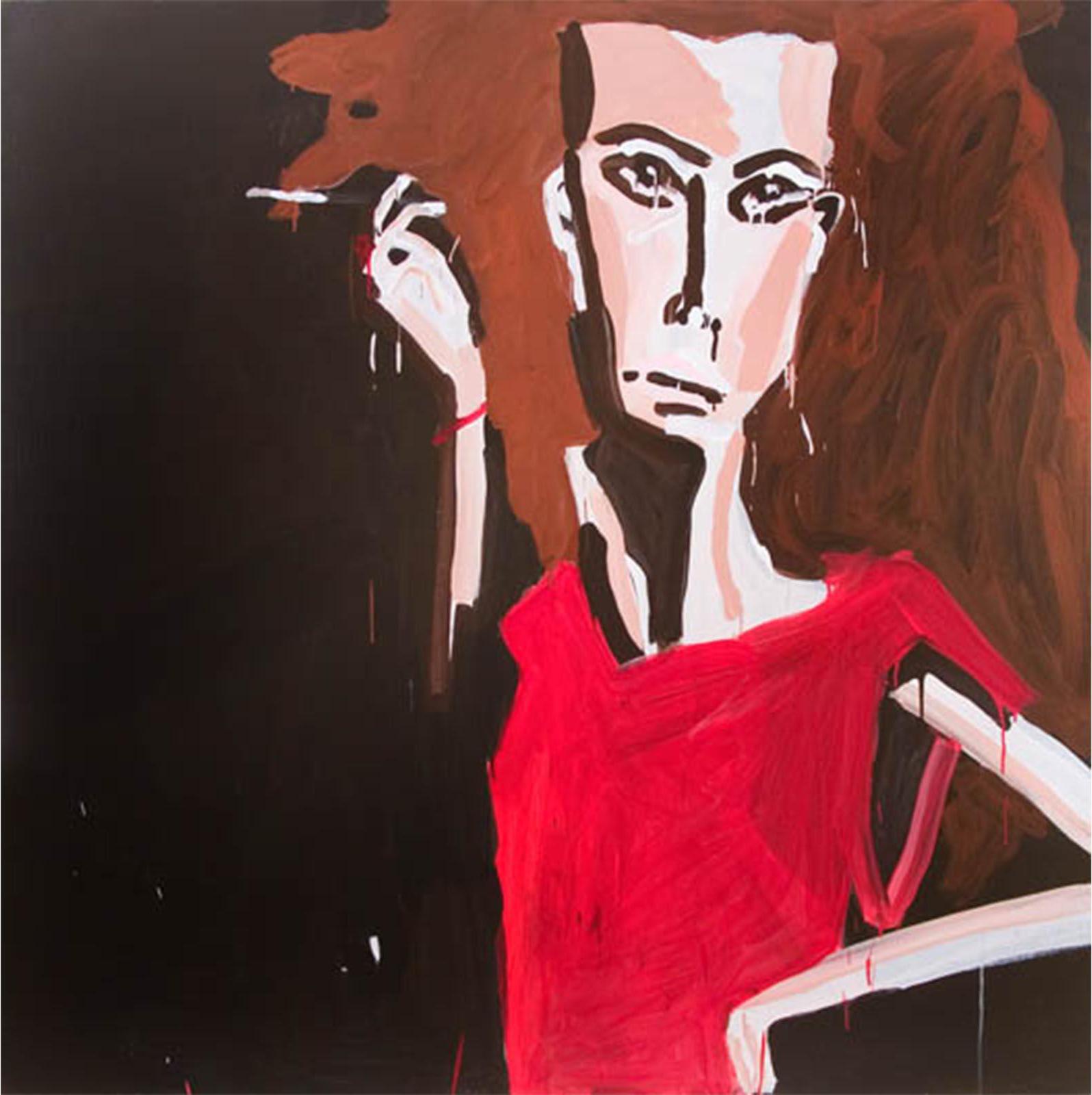 Approaching painting as a platform for fiction, Bernhardt’s imagined characters are richly contrived portraits encapsulating both the vacuity of media image and the unpredictable response of consumer over-identification. Rendered with the fury of both adulation and envy, Bernhardt’s models emerge as freakish inventions – all Max Factor raccoon eyes, emaciated limbs, and swollen red pouts; troubled beauties relishing both idolisation and abuse.