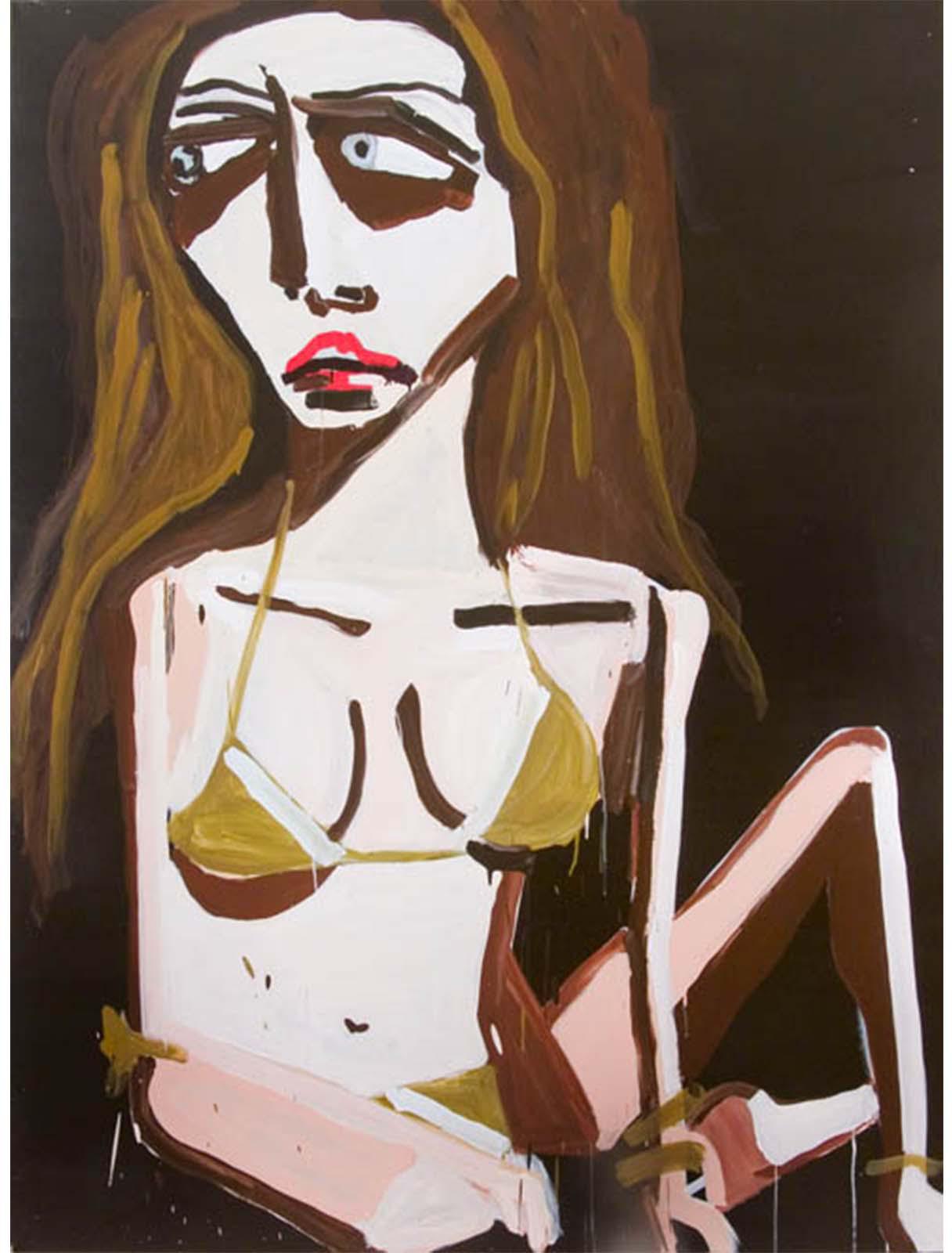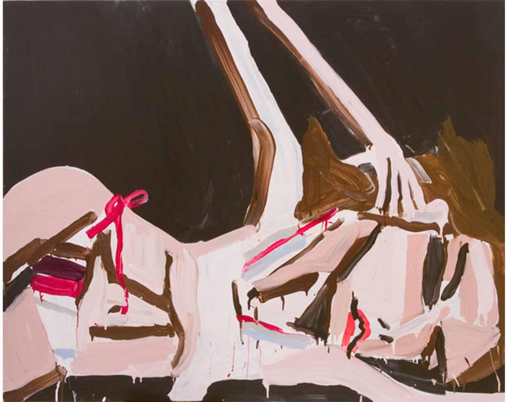 Far from illustrating wry caricature, Bernhardt’s wildly expressive style illuminates her own complicit role as spell-bound fan. Her paintings are executed with rarefied passion, conveying urgency, obsession, and a desire to emulate through the act of making. Her engagement with beauty is funny, clumsy, and endearingly humiliating. ‘Getting it right’ fashion dissolves into planes of illusive abstraction as designer bikinis transform into ill-fitting triangles, eye-shadow hovers as lurid circles, and pink terrains of skin drip with melting suggestion of fake tan or plastic surgery rumour. Through her casual formalism, Bernhardt uncovers the true secrets of attraction: a beauty that lies in the pureness of sentiment and basic instinct aesthetic, packaged with the uptown savvy of raw ambition.