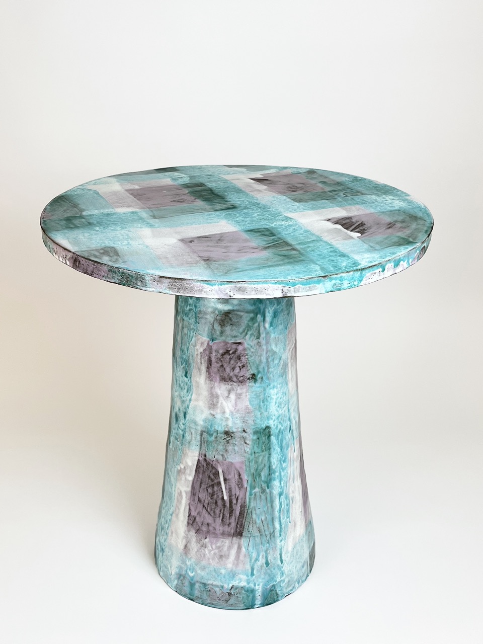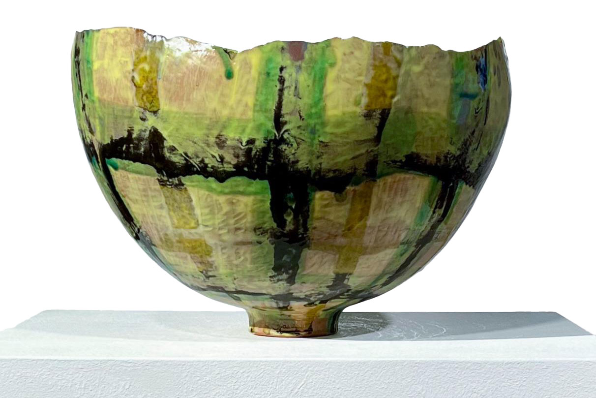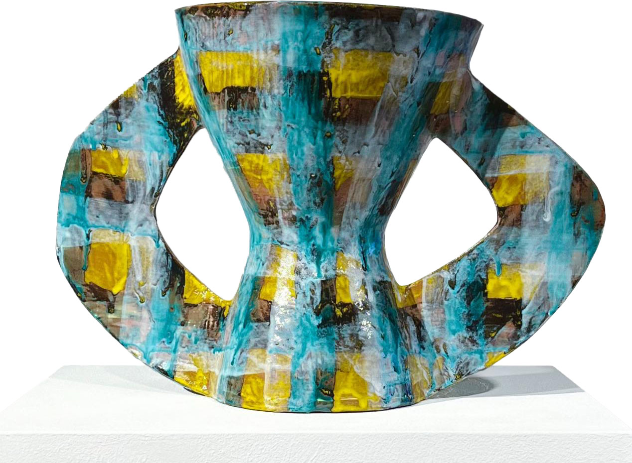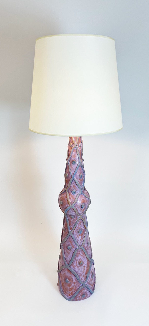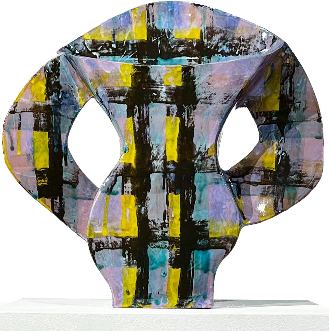 In Alice Gavalet’s ceramics, as well as in her guéridons (tables) and lamps, the line between utility and art dissolves. Her vibrant, playful vessels and bowls—shaped from large slabs of clay and adorned with intricate, geometric patterns—transcend their function as mere objects. These pieces, often anthropomorphic and distorting traditional forms, invite us into a space where the familiar collides with the unknown. The colorful patterns, which evoke tartan fabric and architectural grids, suggest a world both structured and free flowing. The fluidity of her ceramic pieces—deformed, twisted, and reimagined—becomes a metaphor for how we carry the weight of memory, desire, and longing. Each form is a fragment of something lost or forgotten, a quiet rebellion against the idea of completion or perfection.