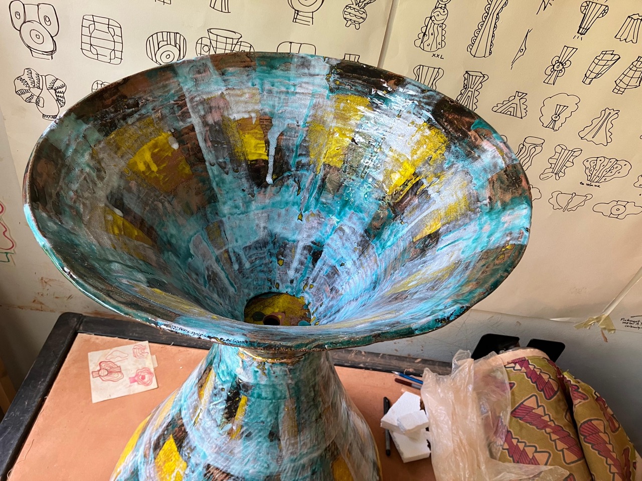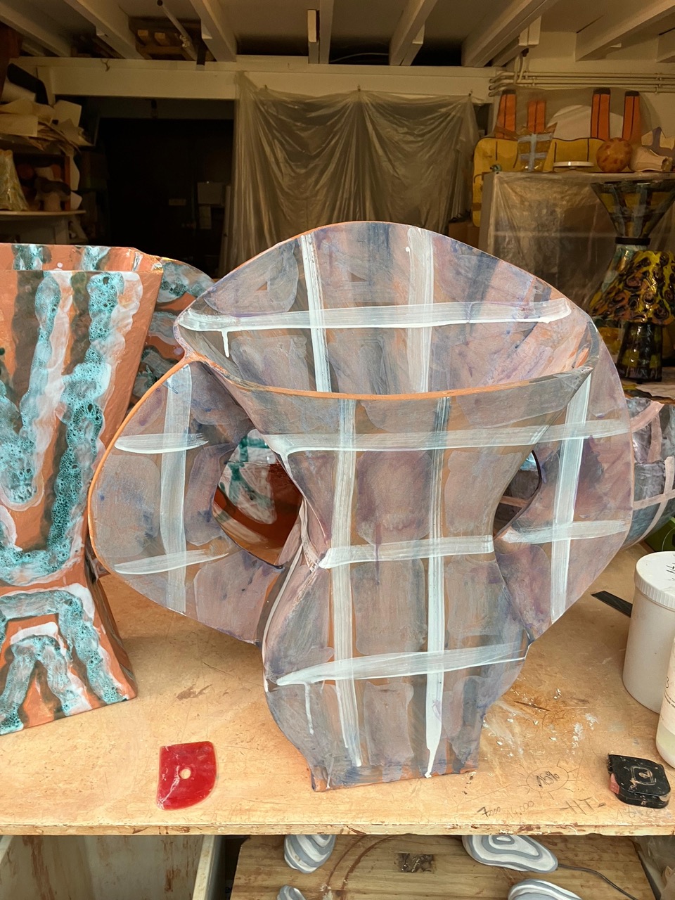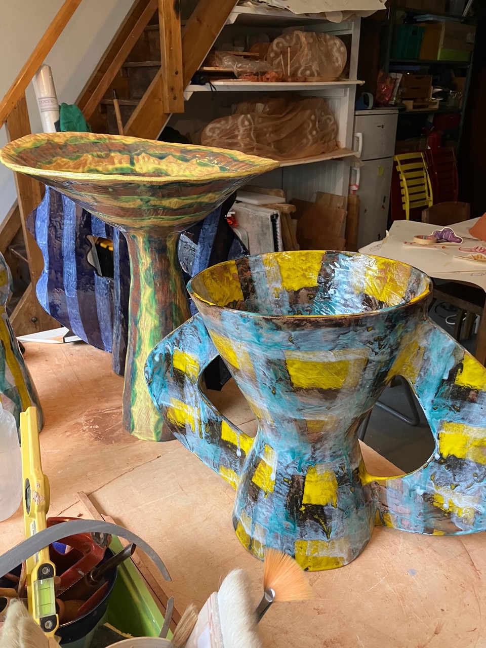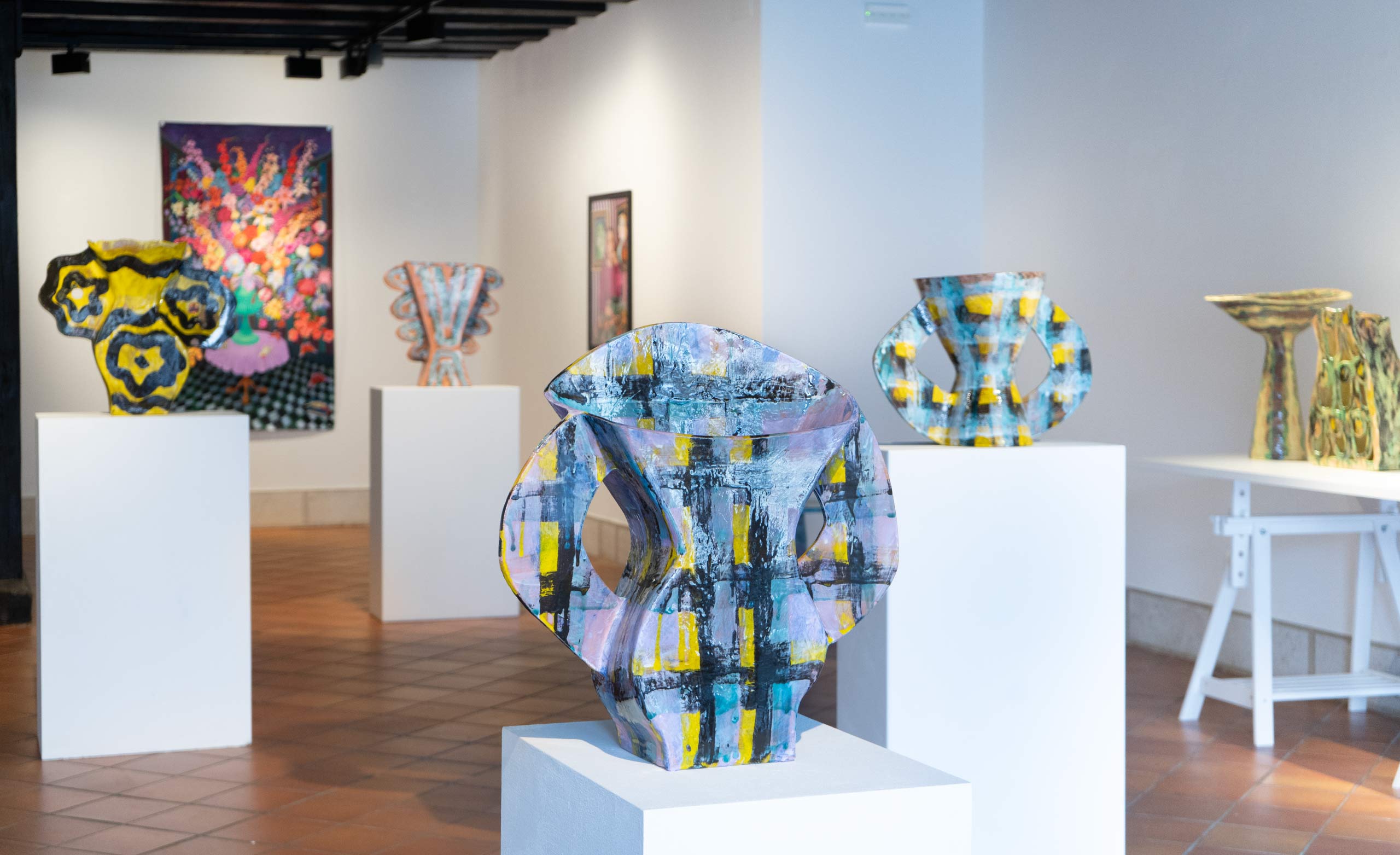 In Alice Gavalet’s ceramics, as well as in her guéridons (tables) and lamps, the line between utility and art dissolves. Her vibrant, playful vessels and bowls—shaped from large slabs of clay and adorned with intricate, geometric patterns—transcend their function as mere objects. These pieces, often anthropomorphic and distorting traditional forms, invite us into a space where the familiar collides with the unknown. The colorful patterns, which evoke tartan fabric and architectural grids, suggest a world both structured and free flowing. The fluidity of her ceramic pieces—deformed, twisted, and reimagined—becomes a metaphor for how we carry the weight of memory, desire, and longing. Each form is a fragment of something lost or forgotten, a quiet rebellion against the idea of completion or perfection.