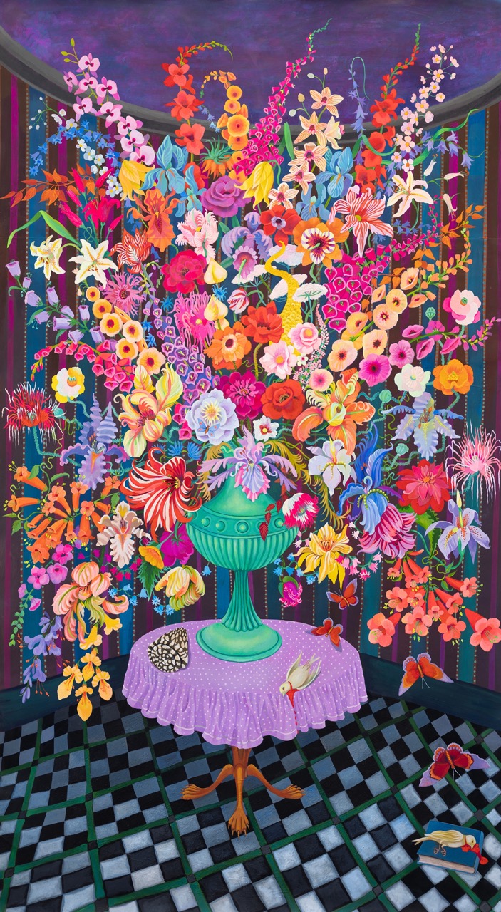 In Solfeggio Revisited (2024), Downie channels a similar sense of yearning through the visual metaphor of a floral still life. The exuberant flowers, reaching toward the ceiling from a small green vase, evoke an emotional tension between restraint and overflowing vitality. Their towering height invites contemplation of unfulfilled longing, while their natural beauty offers a quiet kind of solace. Surrounding the flowers are delicate butterflies fluttering in the space, which, along with two dead white doves, are key features of the painting. One dove lies on a book on the floor, its fragile body marred by blood running down its neck—a haunting and powerful symbol of mortality and fragility, evoking the vanitas tradition. The second dove rests on the table, its lifeless form drawing a stark contrast to the vibrancy of the surrounding flowers and butterflies, amplifying the tension between life and death, beauty, and decay. Additionally, a black-and-white shell, curled in a snail-like form, rests gently within the composition, adding an organic complexity to the scene. Its spiral shape echoes themes of cyclical time and the passage of life, further reinforcing the vanitas motif. The feet of the table, sculpted to resemble lion claws, introduce an element of strength and power, subtly contrasting with the delicate symbolism of the scene.