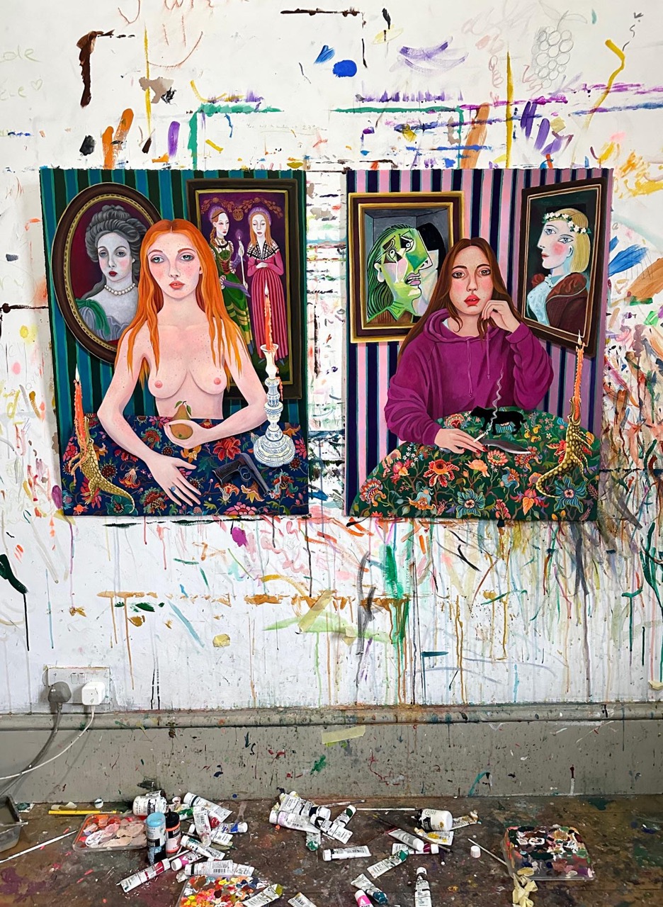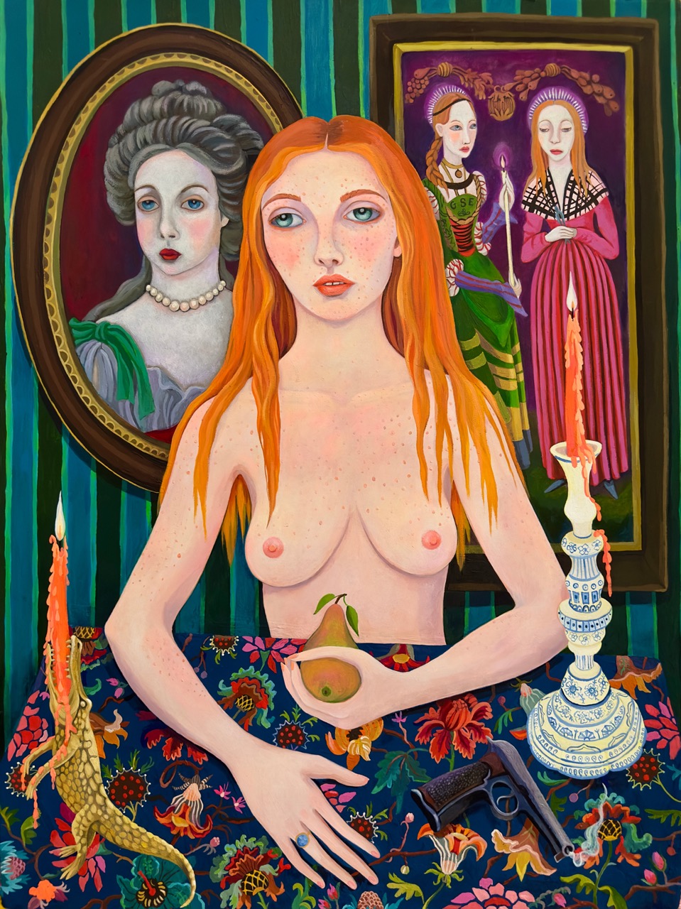 In Romantic Comedy (2024), a naked woman sits at a table holding a pear, her nakedness both vulnerable and defiant. She has long red hair, adding to the intensity of her presence. She is framed by portraits—one of a stately British lady dressed in period attire, and another depicting two young women in historic dresses, evoking a time long past. Surrounding the figure are symbolic objects, including a crocodile-shaped candle holder. This unusual object may symbolize the support for a personal process, possibly a way of grappling with old emotional topics. Resting on the table, there is also a revolver—its presence a subtle yet powerful reminder of the tension between beauty and violence, passivity, and agency.