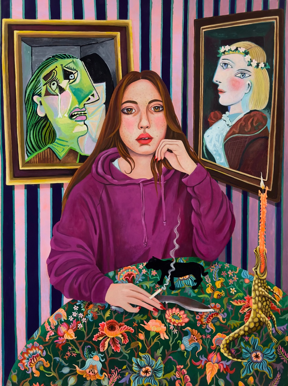 In The End of Salad Days (2024), a young woman in a lilac hoodie sits at a table, gazing inward. Behind her, two Picasso paintings add an additional layer of narrative, grounding the scene in art history while simultaneously distancing the figure from the past. The young woman’s presence, both contemporary and enigmatic, contrasts sharply with the distant, abstracted faces in the Picasso works, highlighting the tension between personal longing and historical distance. Resting on the table, right beneath her right hand, lies a knife—its presence both subtle and charged, a symbol of inner conflict or potential violence. Also on the table is a crocodile-shaped candleholder, reminiscent of its appearance in Romantic Comedy, perhaps representing a symbolic support for the woman’s process of confronting and processing old emotional wounds. The simple, flower-patterned tablecloth ties the scene to the everyday, while the quiet isolation of the figure suggests a deeper search for identity and meaning. Adding to the symbolism, a black panther’s presence looms within the space, silently watching over the scene—a symbol of power, instinct, and the untamed nature of the self.