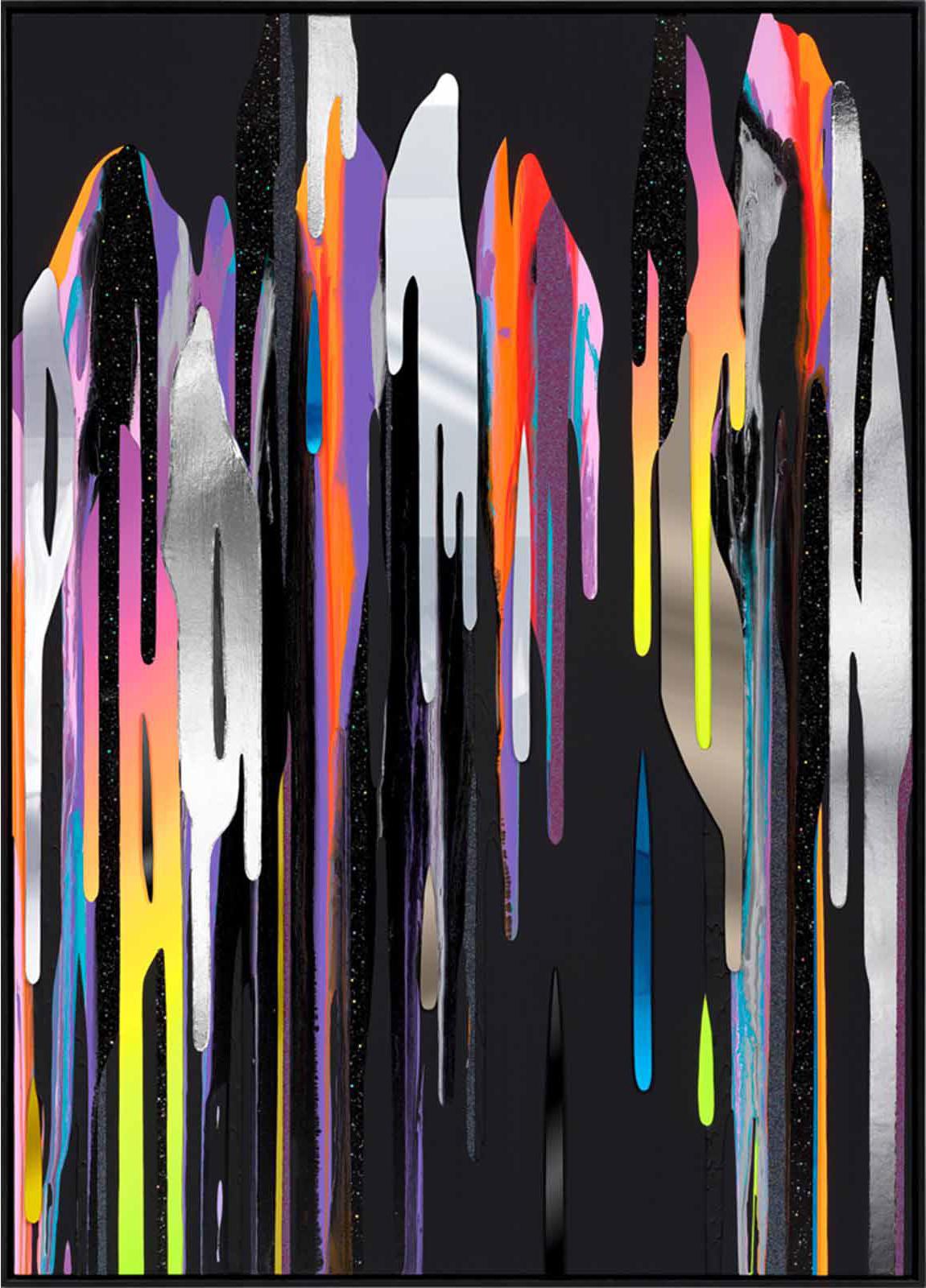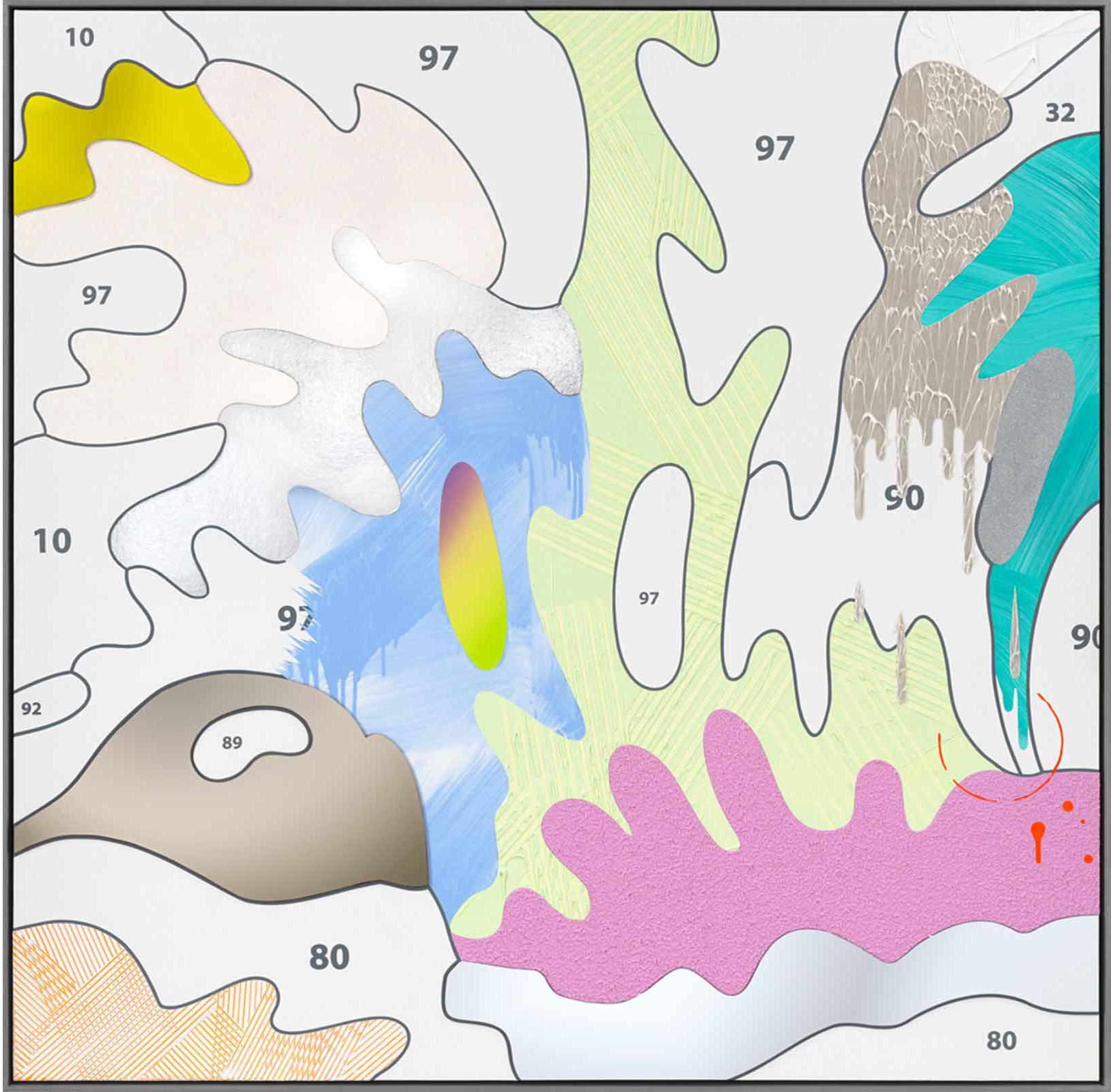 Anselm Reyle’s paint-by-numbers are motifs that self-referentially incorporate pictorial elements from his own previous works. They re-contextualize a universally standardized mid-20th century hobby kit into legitimate Pop icons. From Andy Warhol’s ‘Do It Yourself Landscape’ (1962), to early 1990’s Komar; Melamid, this series (executed instructional style) by Reyle also evokes the kitsch elements of Jeff Koon’s ‘Easy Fun’ cartoon mirrors (1999).