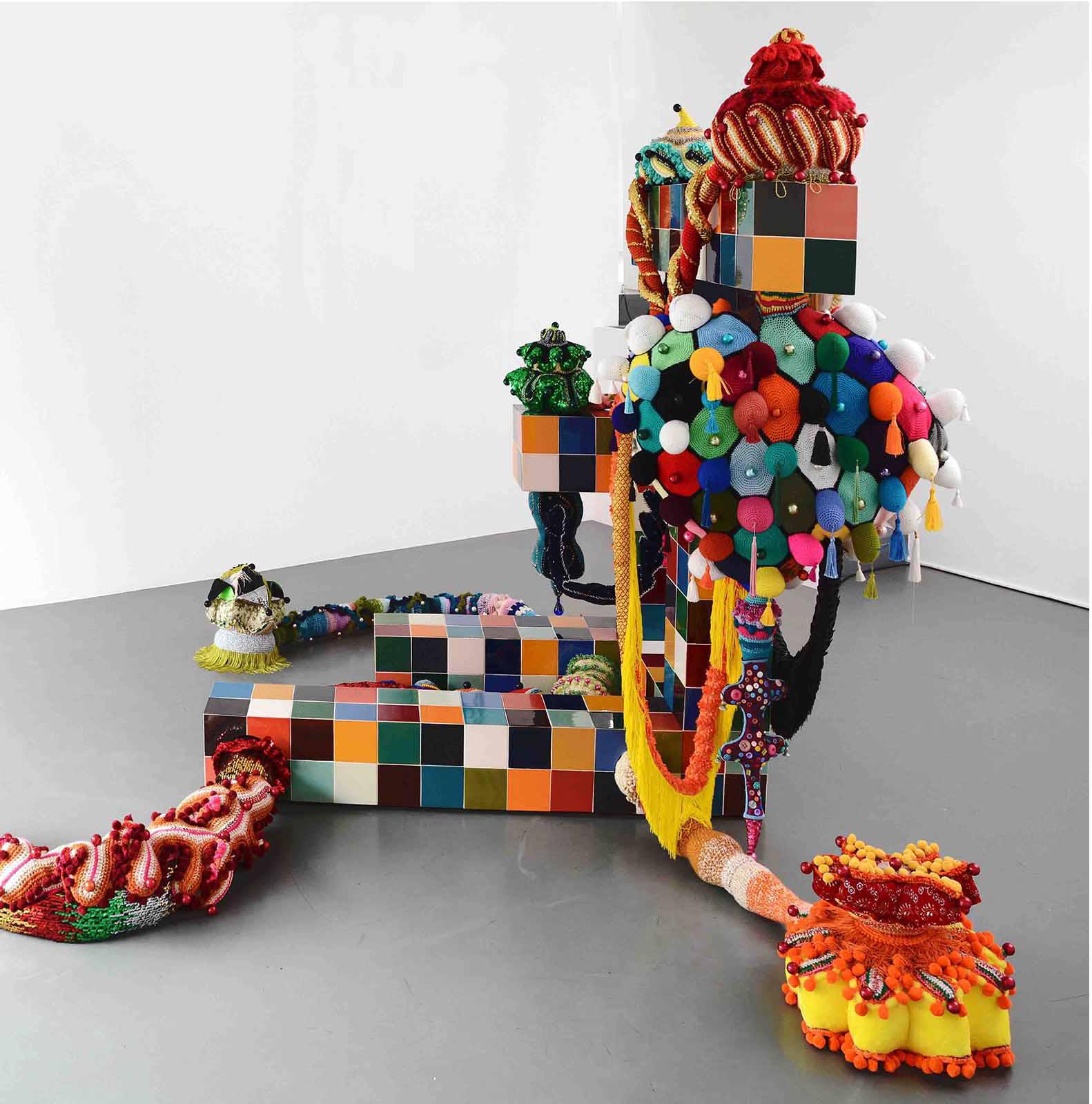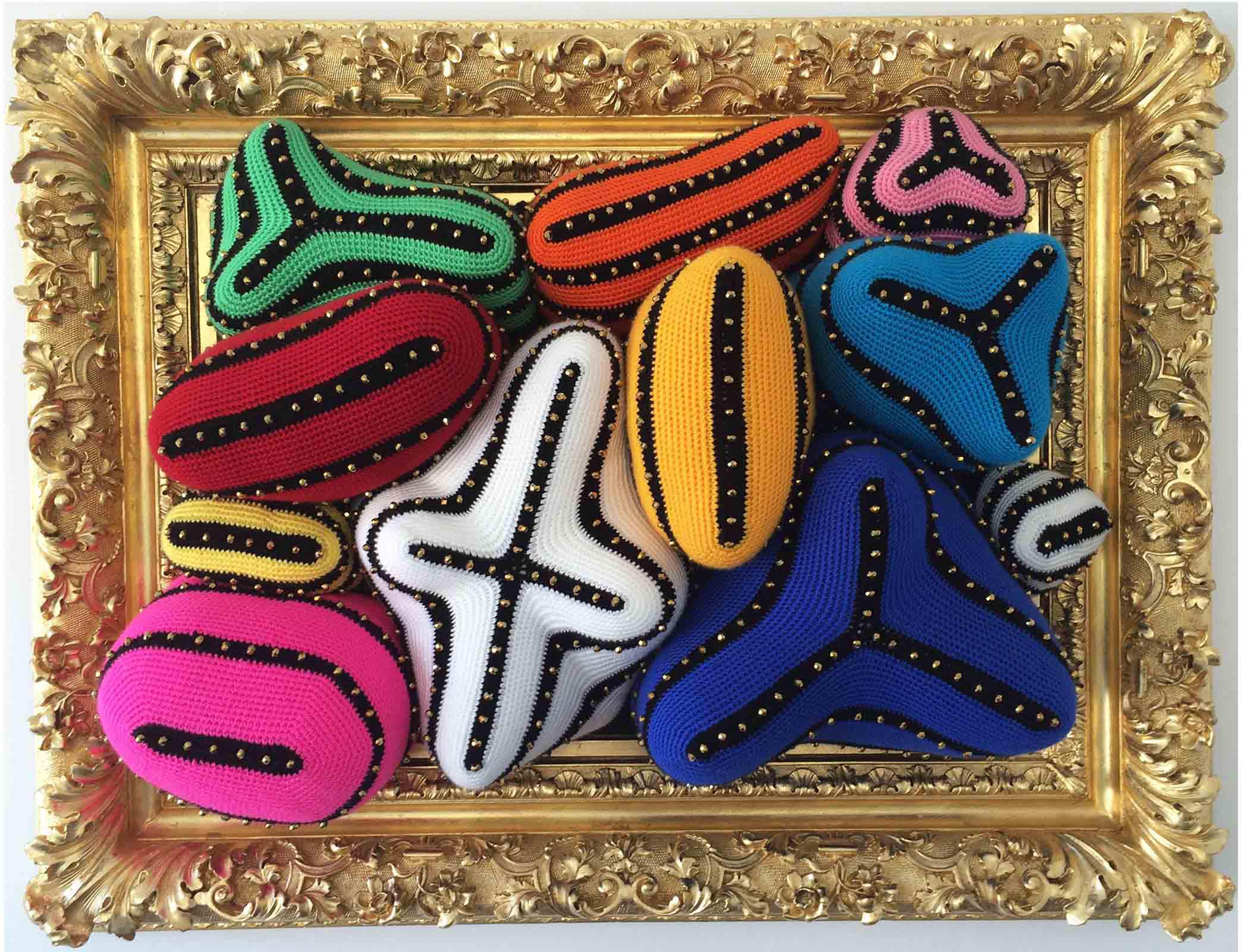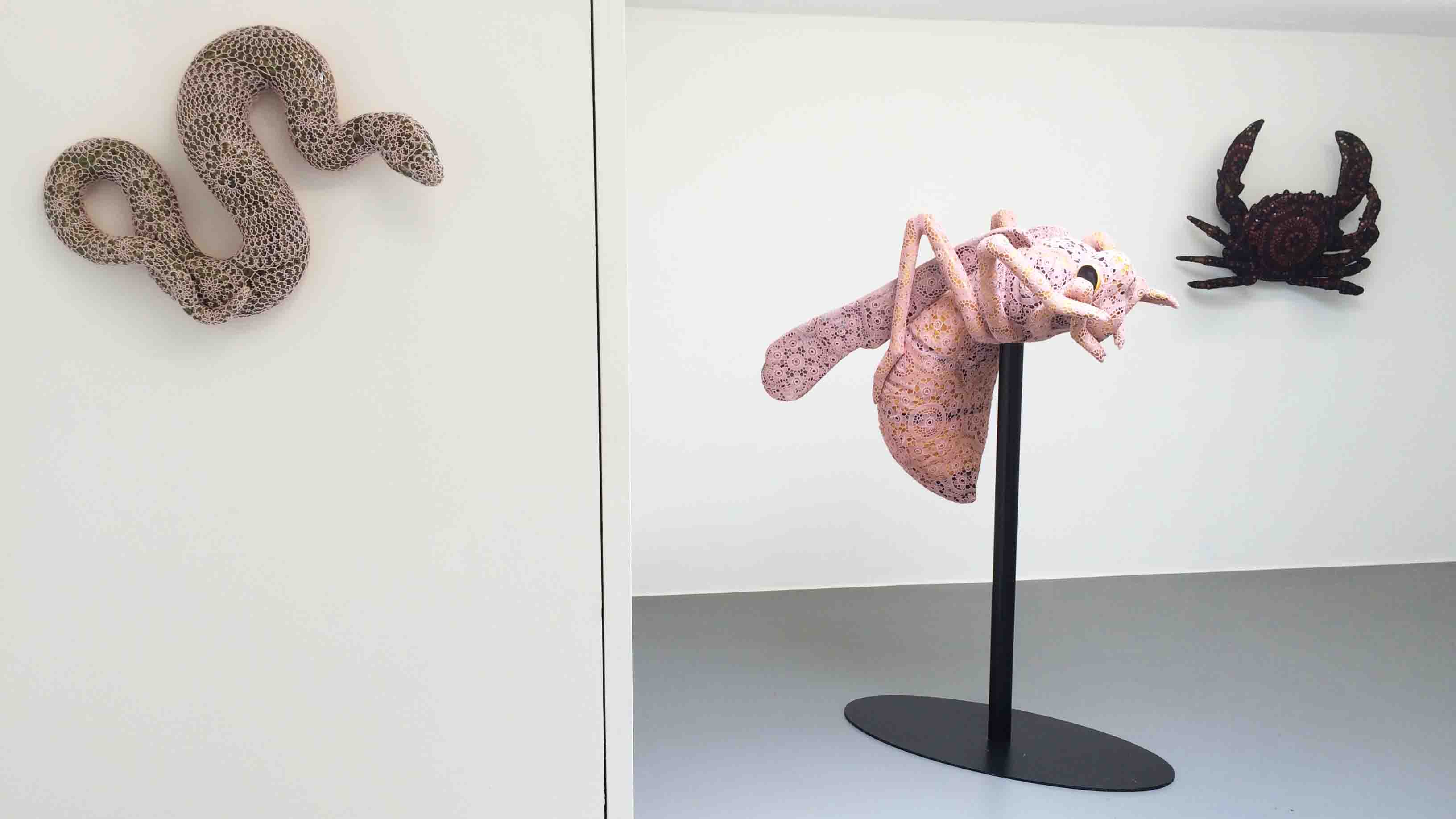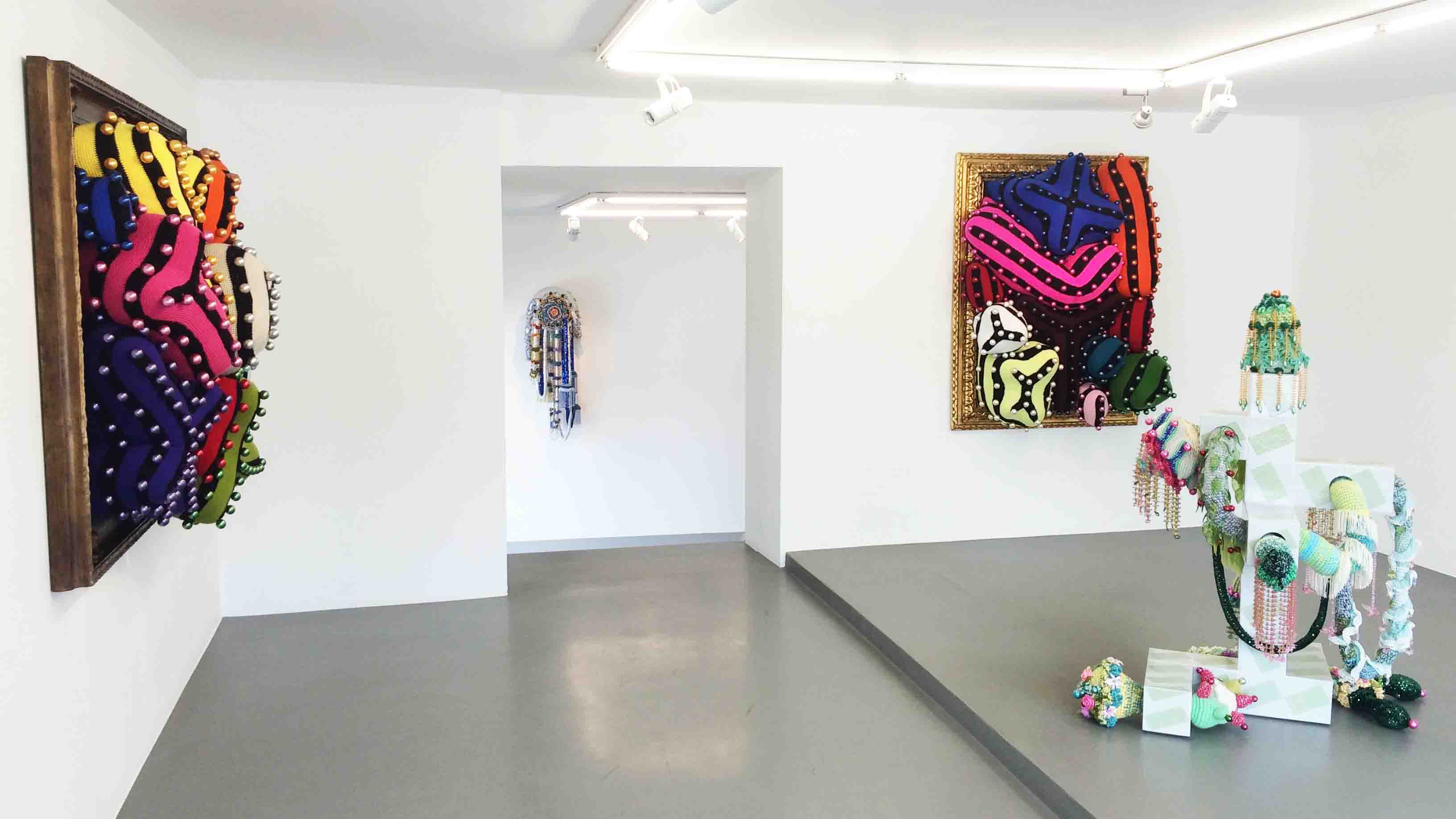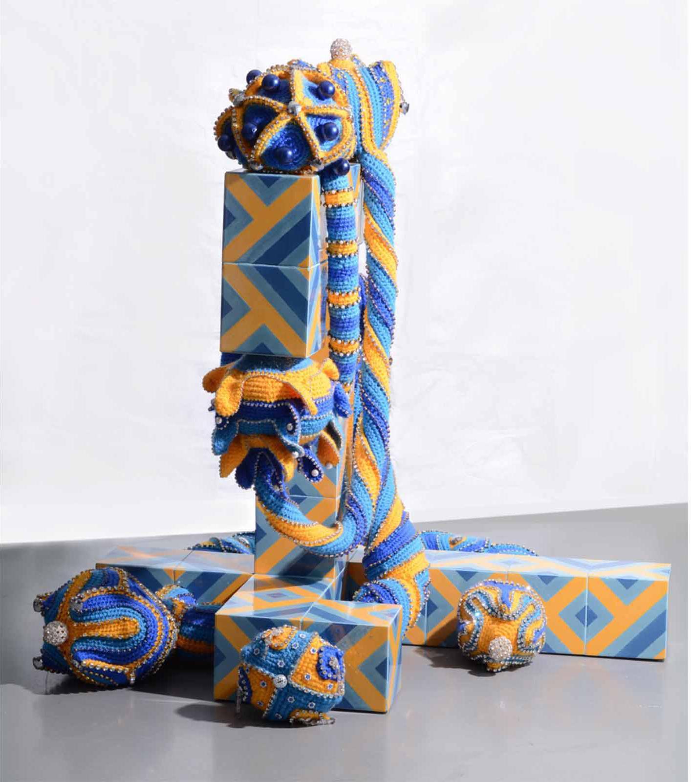 The solo exhibition features three main Oeuvres of the Artist’s career: her recent crochet paintings, the Tetris Sculptures and her seminal Bordalos which are traditional ceramics with crochet. Vasconcelos revives all the national handicrafts of her country and puts them to use in her works, passing from one genre to the next like the Douro flows through the wine country.