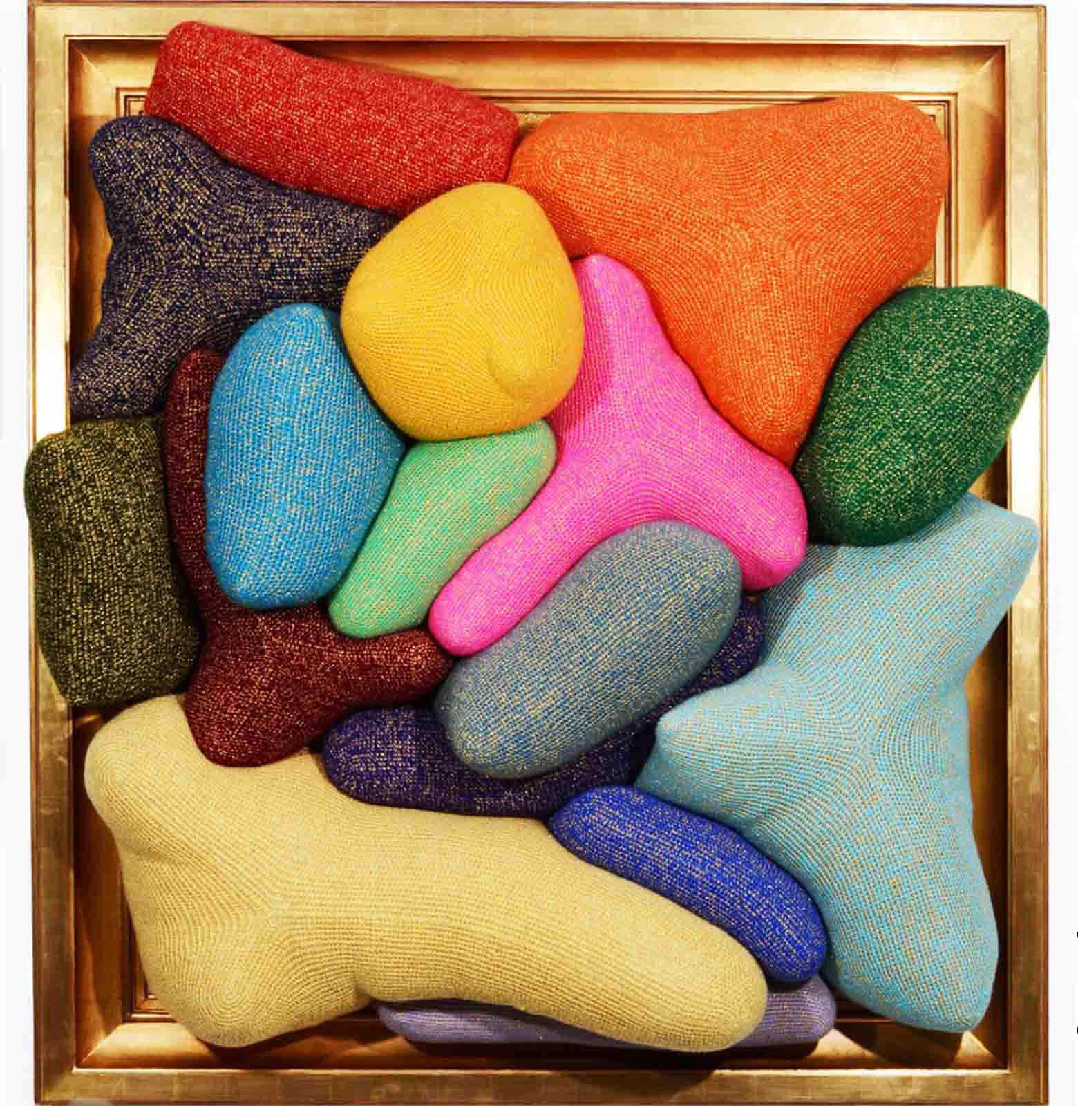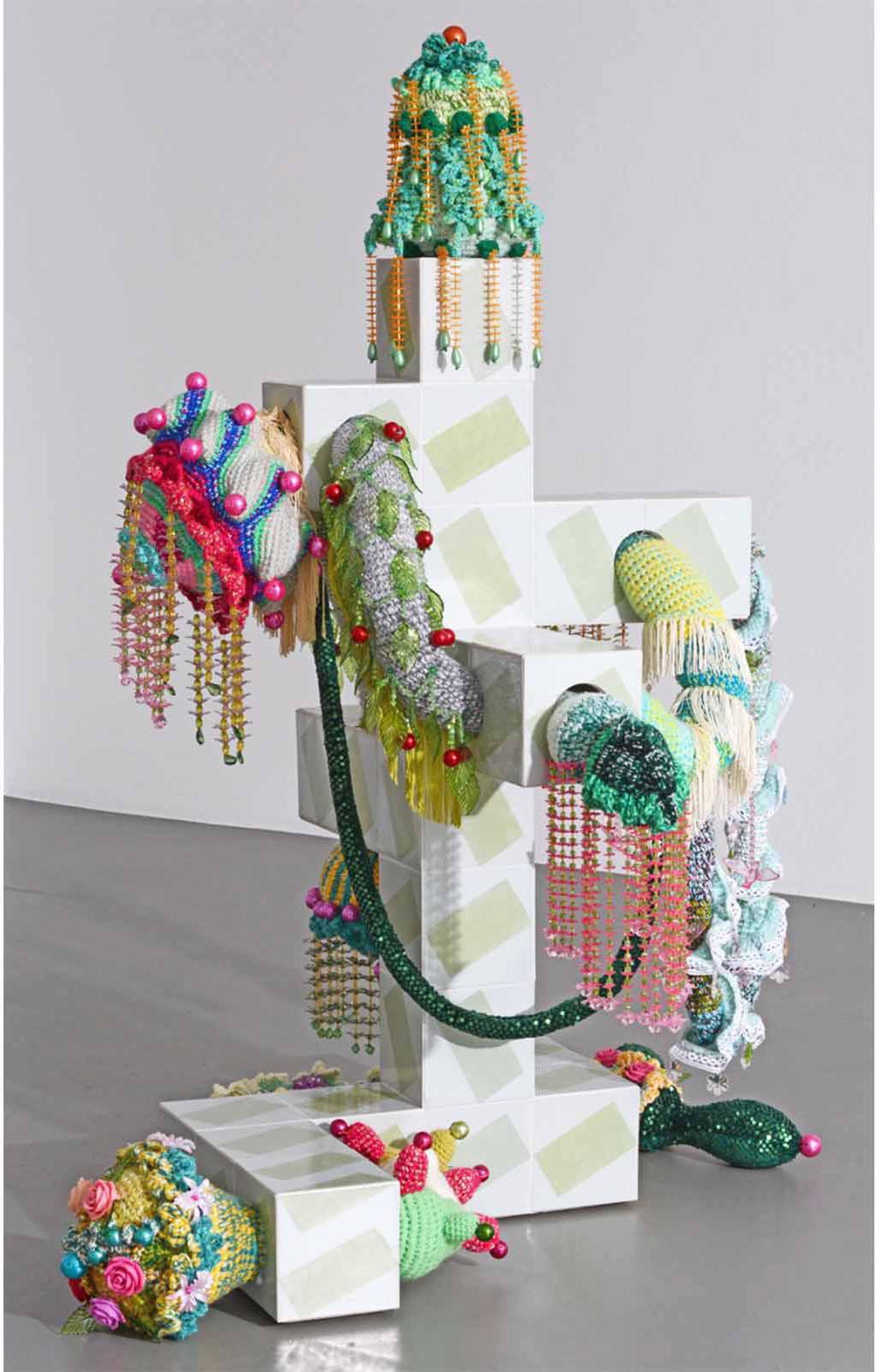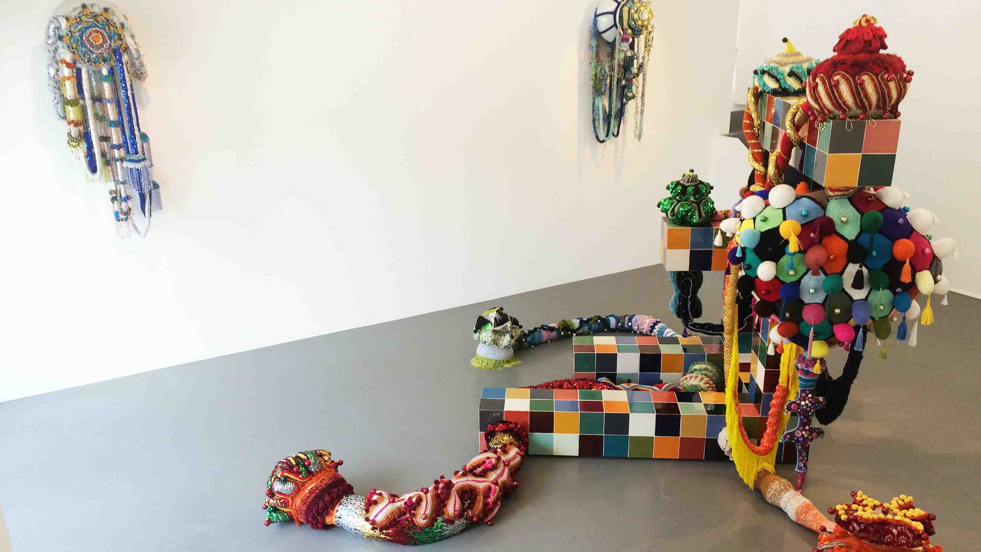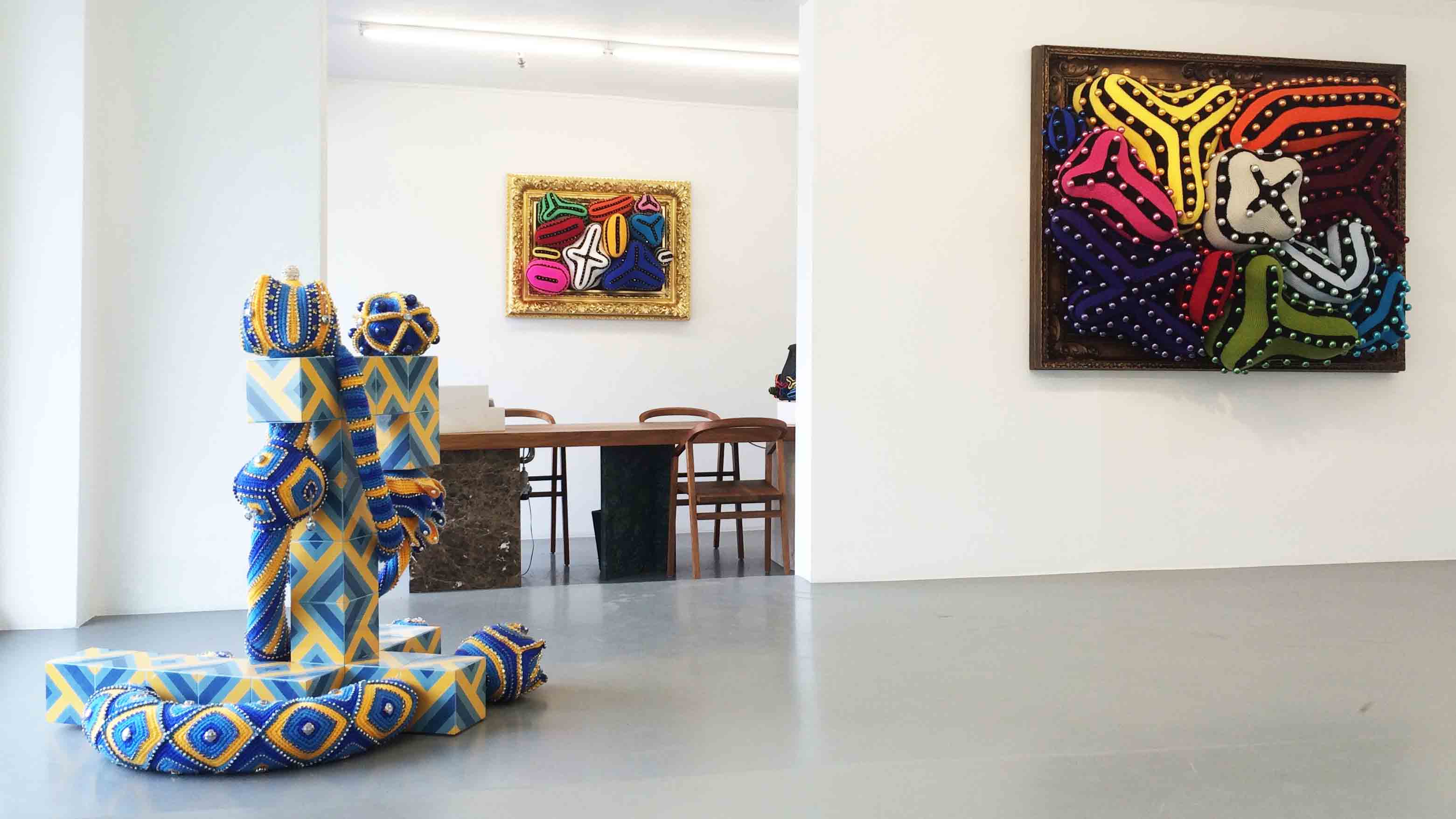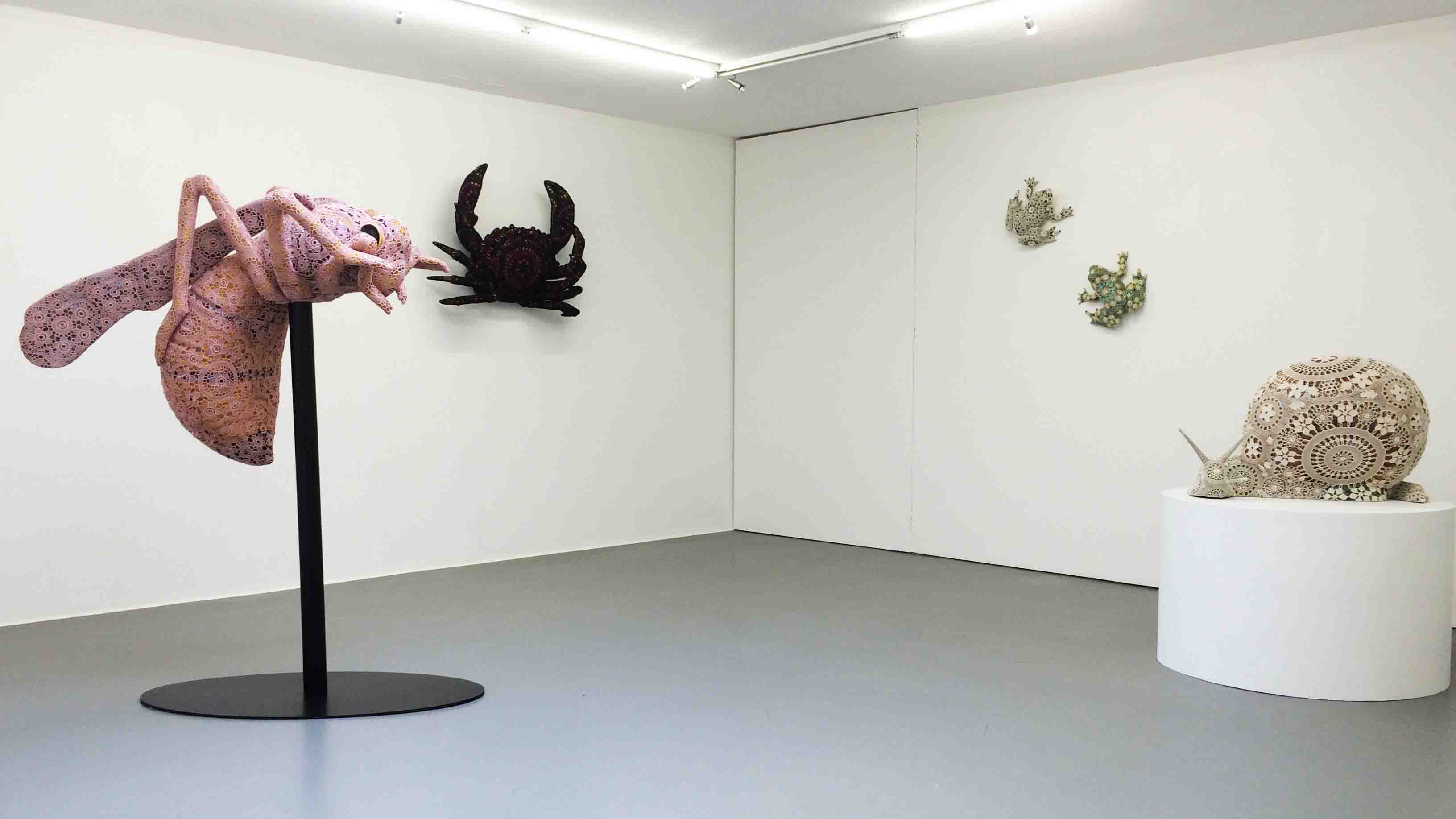 The solo exhibition features three main Oeuvres of the Artist’s career: her recent crochet paintings, the Tetris Sculptures and her seminal Bordalos which are traditional ceramics with crochet. Vasconcelos revives all the national handicrafts of her country and puts them to use in her works, passing from one genre to the next like the Douro flows through the wine country.