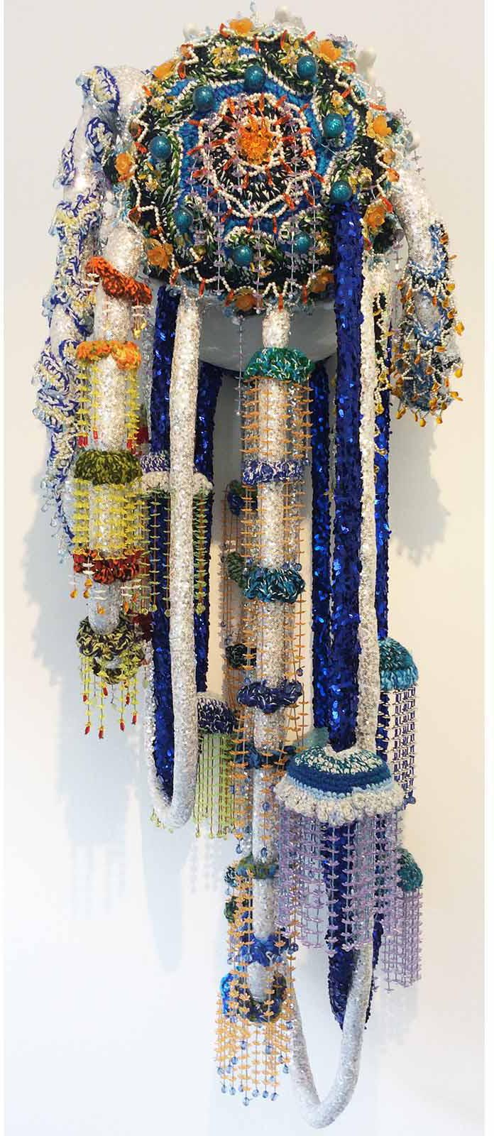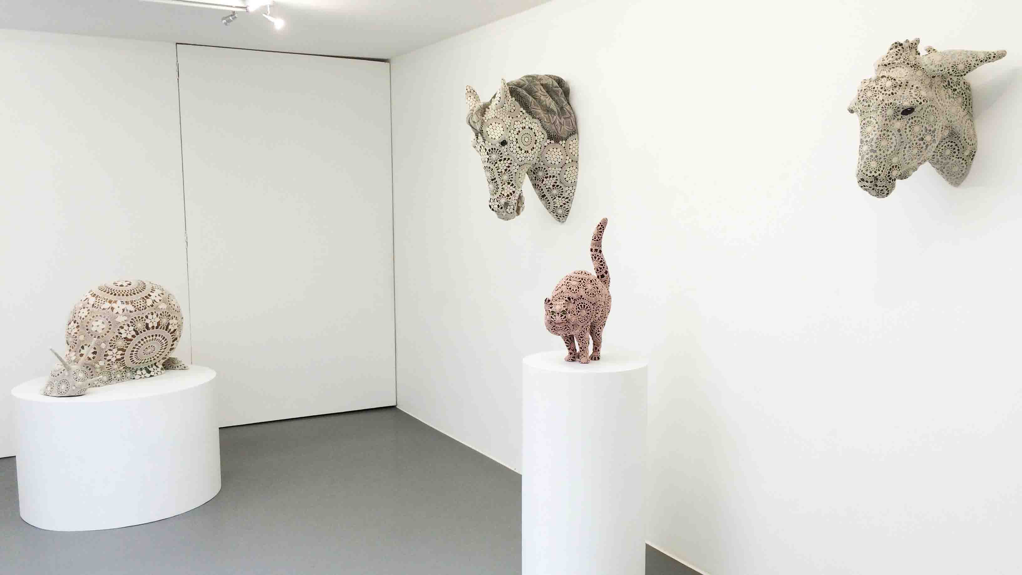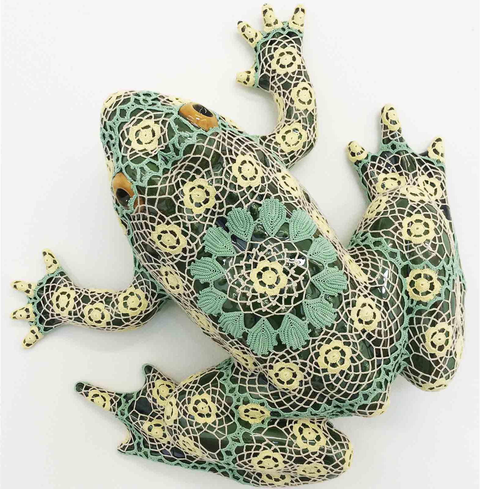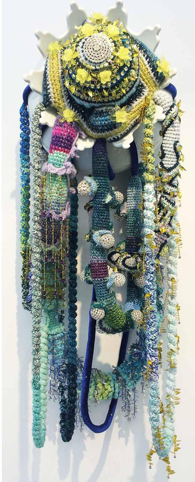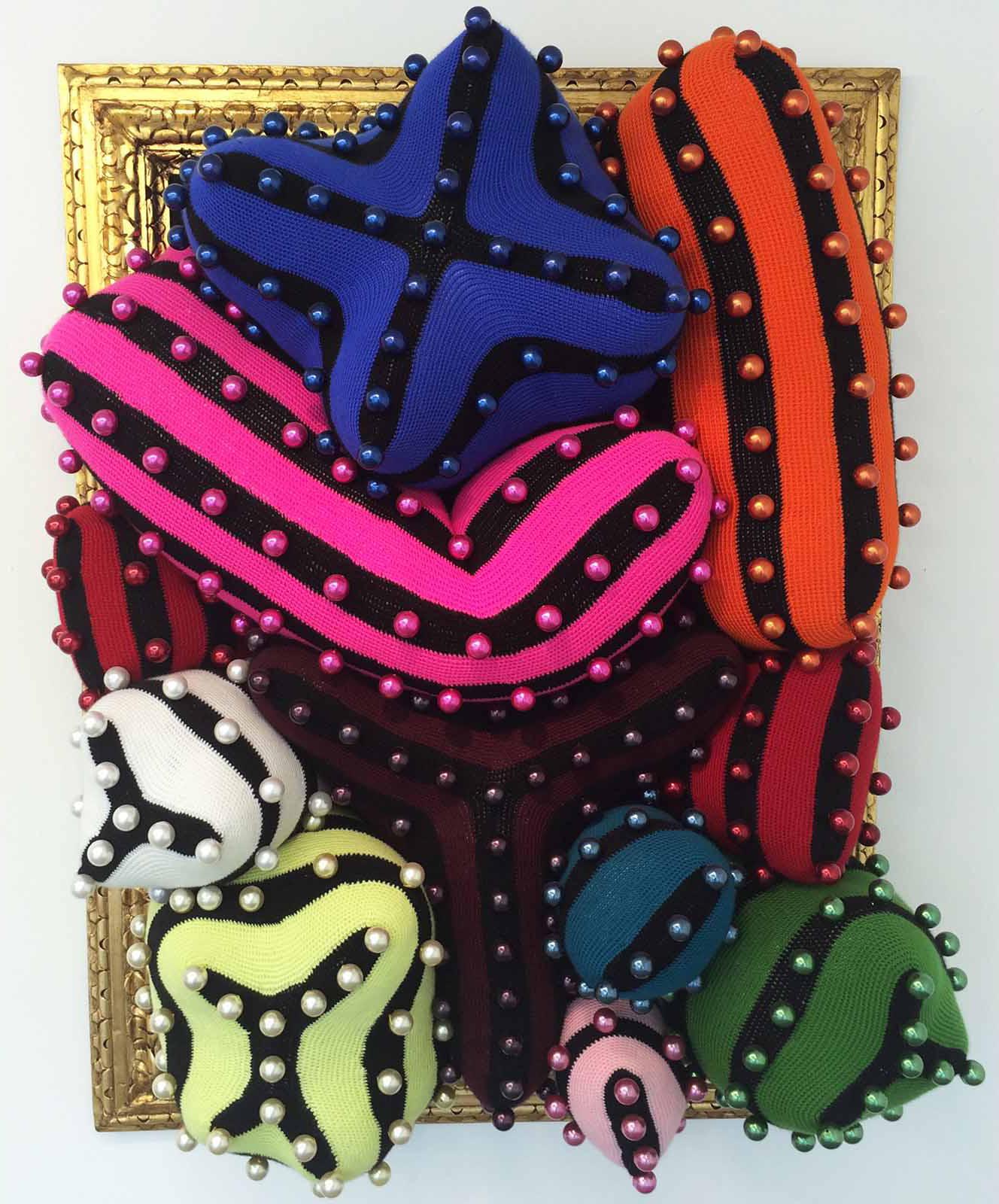 The solo exhibition features three main Oeuvres of the Artist’s career: her recent crochet paintings, the Tetris Sculptures and her seminal Bordalos which are traditional ceramics with crochet. Vasconcelos revives all the national handicrafts of her country and puts them to use in her works, passing from one genre to the next like the Douro flows through the wine country.