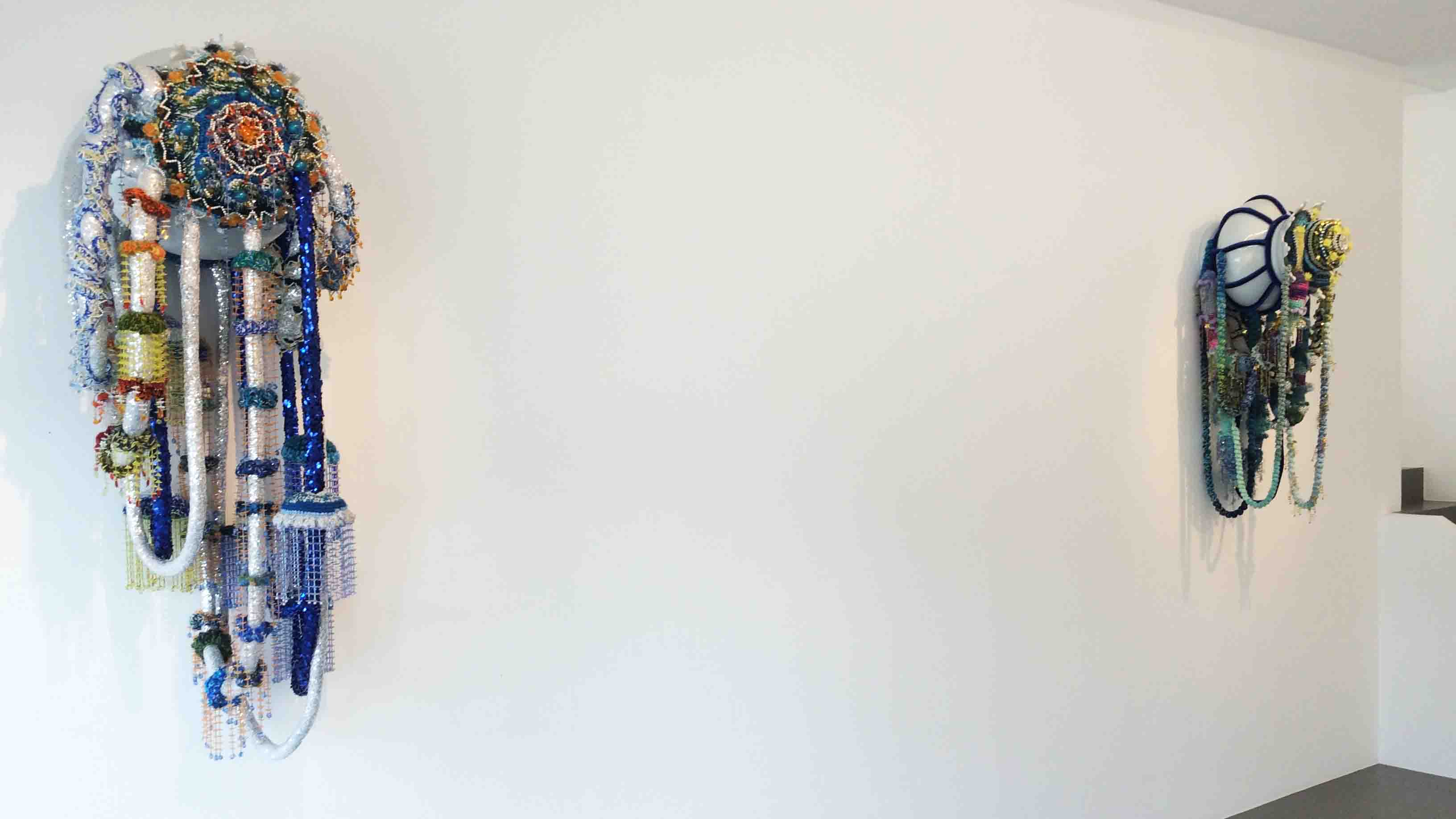 The explosion of the tiles varied colours is mimetized in the surprising and exuberant textile volumes that almost take over and expand from them. The rigid ceramics cannot prevent the evasion of the soft textile forms, whose organic shapes contrast with the angular blocks that form the structure. The female and masculine meet in these artworks, suggesting a harmonious play of contrasts that frustrates the expectations of a gender-based identity.