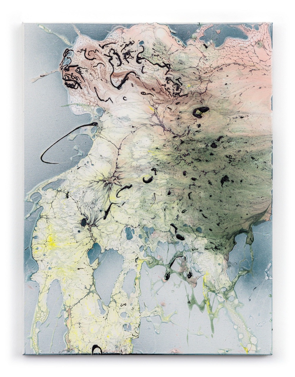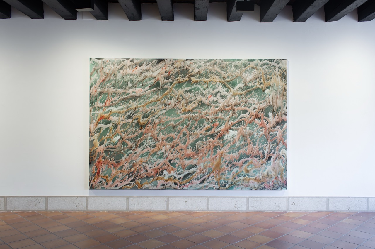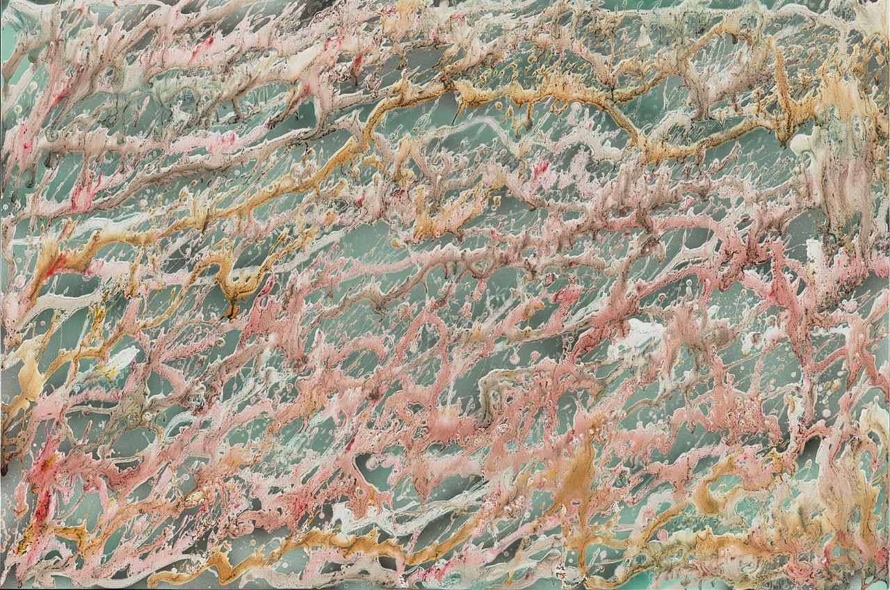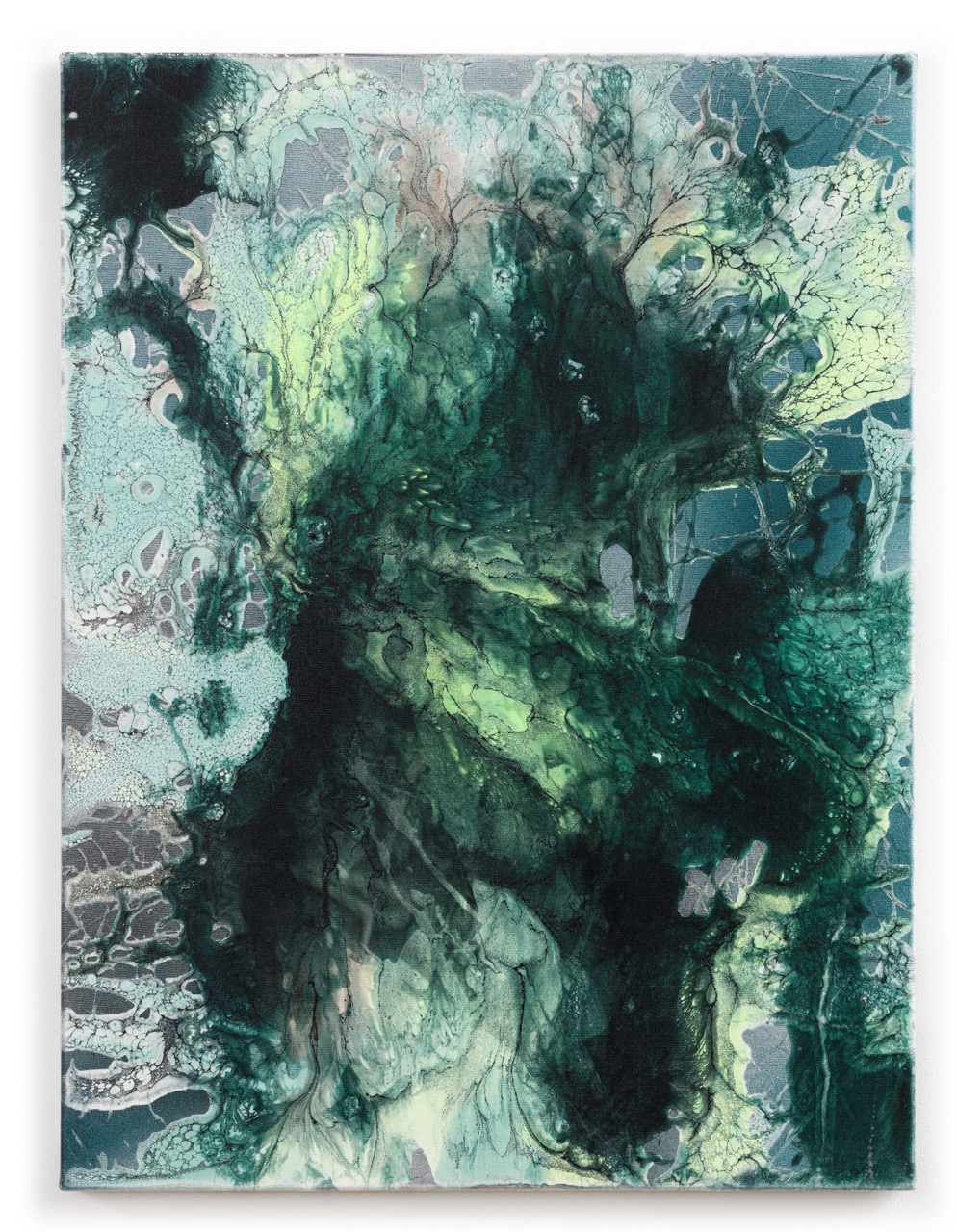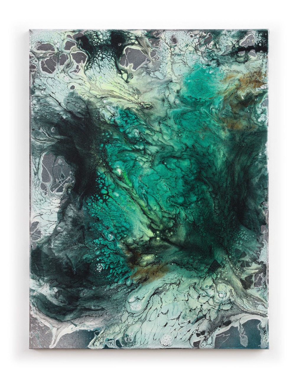 Patricia Low is delighted to present an exhibition of new and recent paintings by Hungarian artist Márta Kucsora. Less Orderly Ways marks the artist’s second solo exhibition with the gallery and her first at Patricia Low Venezia. United by their particular hue, or light palette, the works on view date from 2021 to 2024. Forms reminiscent of twisting vines, cellular matrices, and lava-like formations in greens, blues, pinks and gold occupy the canvases, each one alive with a sense of movement. Kucsora‘s richly layered abstractions, with their various splashes, flourishes, and calligraphic lines, invite active contemplation from the viewer and speak to the abundantly ornamented identity of Venice itself. A continuation of Kucsora‘s investigation into living processes, the works on show are all created by means of a fluid experimentation with water-based, organic chemicals poured on large-scale linen canvases in an afternoon’s brushless, choreographed performance. The results of this finely calibrated, yet also adventitious, dance of pigments, activators and retarders, are surfaces composed of layers of thin paint whose forms variously evoke biological structures or cosmological phenomena. A collaboration between the conscious and the unconscious, between the premeditated and the uncalculated, Kucsora‘s liquid ecologies constitute a kind of alchemy mediated by the relationship between artist and material.