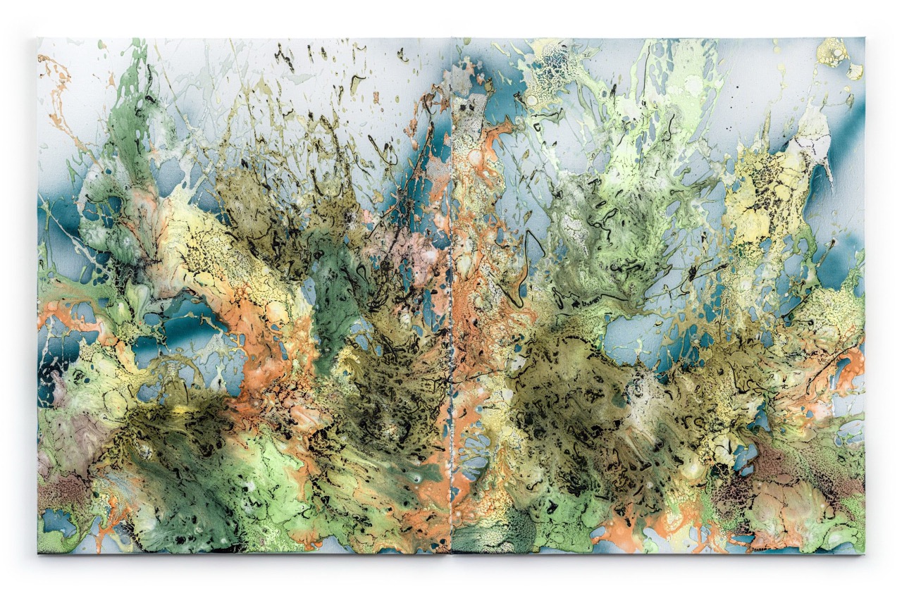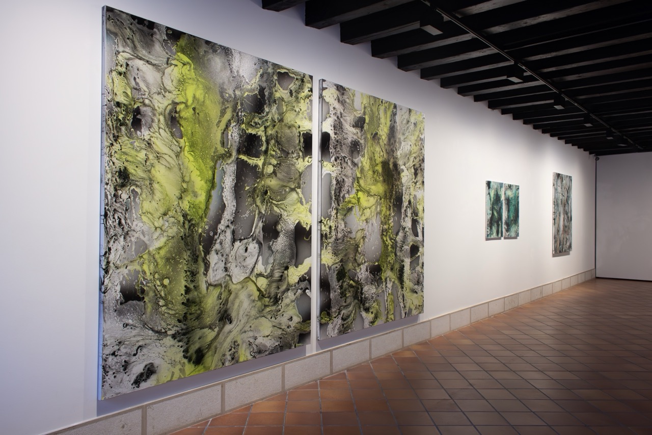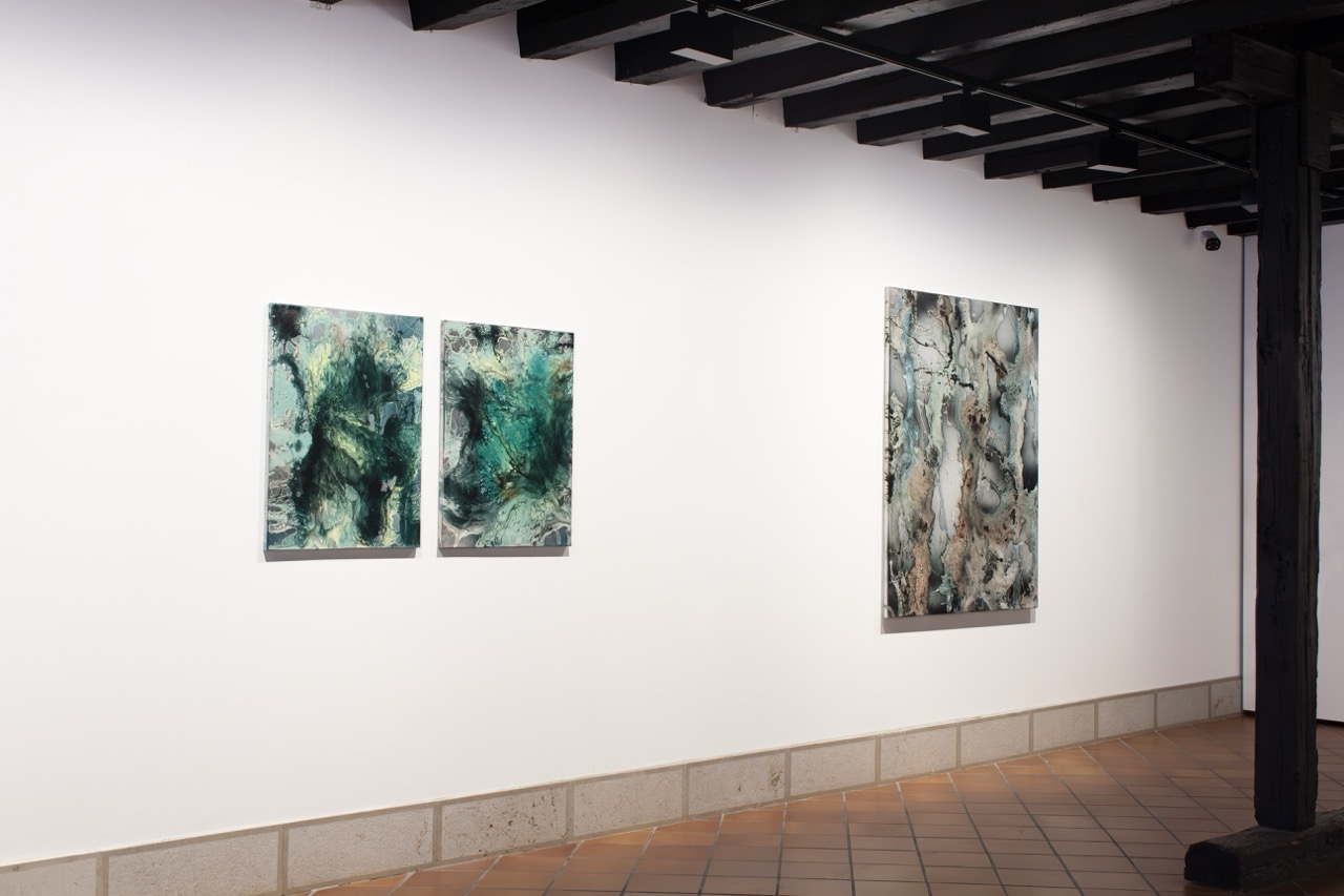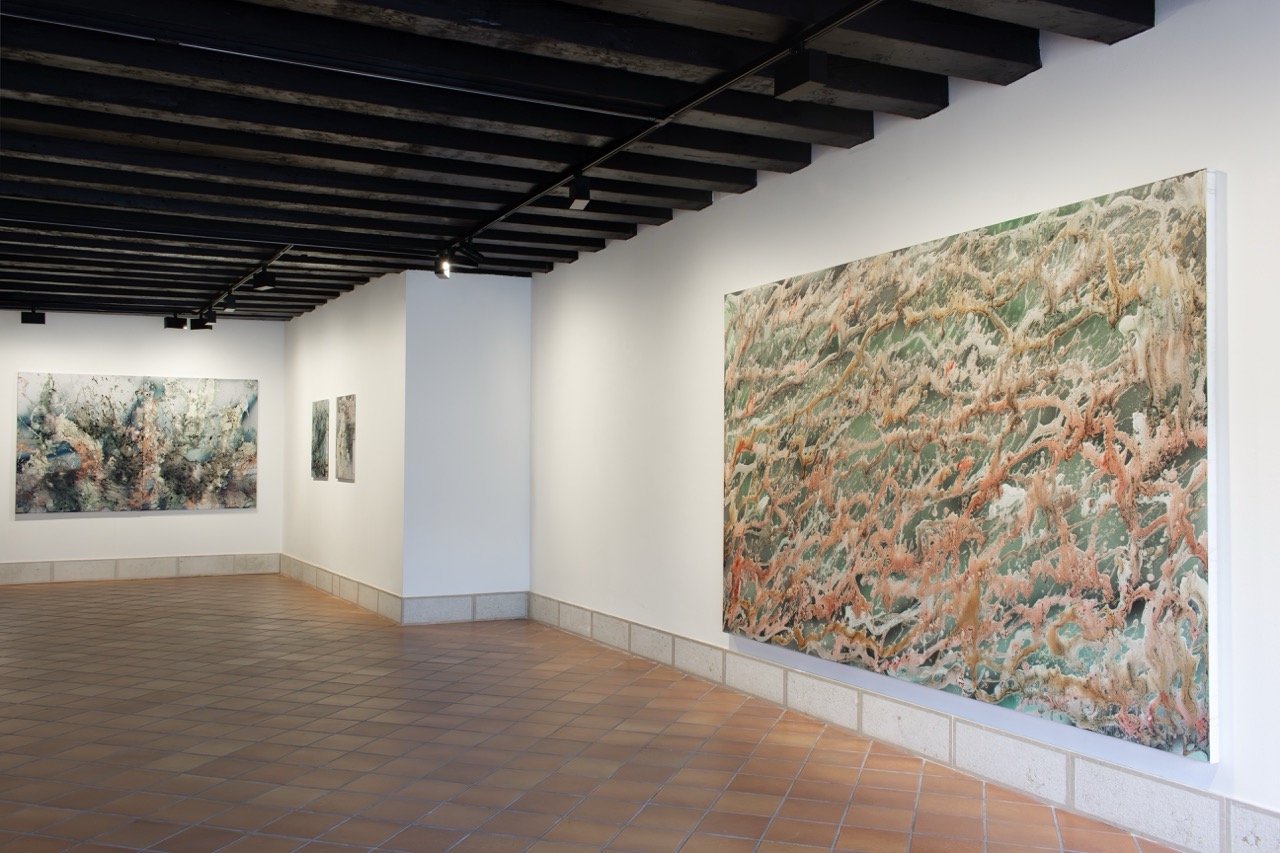 Patricia Low is delighted to present an exhibition of new and recent paintings by Hungarian artist Márta Kucsora. Less Orderly Ways marks the artist’s second solo exhibition with the gallery and her first at Patricia Low Venezia. United by their particular hue, or light palette, the works on view date from 2021 to 2024. Forms reminiscent of twisting vines, cellular matrices, and lava-like formations in greens, blues, pinks and gold occupy the canvases, each one alive with a sense of movement. Kucsora‘s richly layered abstractions, with their various splashes, flourishes, and calligraphic lines, invite active contemplation from the viewer and speak to the abundantly ornamented identity of Venice itself. A continuation of Kucsora‘s investigation into living processes, the works on show are all created by means of a fluid experimentation with water-based, organic chemicals poured on large-scale linen canvases in an afternoon’s brushless, choreographed performance. The results of this finely calibrated, yet also adventitious, dance of pigments, activators and retarders, are surfaces composed of layers of thin paint whose forms variously evoke biological structures or cosmological phenomena. A collaboration between the conscious and the unconscious, between the premeditated and the uncalculated, Kucsora‘s liquid ecologies constitute a kind of alchemy mediated by the relationship between artist and material.