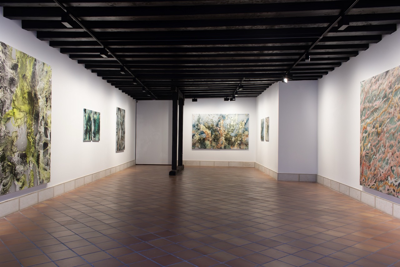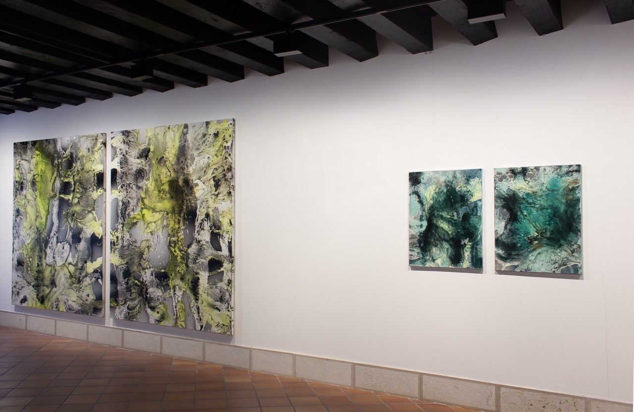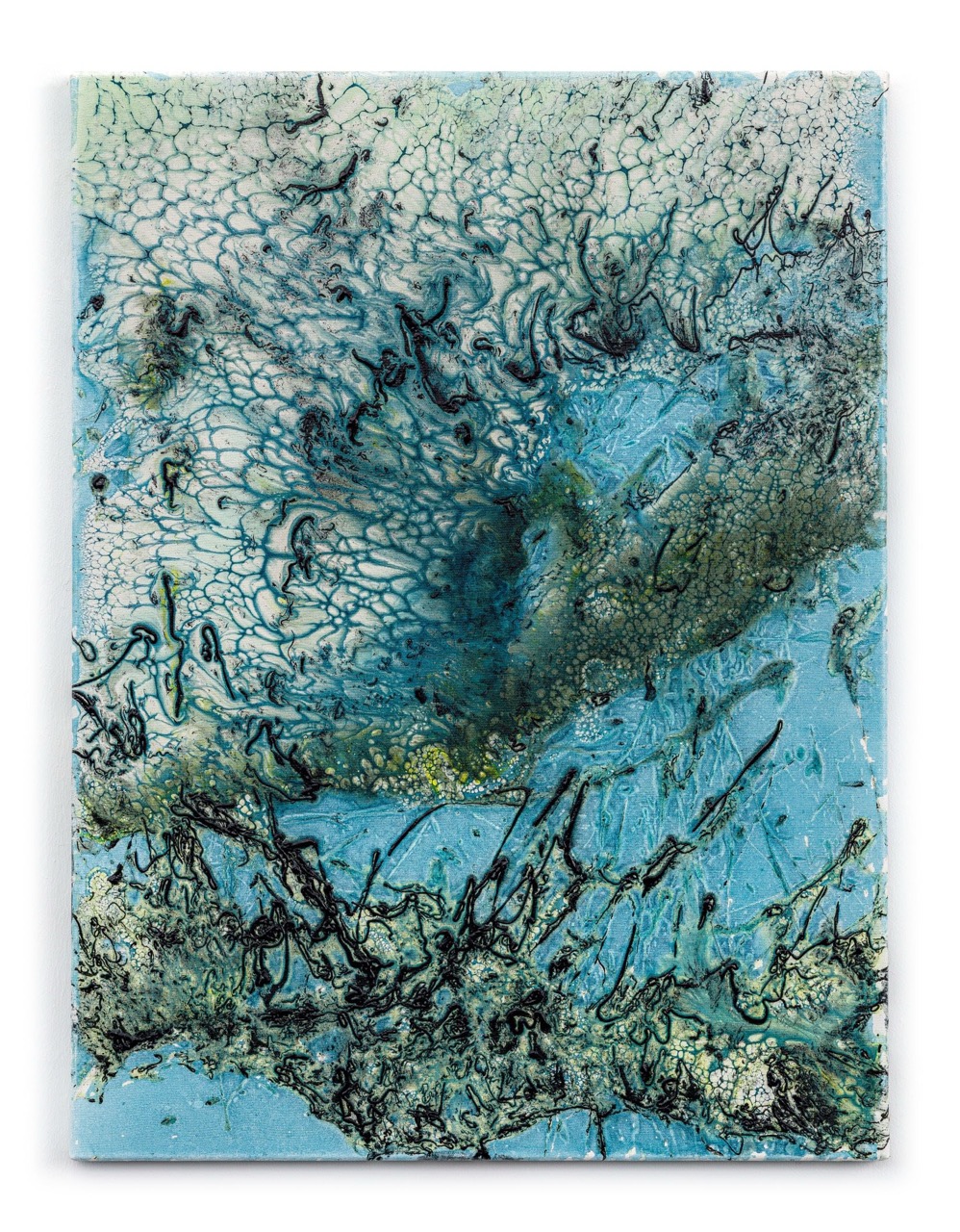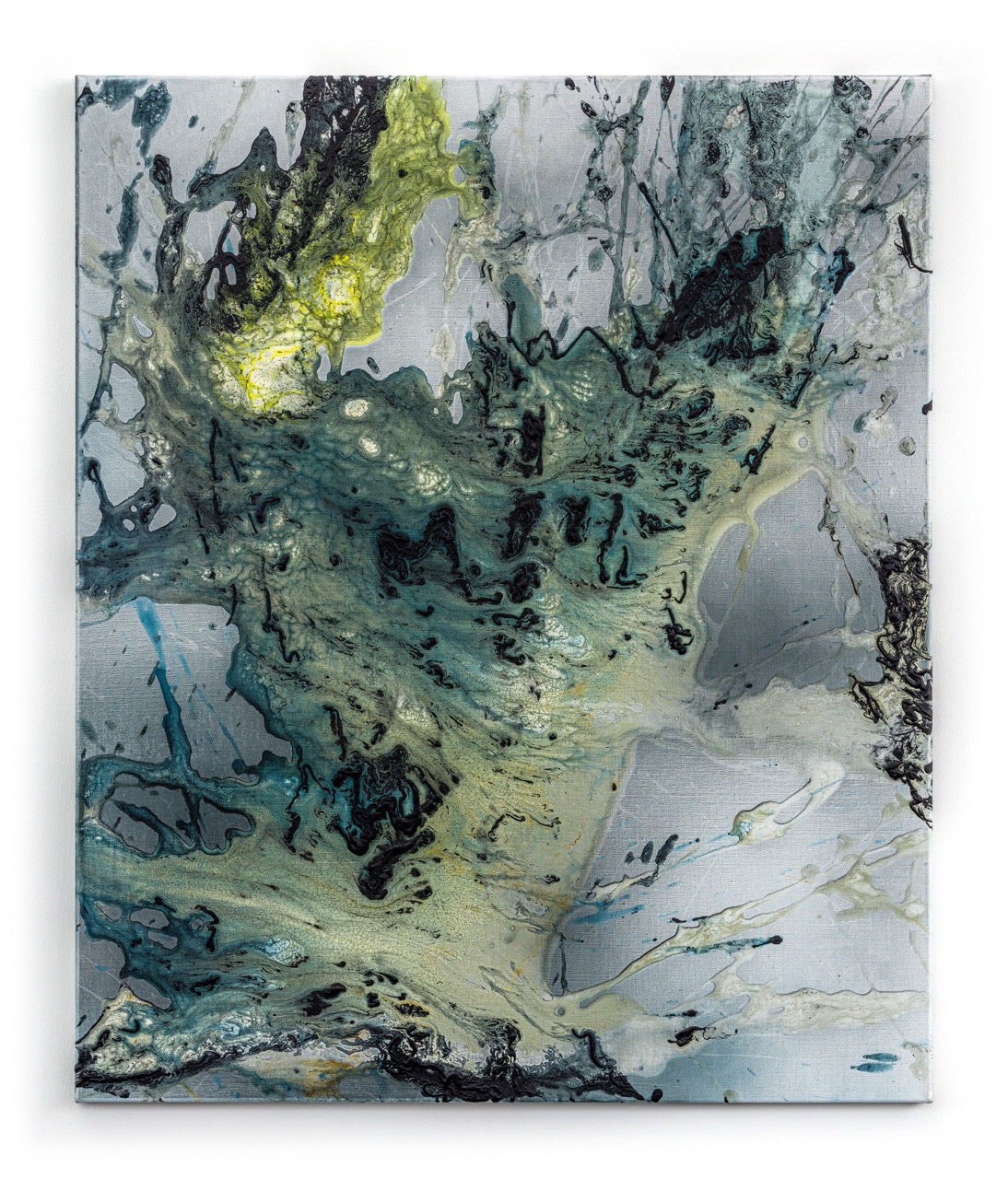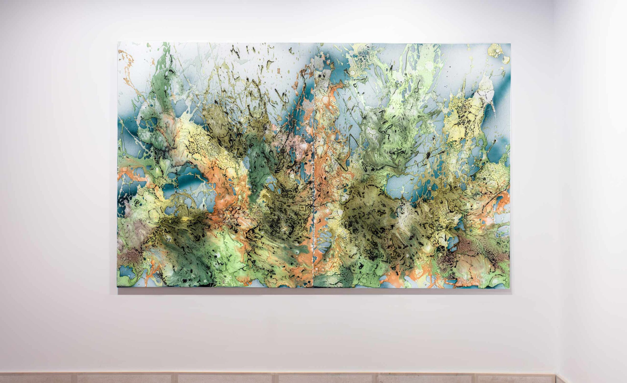 Patricia Low is delighted to present an exhibition of new and recent paintings by Hungarian artist Márta Kucsora. Less Orderly Ways marks the artist’s second solo exhibition with the gallery and her first at Patricia Low Venezia. United by their particular hue, or light palette, the works on view date from 2021 to 2024. Forms reminiscent of twisting vines, cellular matrices, and lava-like formations in greens, blues, pinks and gold occupy the canvases, each one alive with a sense of movement. Kucsora‘s richly layered abstractions, with their various splashes, flourishes, and calligraphic lines, invite active contemplation from the viewer and speak to the abundantly ornamented identity of Venice itself. A continuation of Kucsora‘s investigation into living processes, the works on show are all created by means of a fluid experimentation with water-based, organic chemicals poured on large-scale linen canvases in an afternoon’s brushless, choreographed performance. The results of this finely calibrated, yet also adventitious, dance of pigments, activators and retarders, are surfaces composed of layers of thin paint whose forms variously evoke biological structures or cosmological phenomena. A collaboration between the conscious and the unconscious, between the premeditated and the uncalculated, Kucsora‘s liquid ecologies constitute a kind of alchemy mediated by the relationship between artist and material.