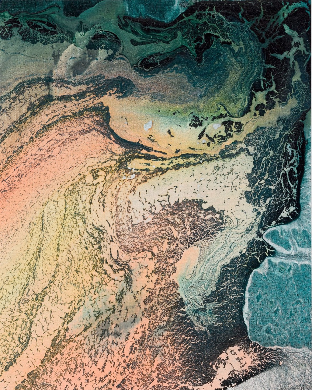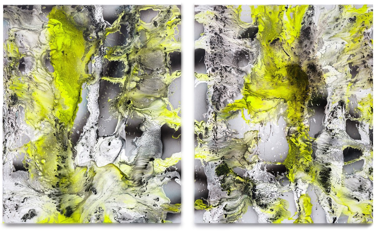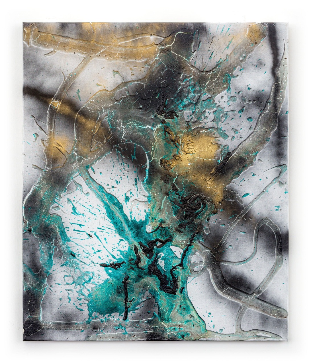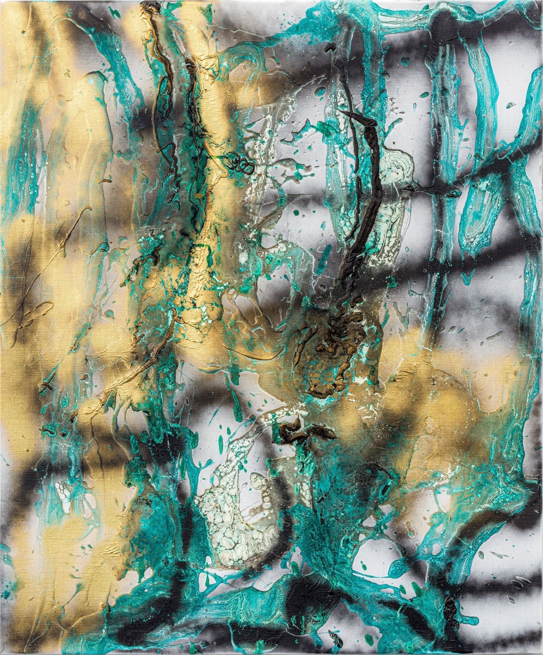 Patricia Low is delighted to present an exhibition of new and recent paintings by Hungarian artist Márta Kucsora. Less Orderly Ways marks the artist’s second solo exhibition with the gallery and her first at Patricia Low Venezia. United by their particular hue, or light palette, the works on view date from 2021 to 2024. Forms reminiscent of twisting vines, cellular matrices, and lava-like formations in greens, blues, pinks and gold occupy the canvases, each one alive with a sense of movement. Kucsora‘s richly layered abstractions, with their various splashes, flourishes, and calligraphic lines, invite active contemplation from the viewer and speak to the abundantly ornamented identity of Venice itself. A continuation of Kucsora‘s investigation into living processes, the works on show are all created by means of a fluid experimentation with water-based, organic chemicals poured on large-scale linen canvases in an afternoon’s brushless, choreographed performance. The results of this finely calibrated, yet also adventitious, dance of pigments, activators and retarders, are surfaces composed of layers of thin paint whose forms variously evoke biological structures or cosmological phenomena. A collaboration between the conscious and the unconscious, between the premeditated and the uncalculated, Kucsora‘s liquid ecologies constitute a kind of alchemy mediated by the relationship between artist and material.