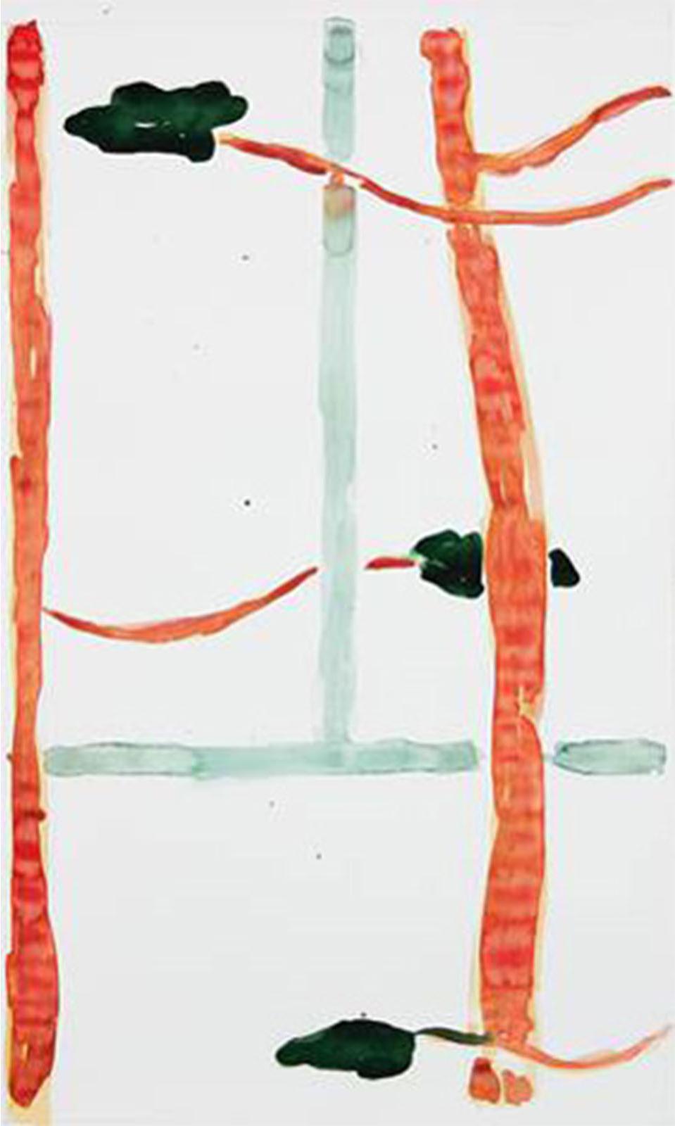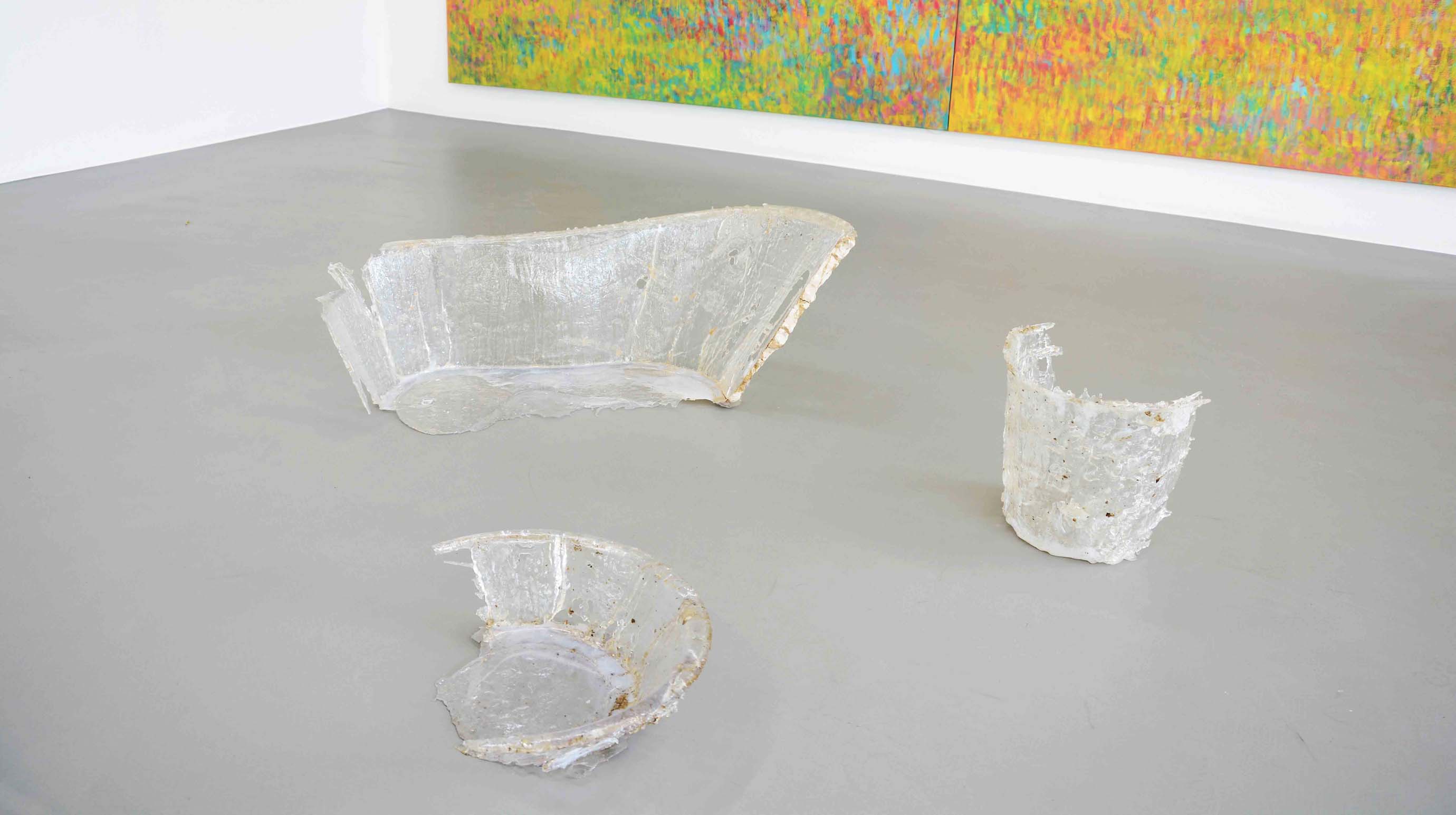 The younger artists in the exhibition work from these various positions, updating them for the present. For example Jean-Baptiste Bernadet’s neo-pointillist color fields that change when illuminated differently. Similarly, other artists like Svenja Deininger and Philipp Rößle also work in more traditional means, such as painting and watercolor but, consciously or not, have absorbed digital ways of reading the image, by confusing the arrangement of figure and ground via scraped versus layered paint in Deininger, and the physical addition of the disambiguated glass prop in the case of Rößle.