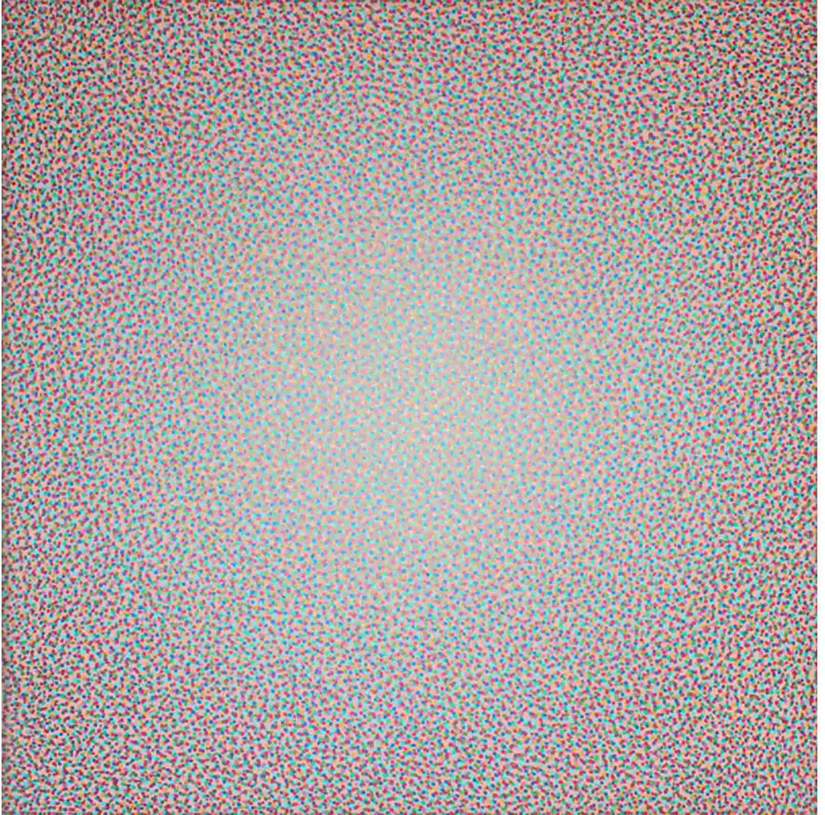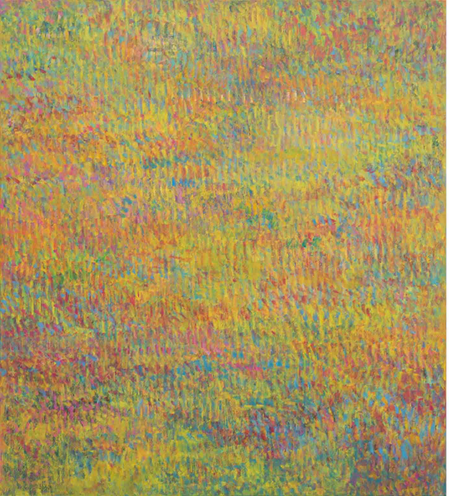 It is not surprising, then, that certain artists have periodically returned to the formal, painterly innovations of the Impressionists and their even more scientifically-oriented successors, the Post-Impressionists. The legacy of Seurat’s regular, atomized brushstroke resounds in the work of Sally Hazelet Drummond, a peer of Flavin’s, along whose side she was championed, early in her career, by key Minimalist Donald Judd. Her paintings show the potential for oil on canvas to evoke luminous associations not necessarily found in nature, but which nonetheless don’t feel opposed to the natural.