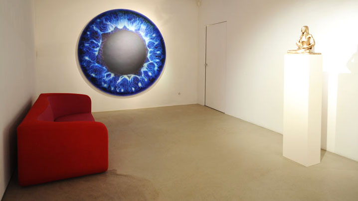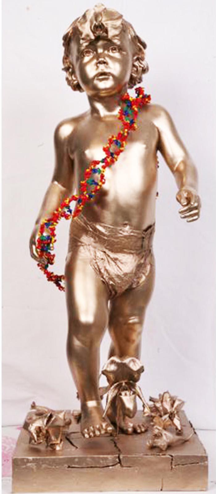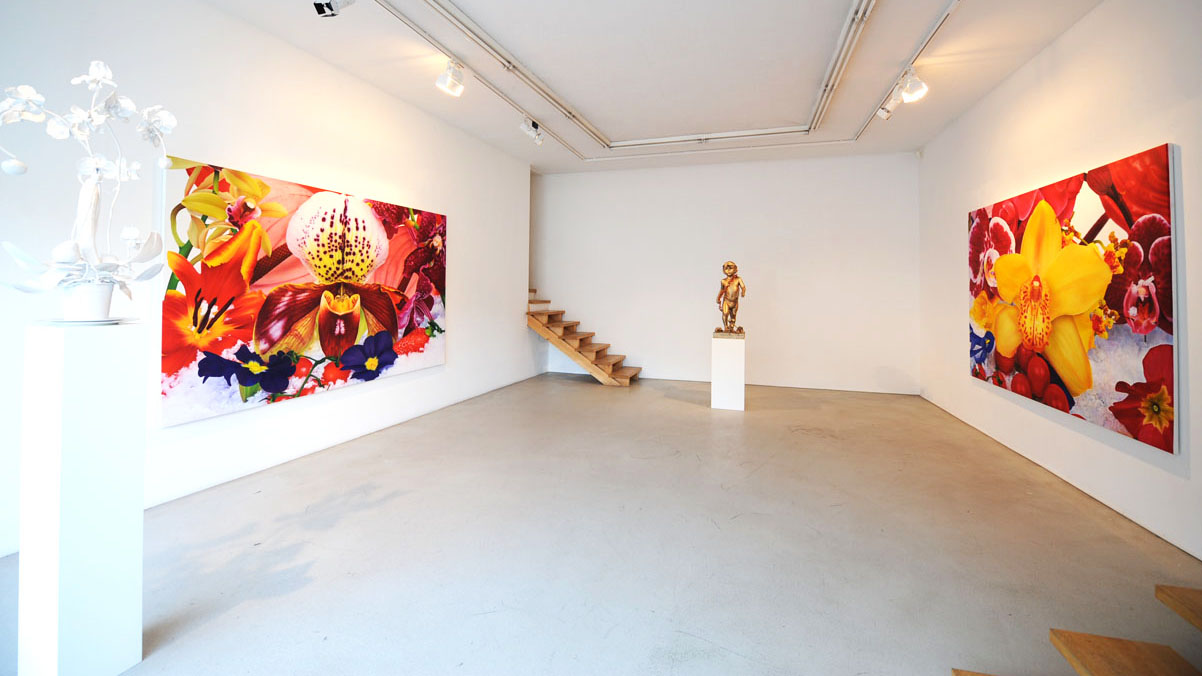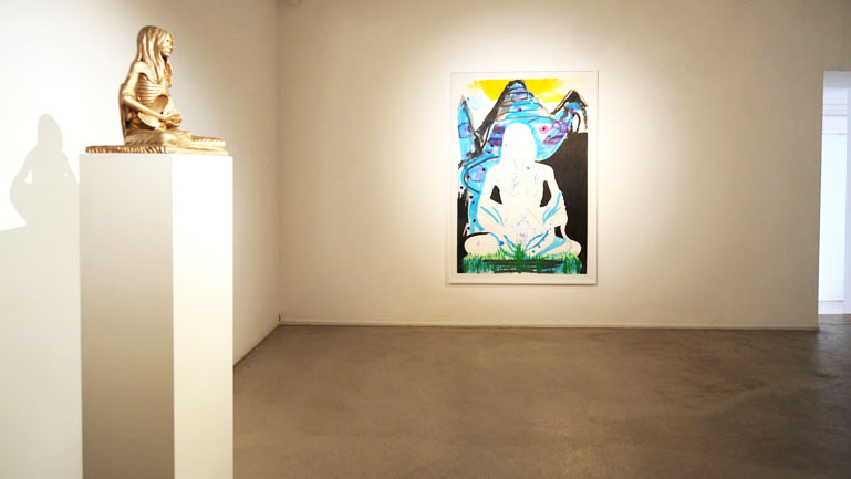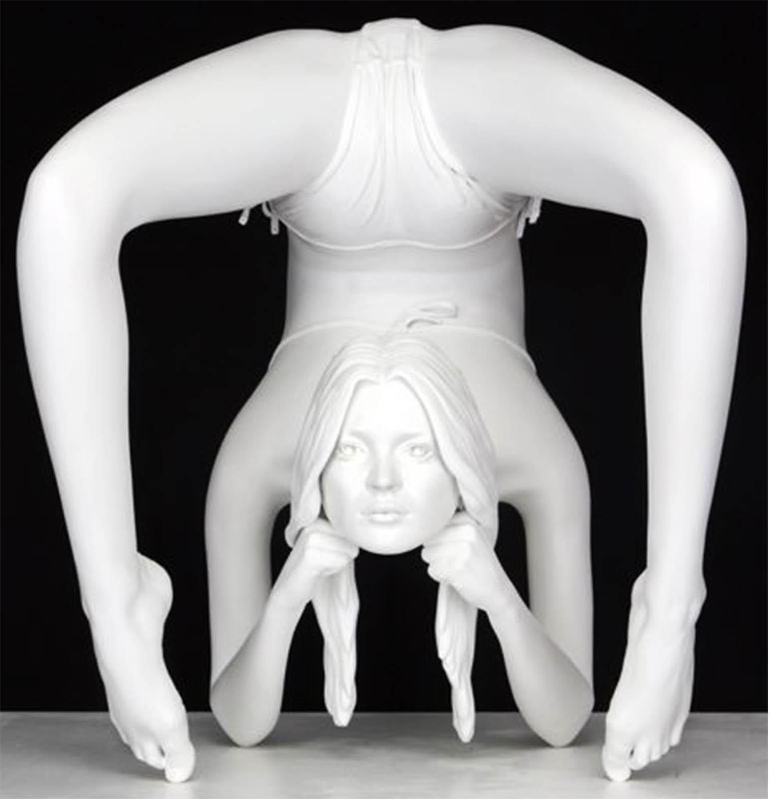 His recent Kate Moss sculptures pose super-model as yogi-Buddha, emaciated, contorted, and deformed; a waif goddess bestowing the blessings of vacuous malnourished serenity, tranquillity in angelic grotesquery. Coupled with larger sculptures, a cherub and floral still-life exquisitely executed in bronze, his works become infused with classicism’s timeless authority: the fragility of nature and youth made eternal, immortal, undead.