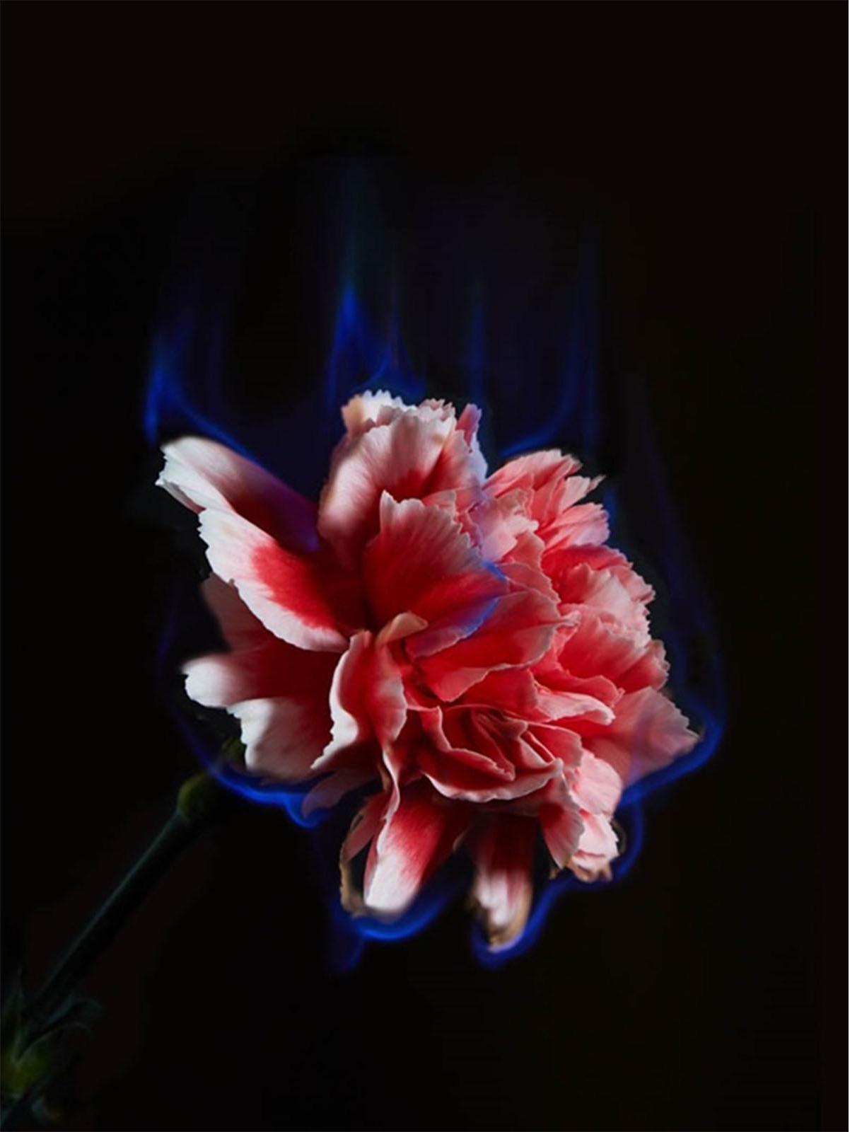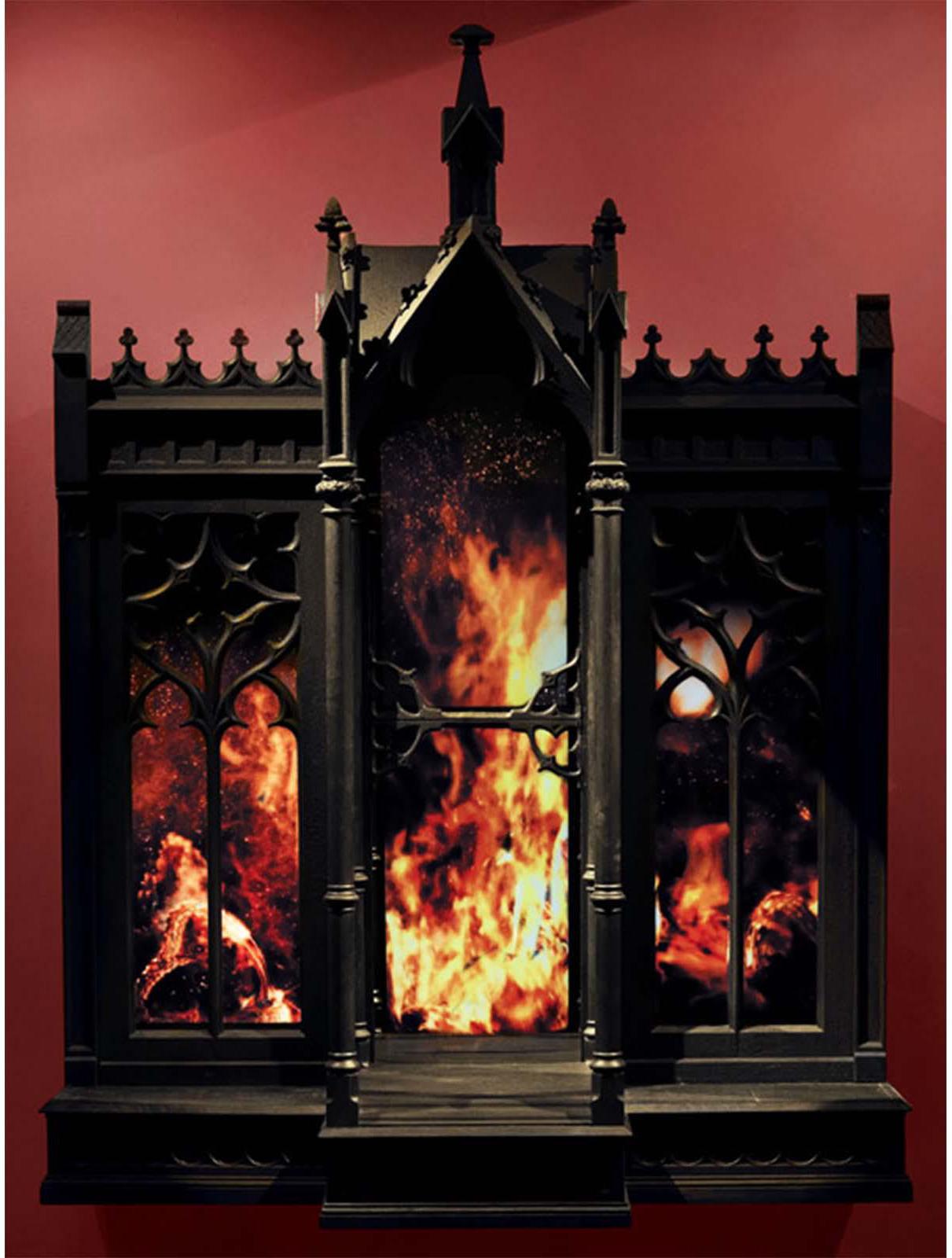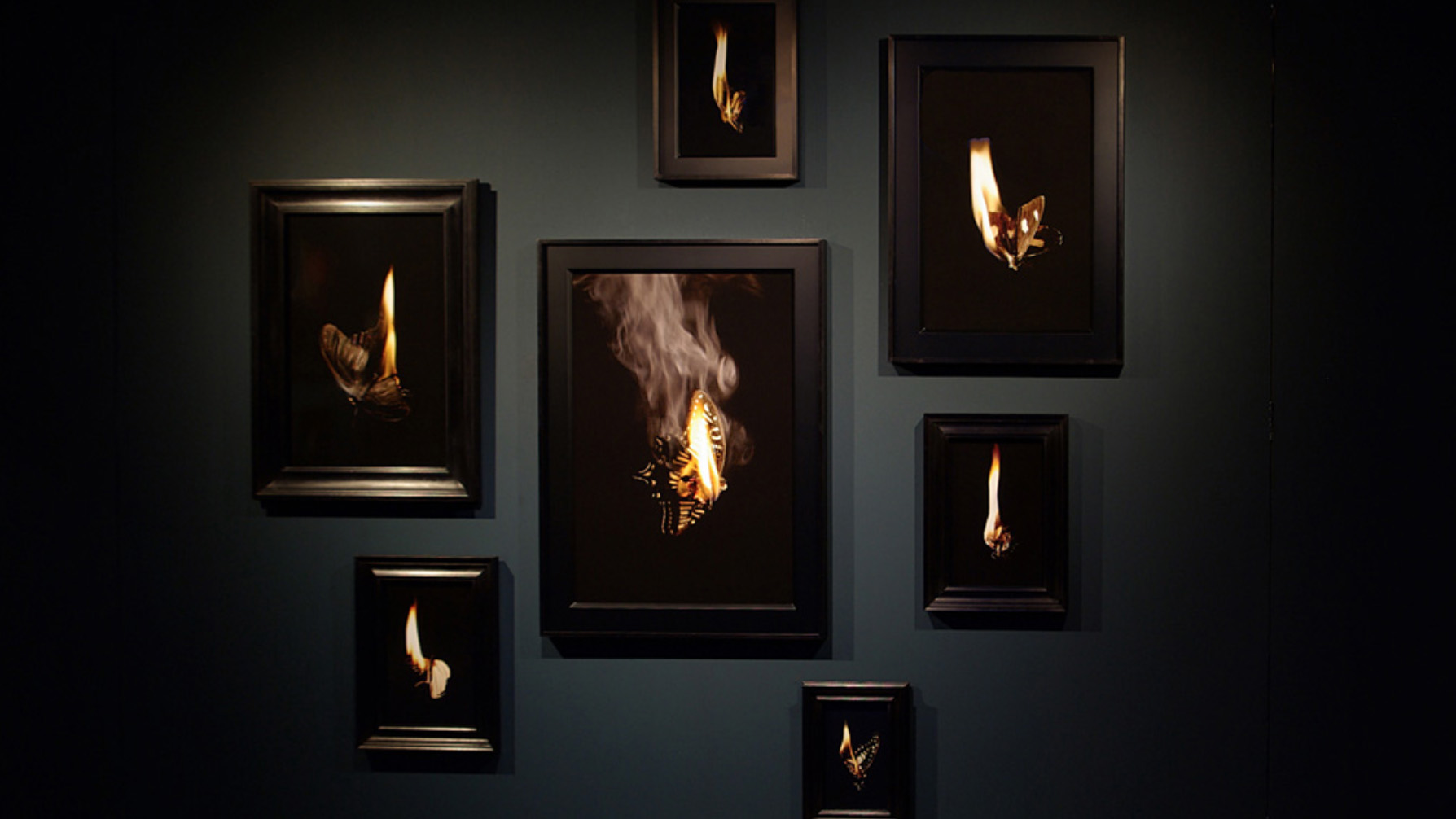 Collishaw suggests that ‘in the act of producing any work, there has to be some form of sacrifice, even if only the surrendering of reality to the invention of the artwork’. The reliquary cabinet in his piece titled Invisible Game would have traditionally been used as a means of preserving and venerating the physical remains of Saints. An end has to be met (that of the saint) before the cabinet can function, and Collishaw lures the viewer in to witness the impending sacrifice of the sufferer; a trapped fawn, helplessly awaiting it’s fate. The burning flower and butterfly photographs depict a similar dependency, the very process of their production demanding the demise of the subject, of beauty thwarted by the flames. The 19th century altarpiece in Performance plays host to a myriad of butterflies that are also struck by a similar fate. The fire heightens the mesmerising quality of this vignette, and the art is created at the moment of loss.