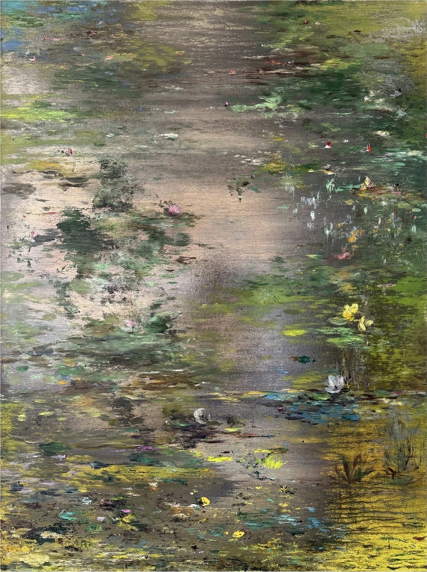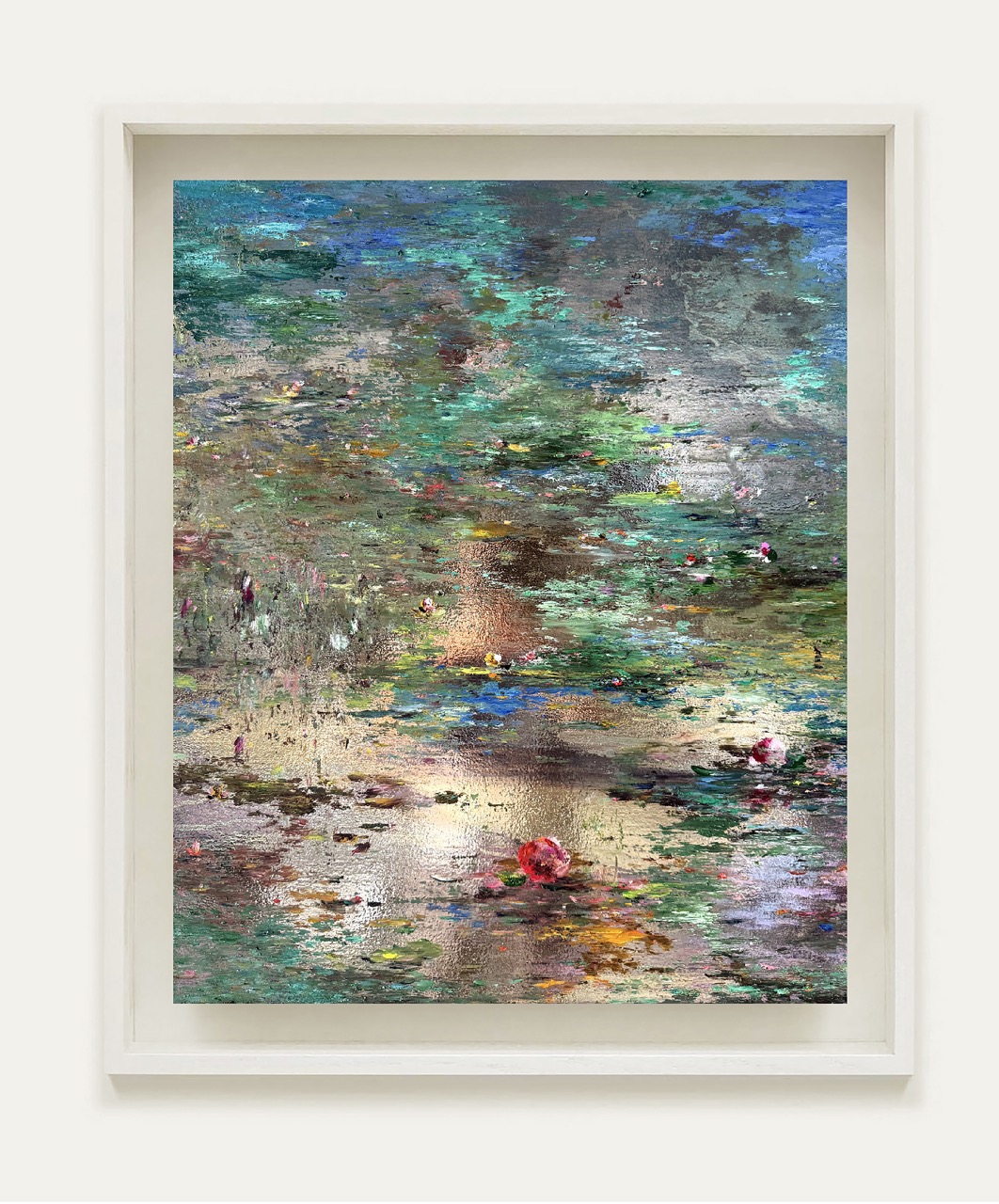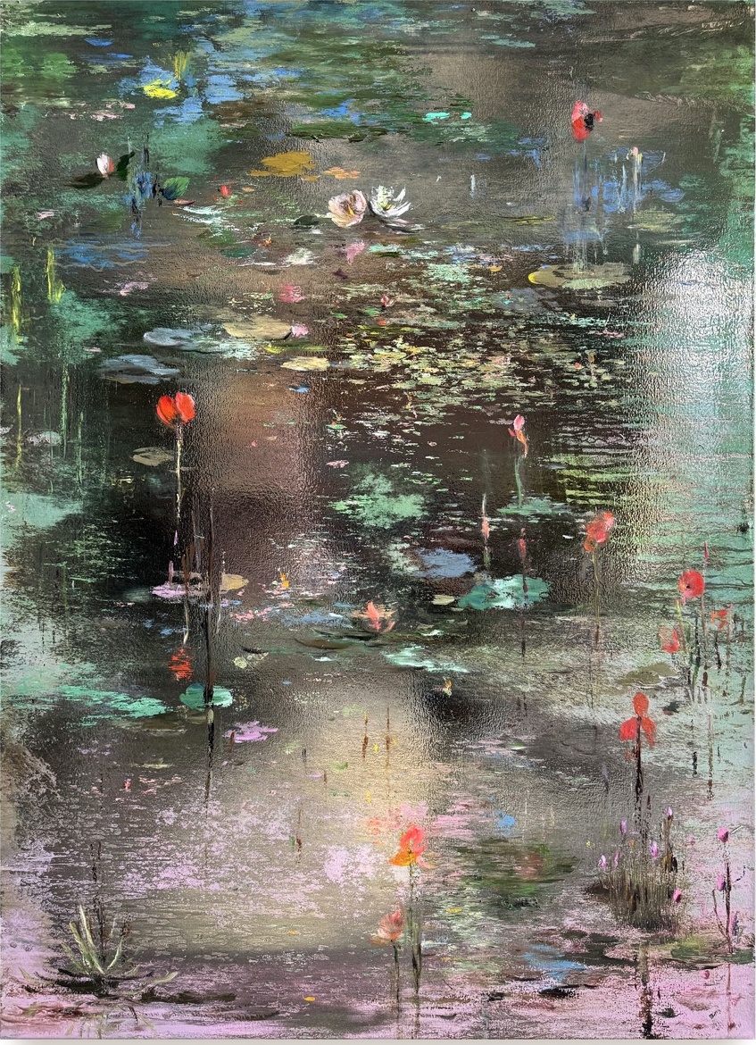 In this two-person exhibition, Hod and Mesler approach these motifs not as inherited symbols to be revisited, but as painterly problems to be reactivated—as emotional and psychological structures. Nir Hod’s 100 Years Are Not Enough series stems from a period of deep observation in nature and from the conviction that “one hundred years are not enough” to fully apprehend life’s wonder. These works conjure dreamlike landscapes in which floral forms hover above shimmering, reflective chromatic surfaces. Hod’s flowers appear less as botanical subjects than as emotional surrogates—gestures of intimacy, excess, and vulnerability. Mesler’s mountains, by contrast, emerge not as topographical facts but as psychological terrains shaped by memory and distance. In both practices, the history of painting is present but unsettled: surfaces are layered, images oscillate between figuration and abstraction, and the act of looking becomes inseparable from feeling.