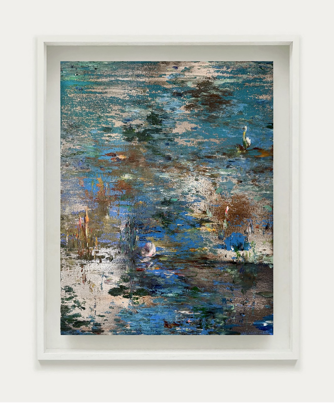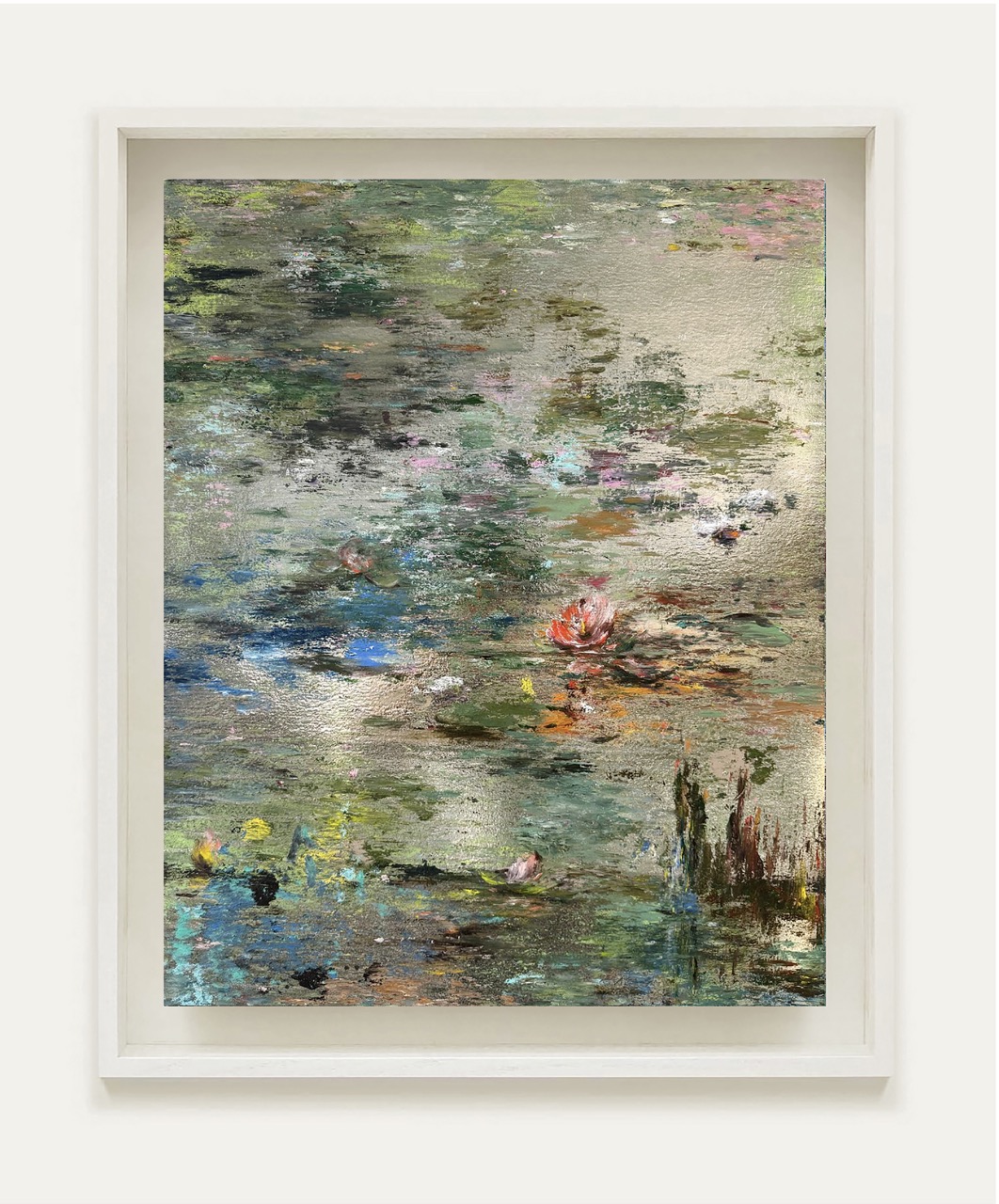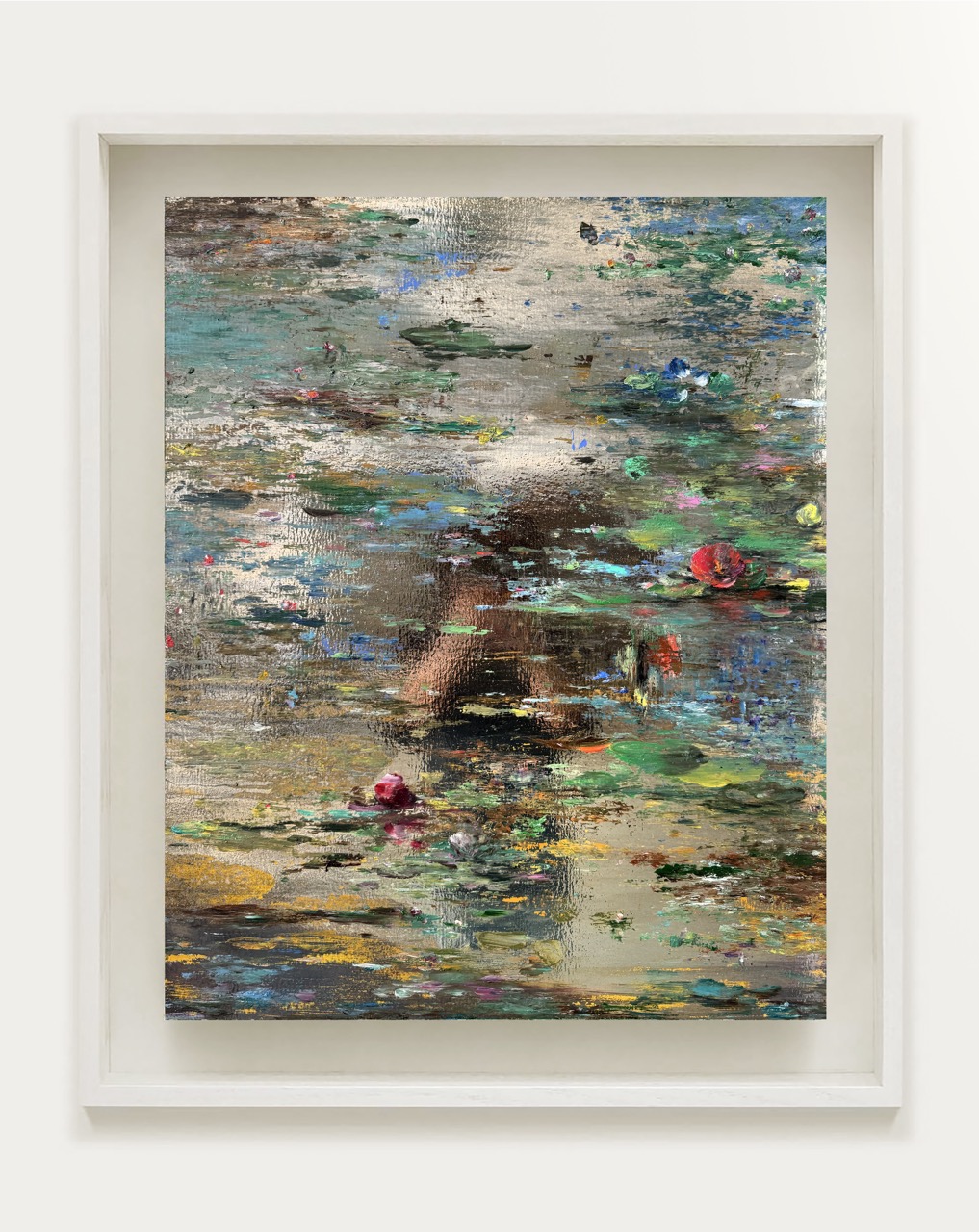 Central to Hod’s work is his innovative use of reflective chrome surfaces. These mirror-like planes are not simply finishes but active agents within the paintings. Beneath them lie richly worked layers of oil paint that are partially revealed and partially obscured through a demanding, destructive process. The chrome is scraped, eroded, and chemically altered, forcing the image to hover between presence and disappearance. The resulting surface reflects the viewer back into the work while simultaneously withholding full access to what lies beneath. Impermanence is heightened by the viewer’s own fleeting reflection. The series title underscores this tension: no amount of time is sufficient to fully grasp or hold onto beauty precisely because it is bound to loss.