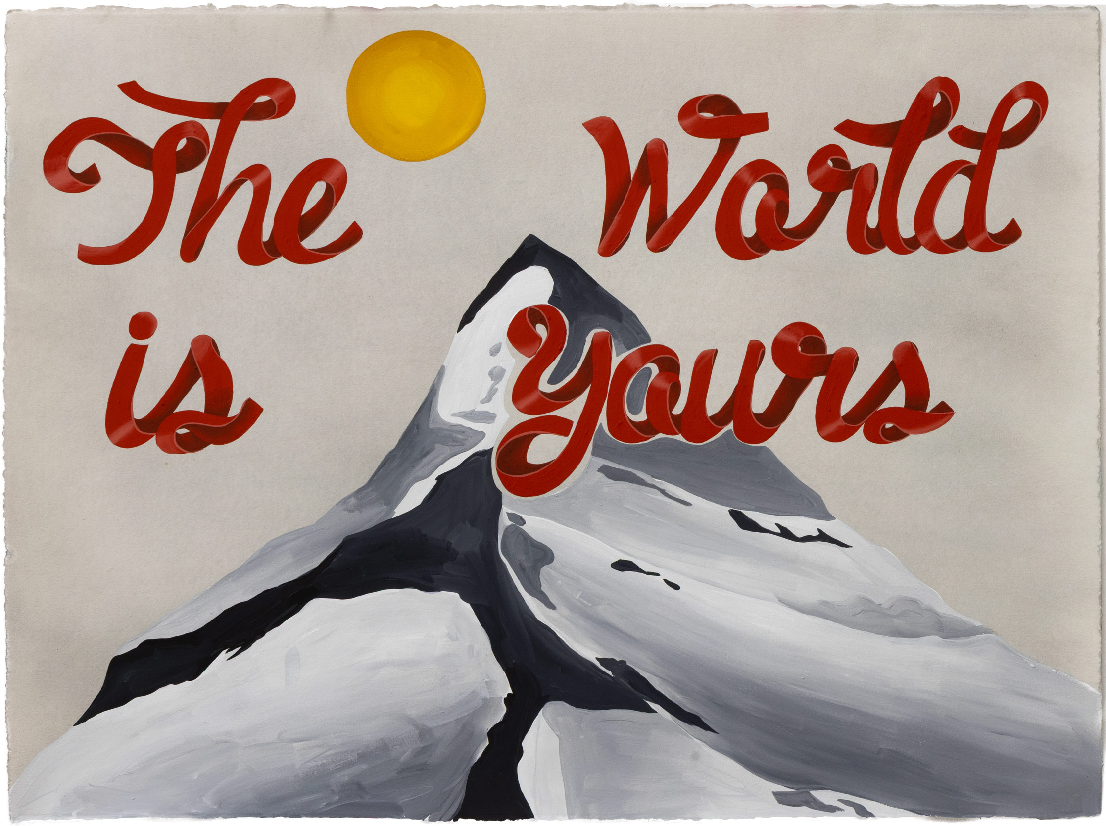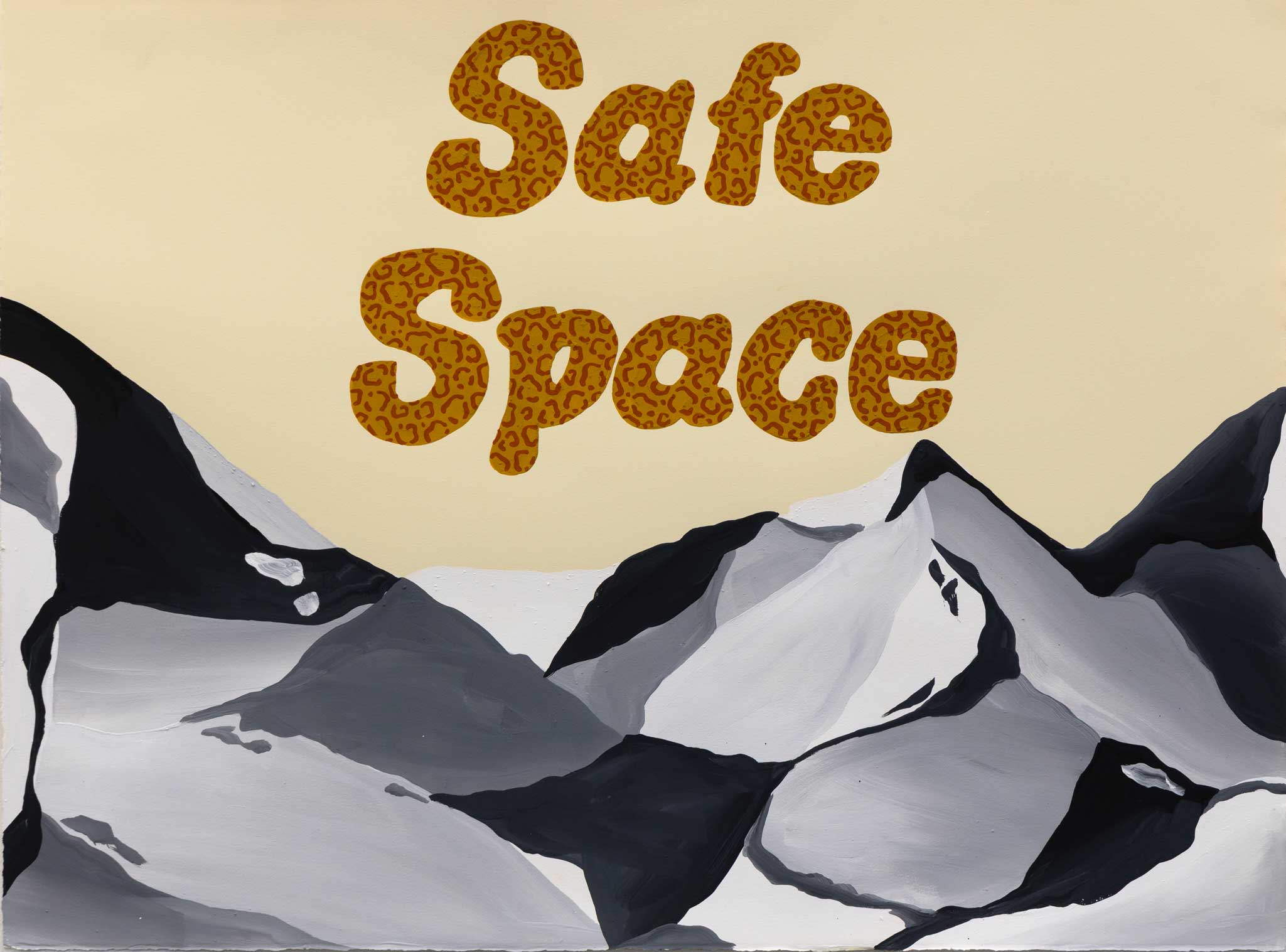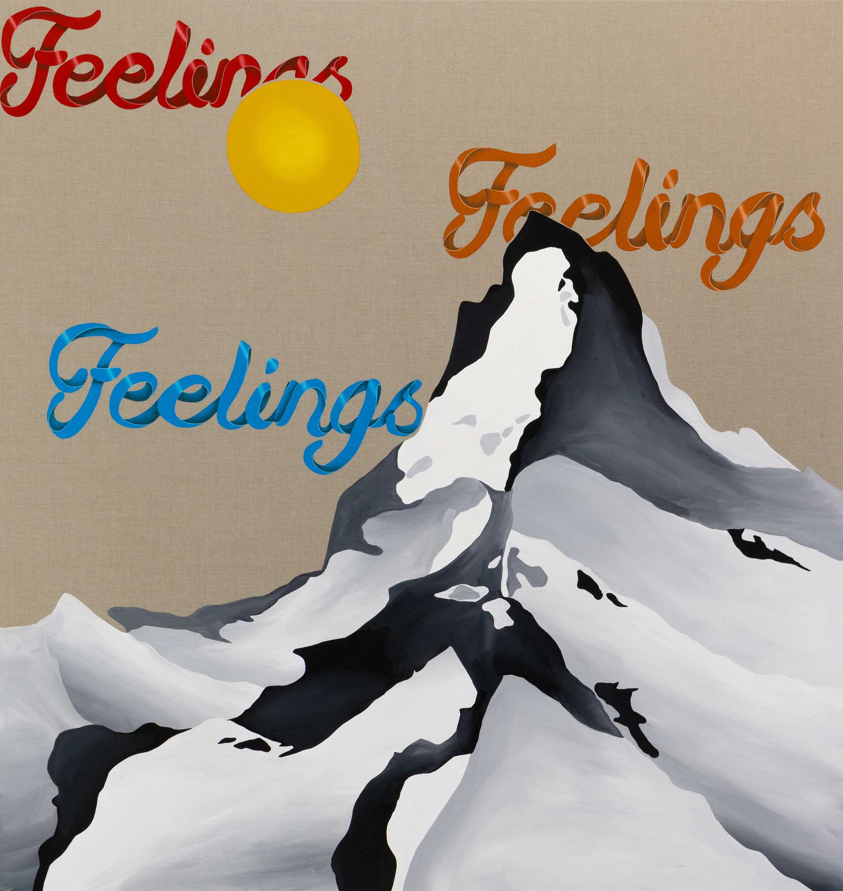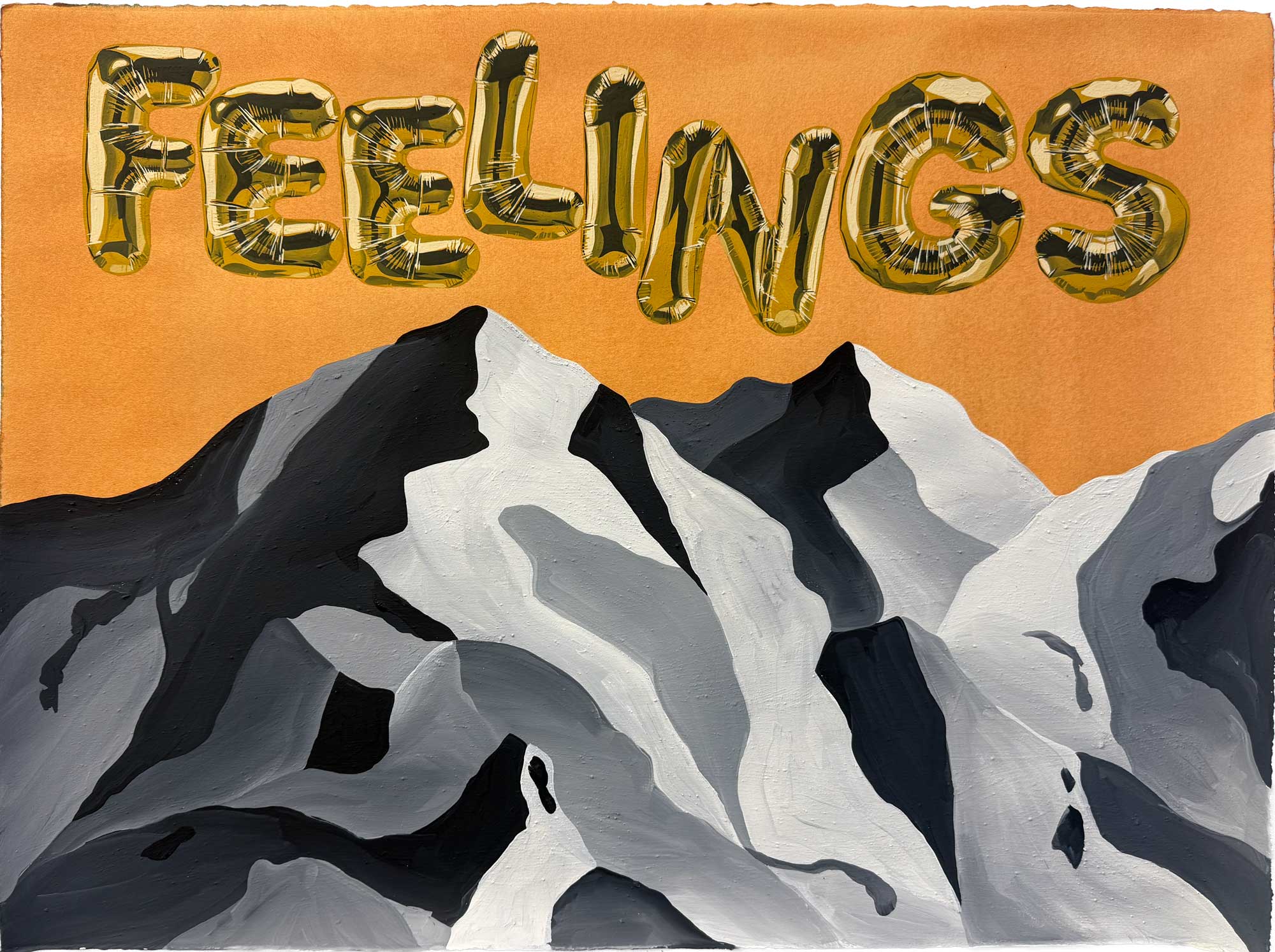 Mesler’s texts are deliberately open-ended. Phrases that initially sound reassuring or affirmational quickly become ambiguous, even destabilizing. Positive messaging tips into emptiness, comfort slides into irony. In encountering these works, viewers are compelled to complete them internally, locating themselves within their emotional register. The World Is Yours may read as empowerment or as hollow promise; Safe Space, spelled out in spotted letters above a shadowed, snow-blanketed valley, hovers between refuge and unease. Feelings, floating in golden balloon letters above pointed pistes, collapses emotional complexity into a single, loaded word. The act of reading becomes an act of self-recognition; language becomes a mirror not of the body, but of interior life.