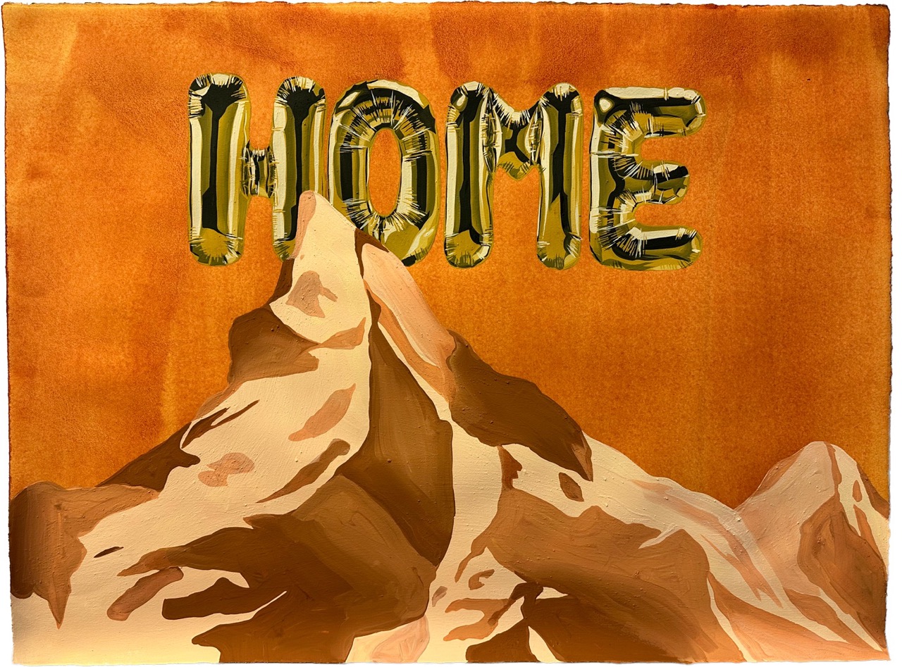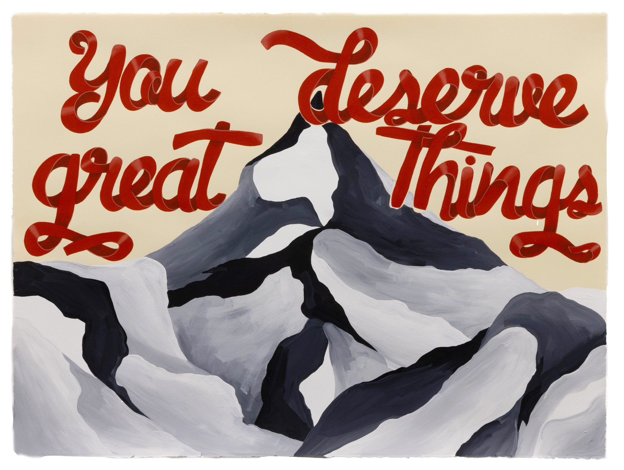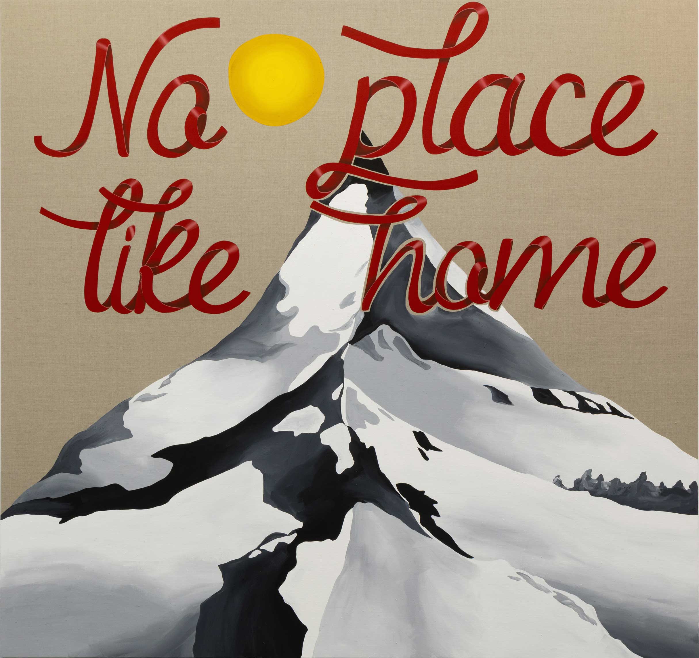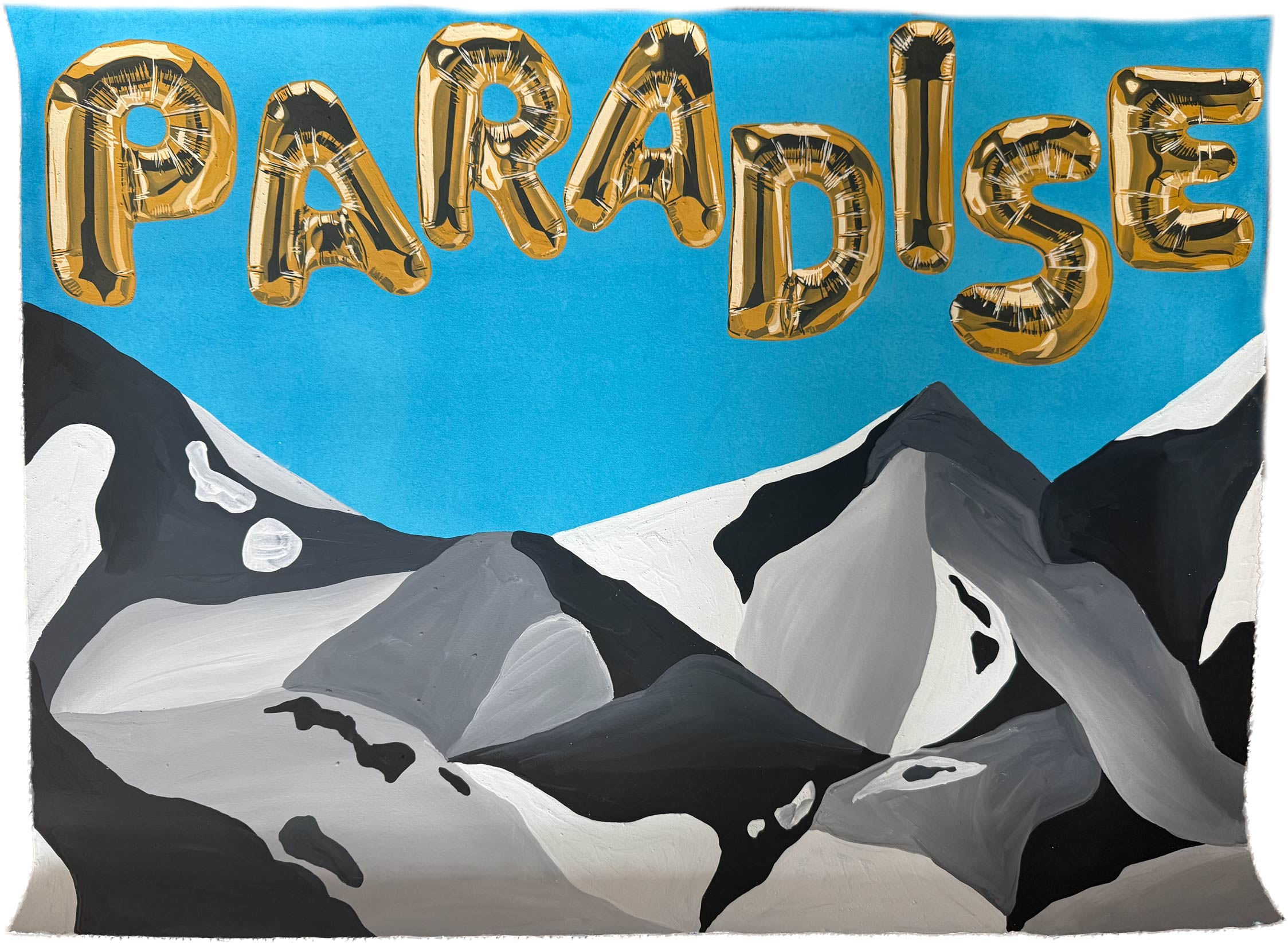 Mesler’s texts are deliberately open-ended. Phrases that initially sound reassuring or affirmational quickly become ambiguous, even destabilizing. Positive messaging tips into emptiness, comfort slides into irony. In encountering these works, viewers are compelled to complete them internally, locating themselves within their emotional register. The World Is Yours may read as empowerment or as hollow promise; Safe Space, spelled out in spotted letters above a shadowed, snow-blanketed valley, hovers between refuge and unease. Feelings, floating in golden balloon letters above pointed pistes, collapses emotional complexity into a single, loaded word. The act of reading becomes an act of self-recognition; language becomes a mirror not of the body, but of interior life.