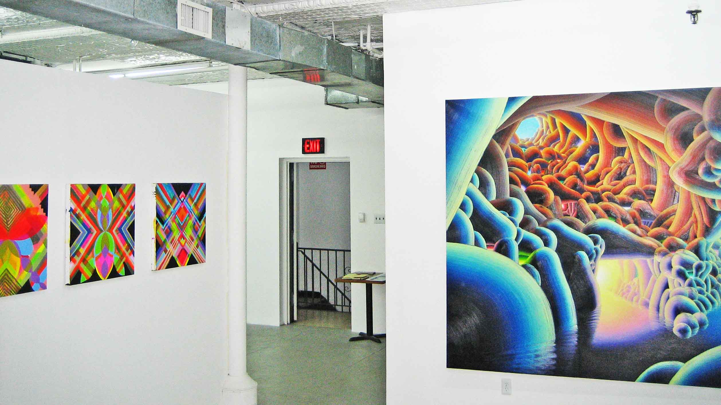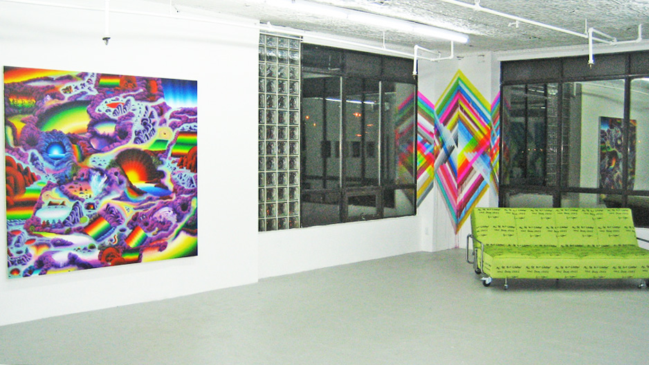 Maya Hayuk (1969) has been commissioned to paint a mural which will spread out onto all gallery walls and will serve as painterly humus for the other artists’ works that will be installed on top of it. American artist Maya Hayuk is not simply a painter but designs advertising posters, CD covers, T-shirts and skateboard images, paints on walls of houses, hotel rooms and barns, draws and photographs. Hayuk’s large radius of action is closely related to her interest in collaborations of very different kind. Her works develop their own dynamic out of cooperative projects with other artists and musicians, as well as with a storehouse of forms and images that come from various cultures and contexts. She activates the many different influences and incorporates them into her visual world. A renaissance of pop culture created by flowing movements, strong colour, the use of ornamental and geometrical shapes or organic patterns which sum up to rhythmical and outrageous compositions that lead into a land of fantasy and flower-power. Her painterly inventions are even more overwhelming once one has discovered that no drafts are made beforehand to prepare her large murals.