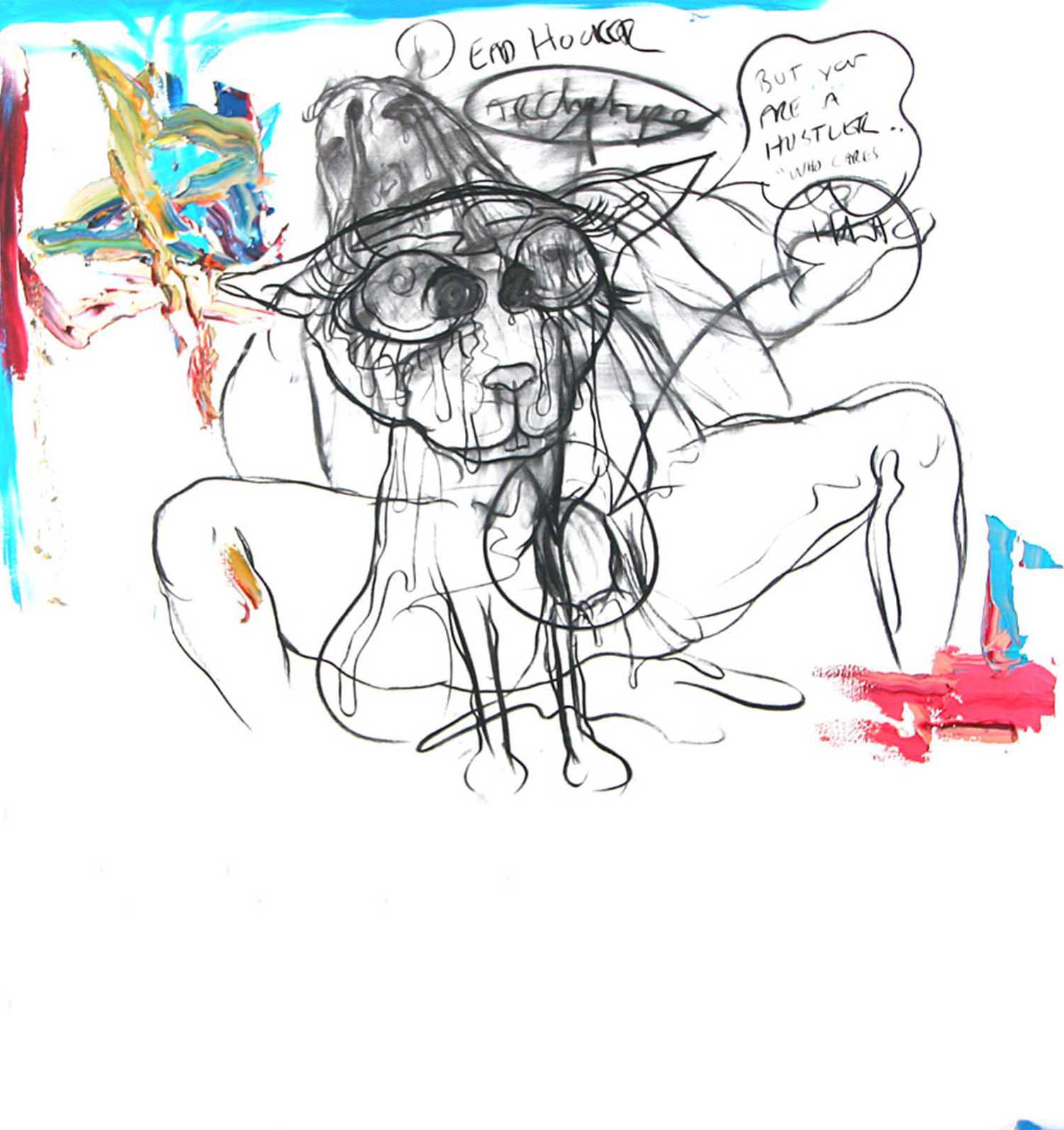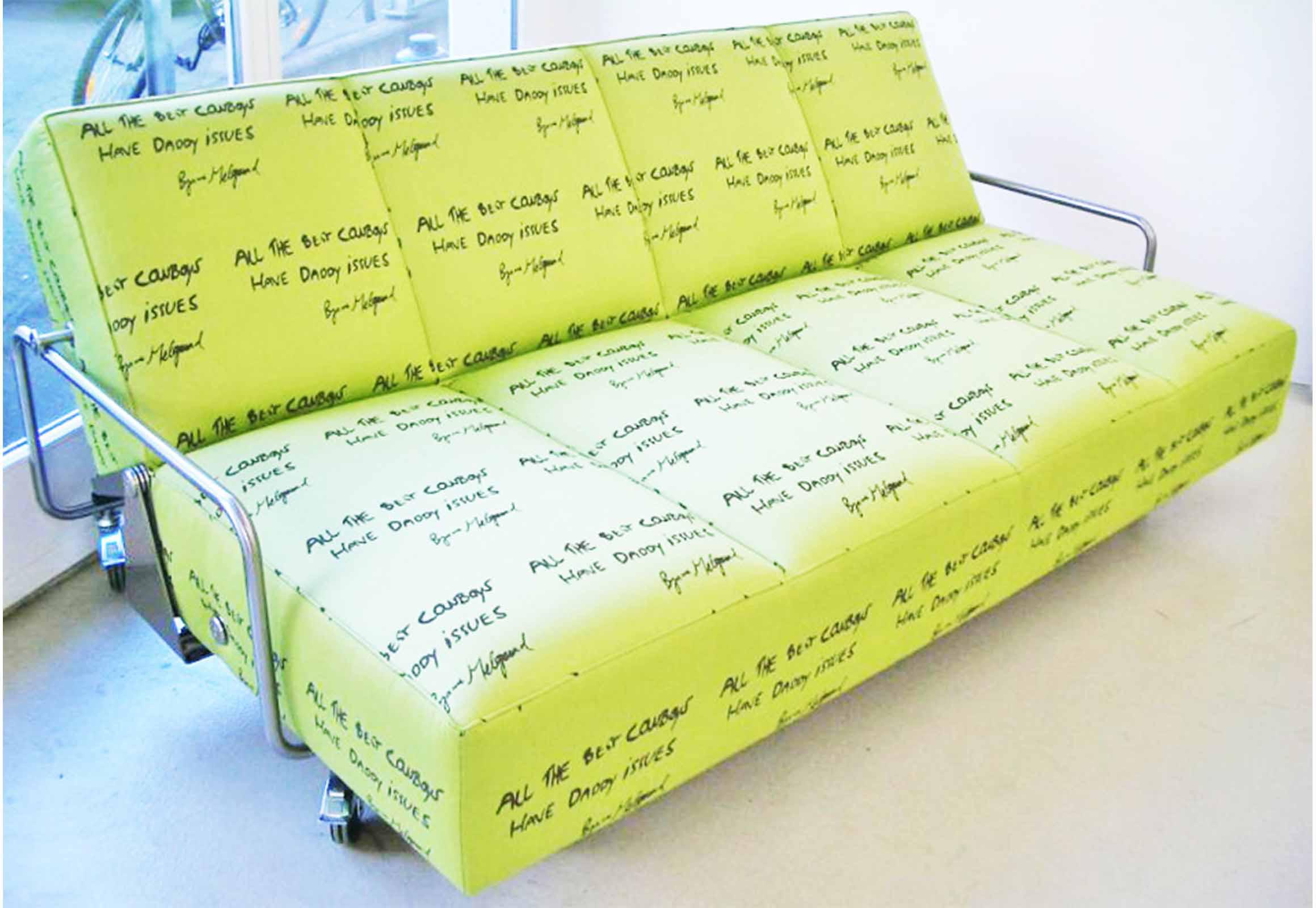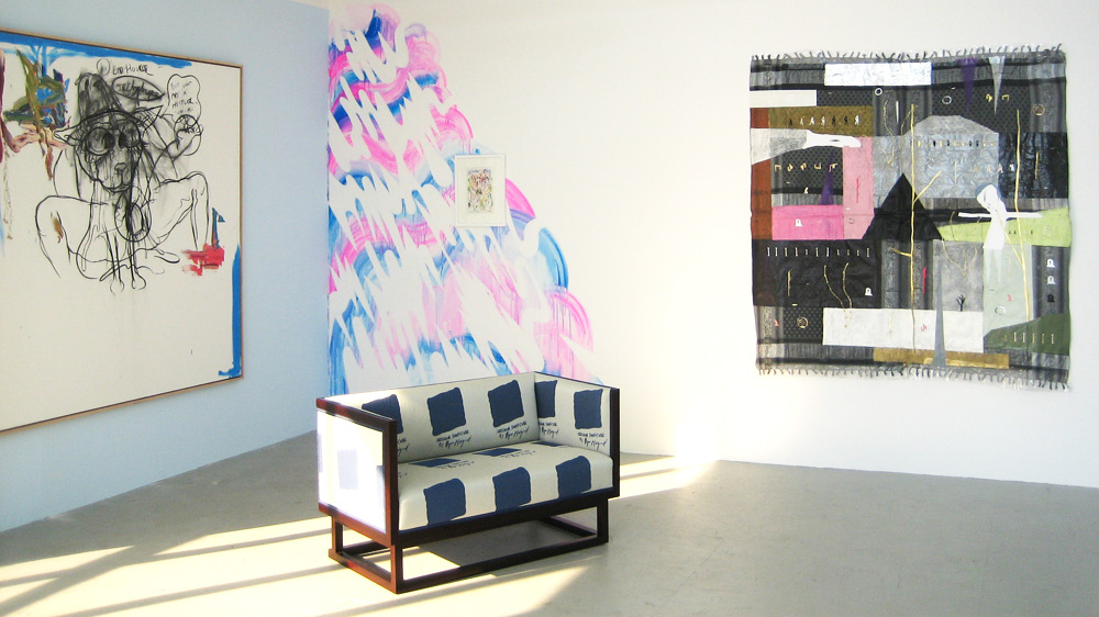 Symbolised by a new alter ego; a little man with a cane and a large head, Bjarne Melgaard literally plays with themes such as identity, self representation and self perception in his works. How the ‘I’ may speak in several voices or may be several personas at once and how one is able to have several identities, not to mention split (schizophrenic) personalities. Over the years Melgaard created a powerful personal universe – his own mythology is instantly recognisable to viewers familiar with his Œuvre. In the latest works it’s the miniature pig Les Super and the Chihuahua from Melgaard’s previous series of works, now present as a faithful, although let down friend. His canvases are composed by the use of mis-matching colours, figures and words enclosed by dominant black lines and autographs that bring back to mind toilet scribbles or speech balloons from comic stripes. Melgaard’s sofa objects come along as innocuous Designer furniture, though it is highly explosive by being upholstered with fabric created from his drawings. The sofa itself stands in for the boredom of conformity in the bourgeois world whereas Melgaard’s credo is to emphasize the difference, the abnormality.