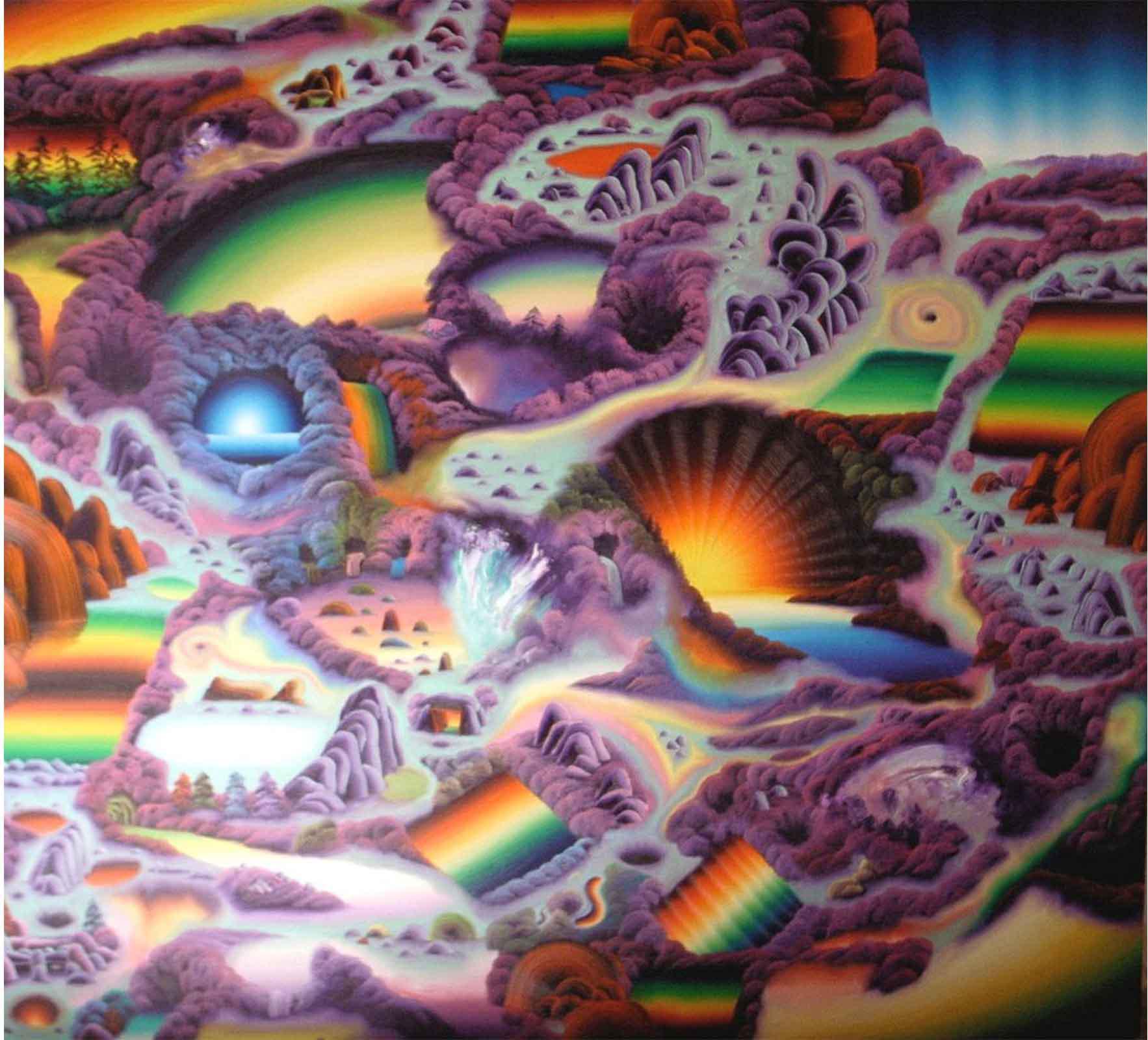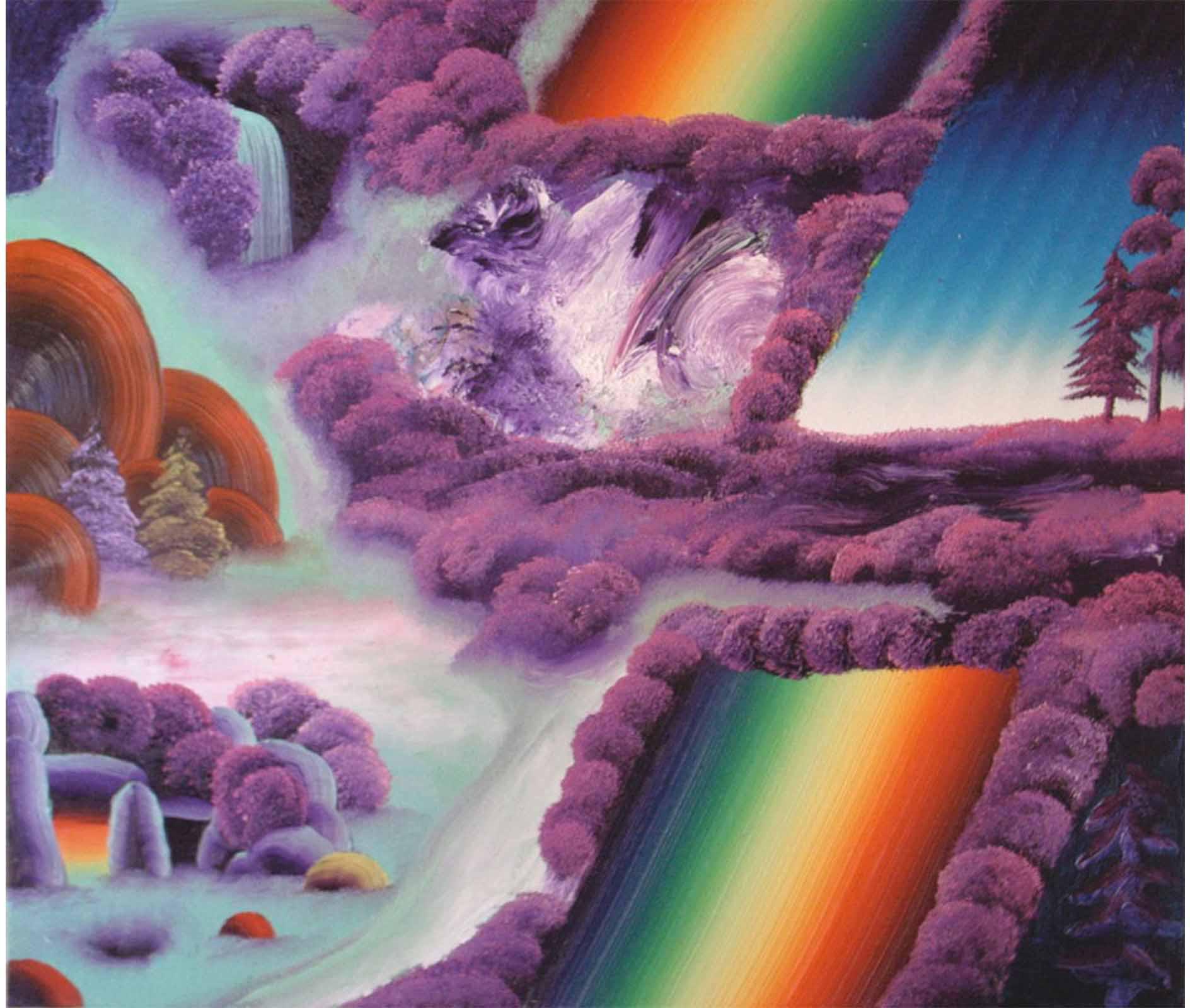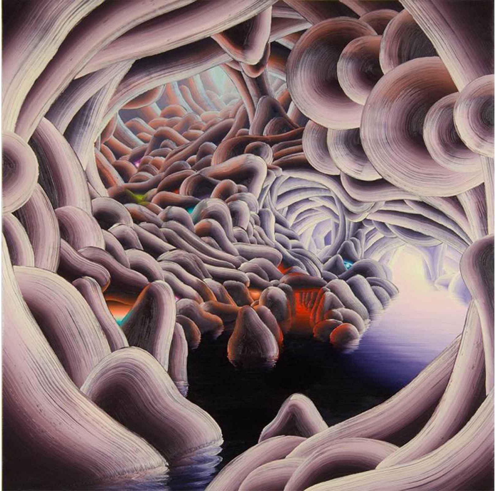 Speaking of fantasy and the invention of surrealistic or even psychedelic worlds in today’s painting leads over to London based artist Christian Ward (born 1977). ‘Landscape’ is not even the appropriate term to describe Christian Ward’s eye-grabbing vivid paintings where Technicolor Mountains, caverns and grottoes shimmer with rainbows, cascade with multicoloured waterfalls and are wreathed in iridescent mist. Rather inventing landscapes of mind, he refers to Sixties psychedelic graphic design and is at the same time inspired by ancient Chinese paintings, as well as the latest Japanese animation techniques. Yet for all their phantasmagorical otherworldliness – one critic described them as a cross between Fantasia and The Land That Time Forgot – they are always based on the direct experience of a real place. However, they appear as utopian villages and places or, as Ward puts it, ‘these paintings are as much a mental island, an unknowable space that I can do what I want in, but which in the end does what it wants.’ In the past, Ward’s wanderings have taken him from the mountains of Scotland and across America into the Arizona desert, and some of his more recent paintings have their starting point in Yakushima, an island off the southern coast of Japan. This World Heritage Site with its virgin, swampy jungle and Rocky Mountains plunging into the ocean, is not only scenically spectacular, but also has a personal significance because it is the area where Ward’s ancestors come from and which he had last visited as a child. Christian Ward’s mind maps have aerial views that play with the spatial order and scales of objects or figures and are confused by the quasi complete absence of horizon lines.
