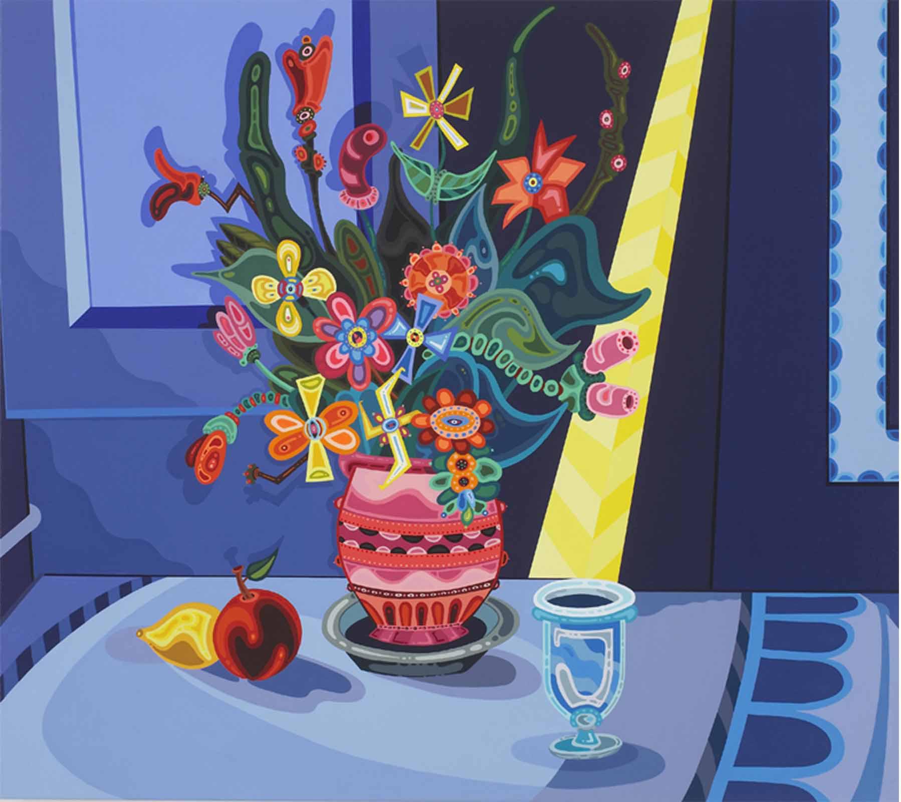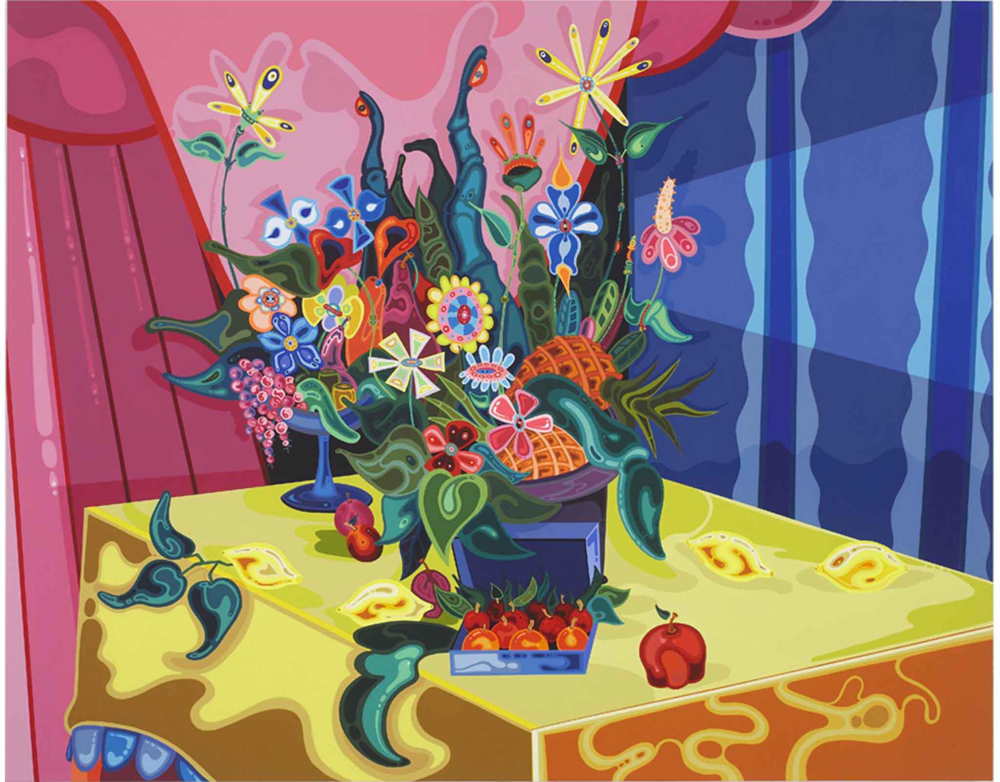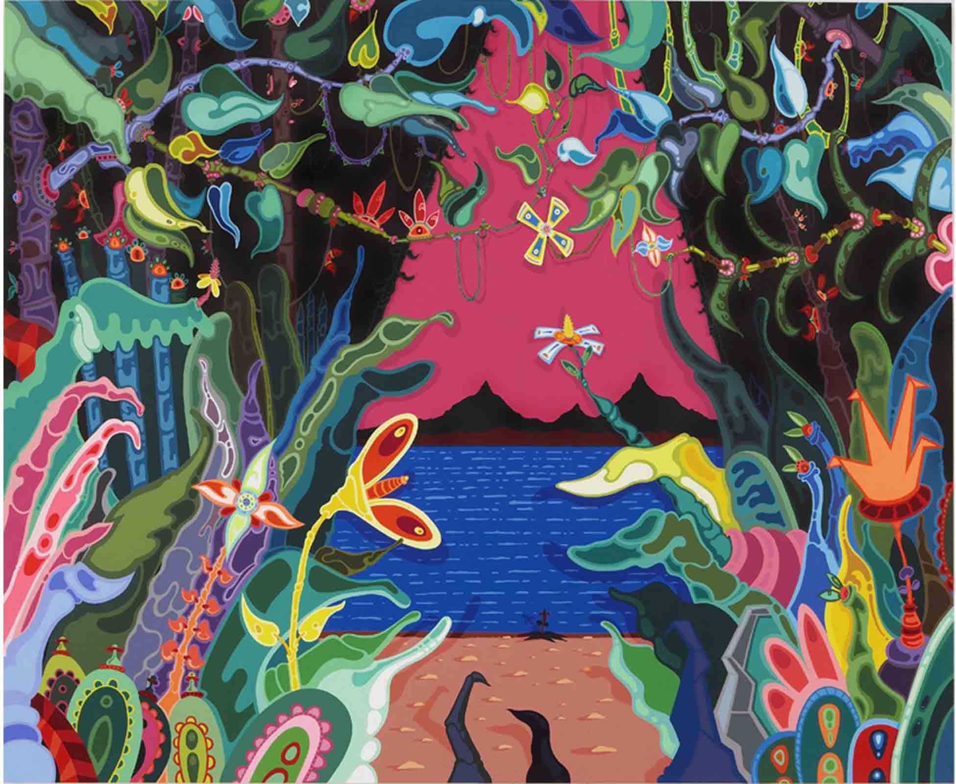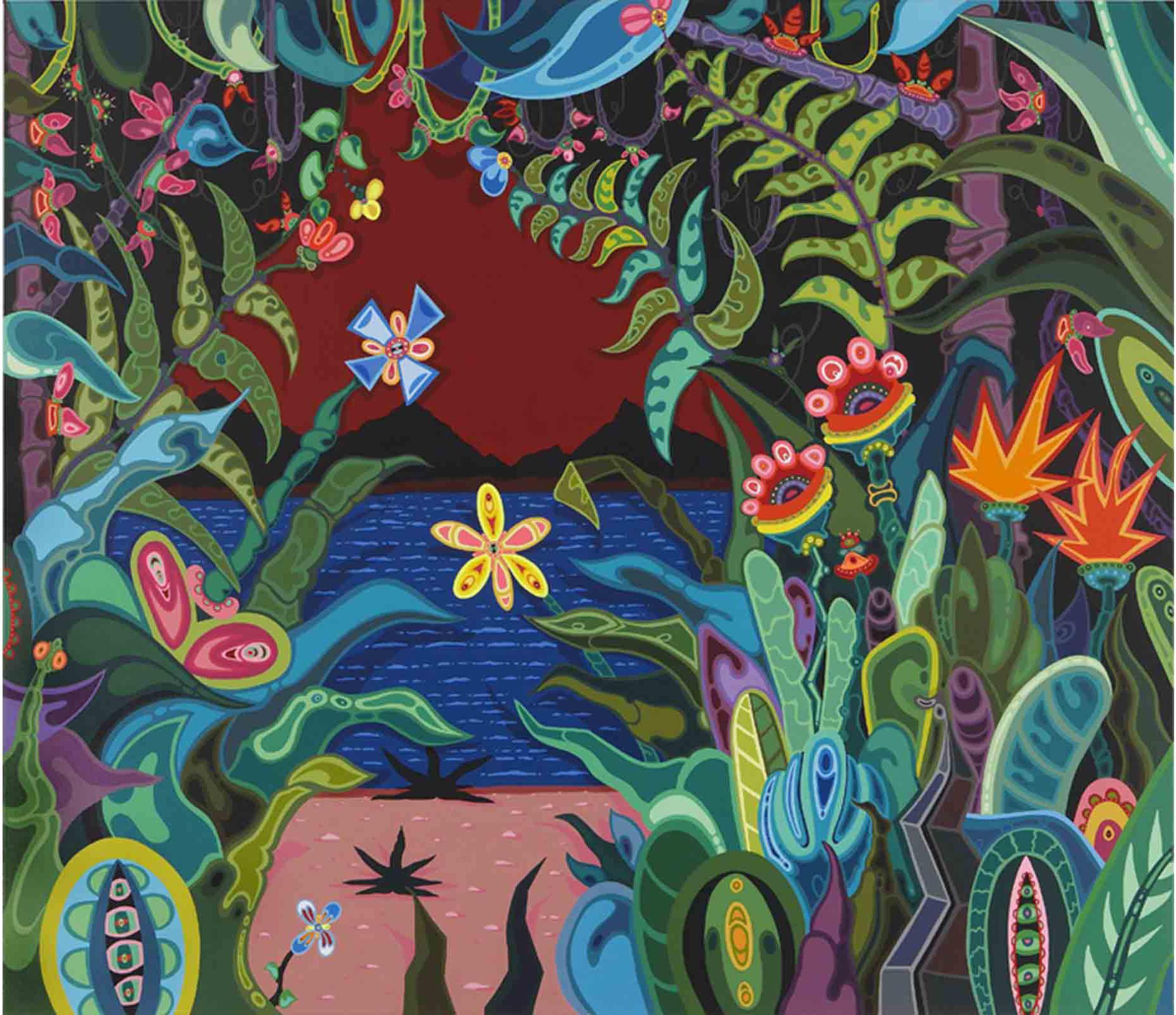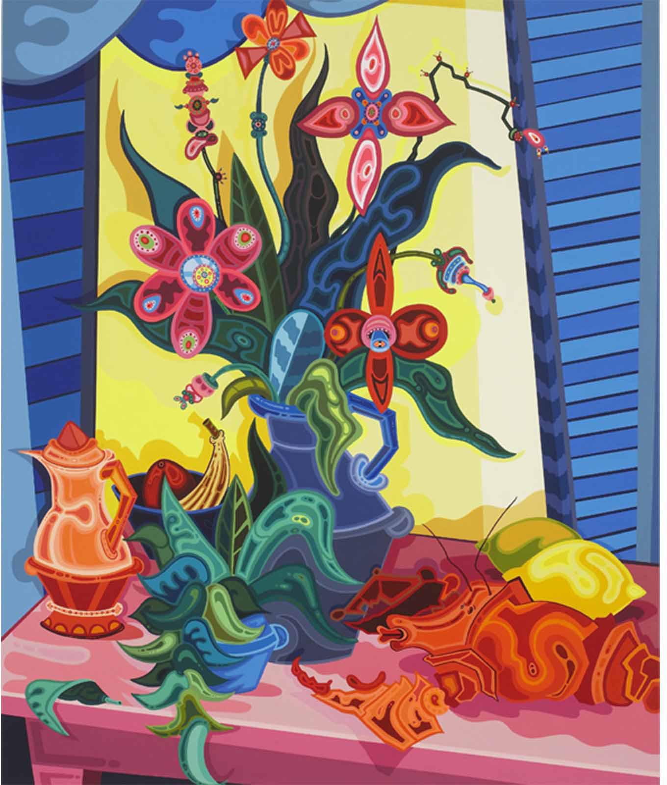 Featuring new works from his still-life and jungle series, Other Side Of Morning and Bermuda takes its cues from Parker’s childhood fascination with the Bermuda Triangle; a real life nether-zone of the bizarre and inexplicable. The canvases, each a chaotically balanced myriad of toxic-hued exotica, unsettle with the sense of skewed familiarity. With their homage references to Rousseau, Picasso, or Lichtenstein, the hallucinogenic landscapes and vases of radioactive flora brazenly stake claim on hallowed territory: the archetypal subjects reworked, reinvented, and authoritatively re-owned through Parker’s exhaustive process of drawing before they’re improvised afresh on canvas.