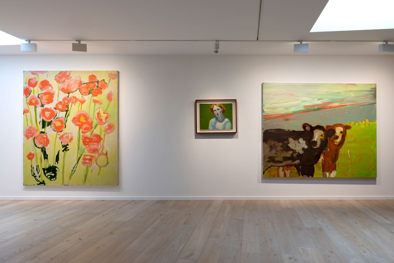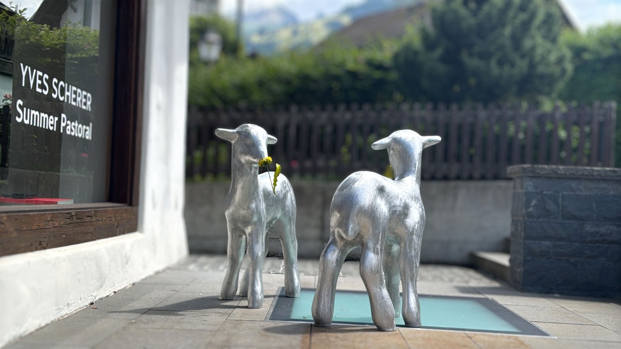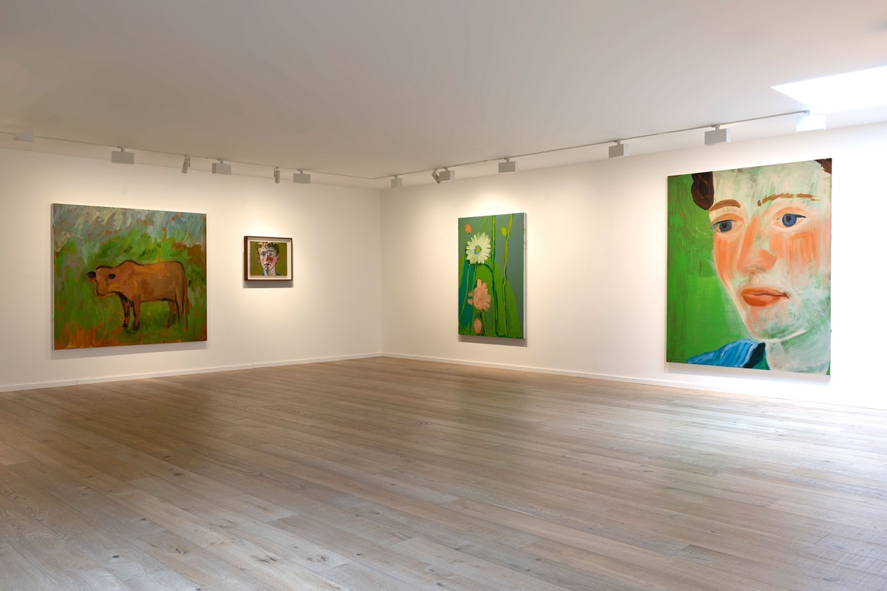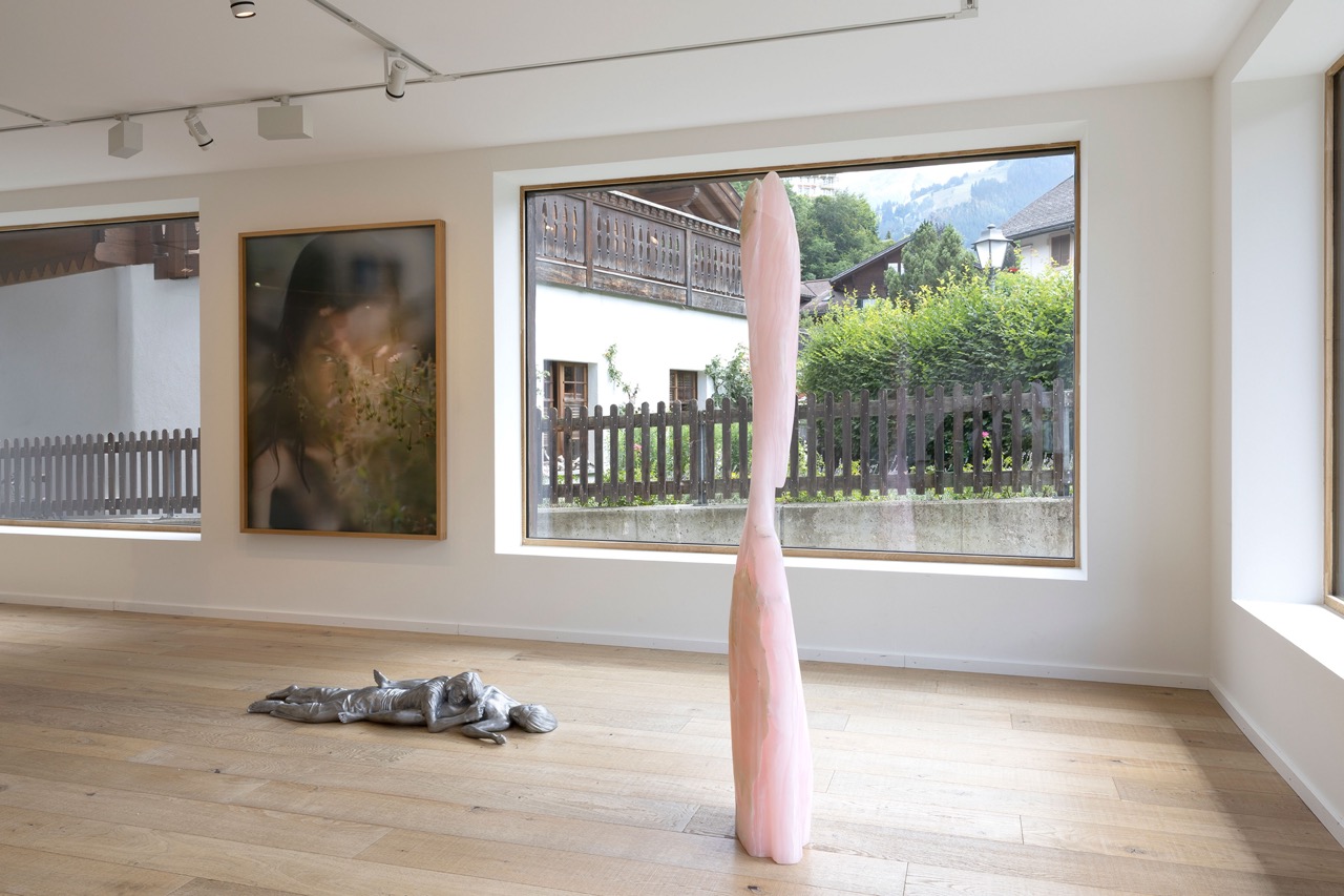 Sculptures are dotted about the first floor, which build upon the forms and materials of previous pieces. A country boy plucks flowers. There is also a series of women made from granite, bronze, and onyx. Goats punctuate the space, moving from the outside to inside, with flowers on their noses. Ceramic plants are scattered about the ground. Together, these works evoke the great Swiss outdoors with knowingly wholesome wit.