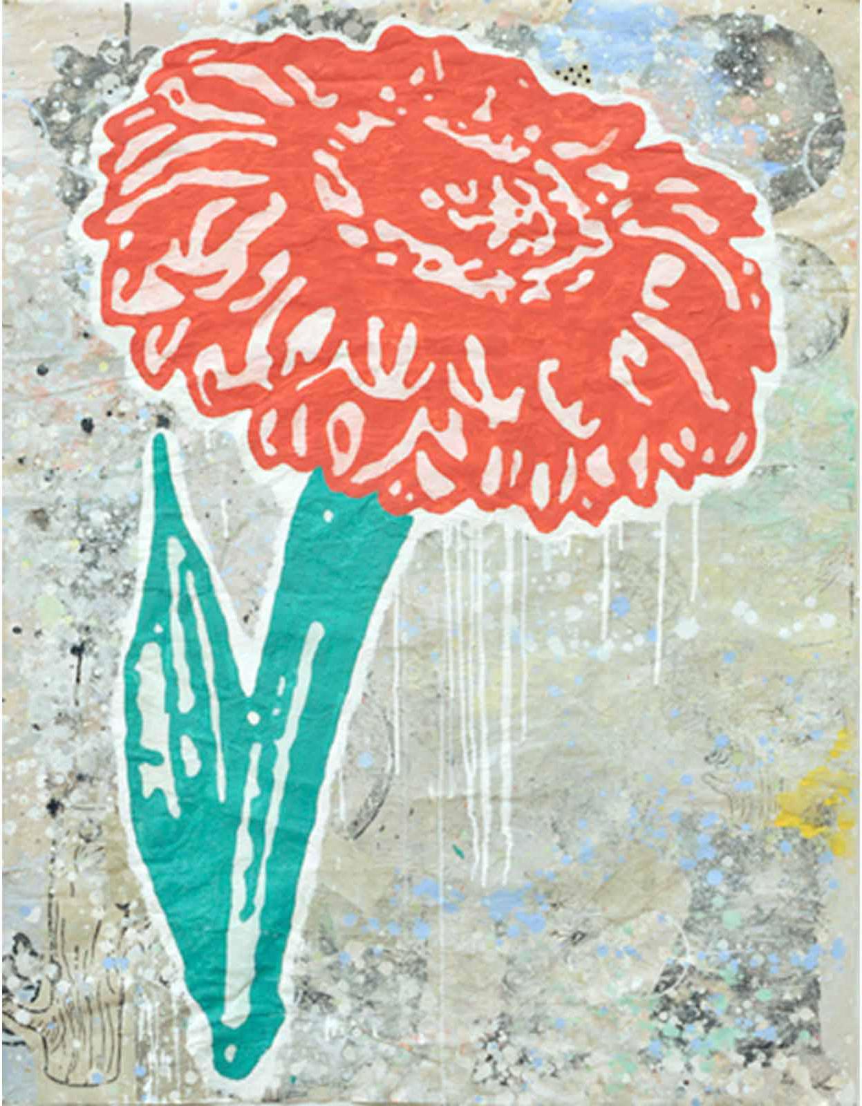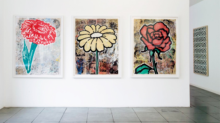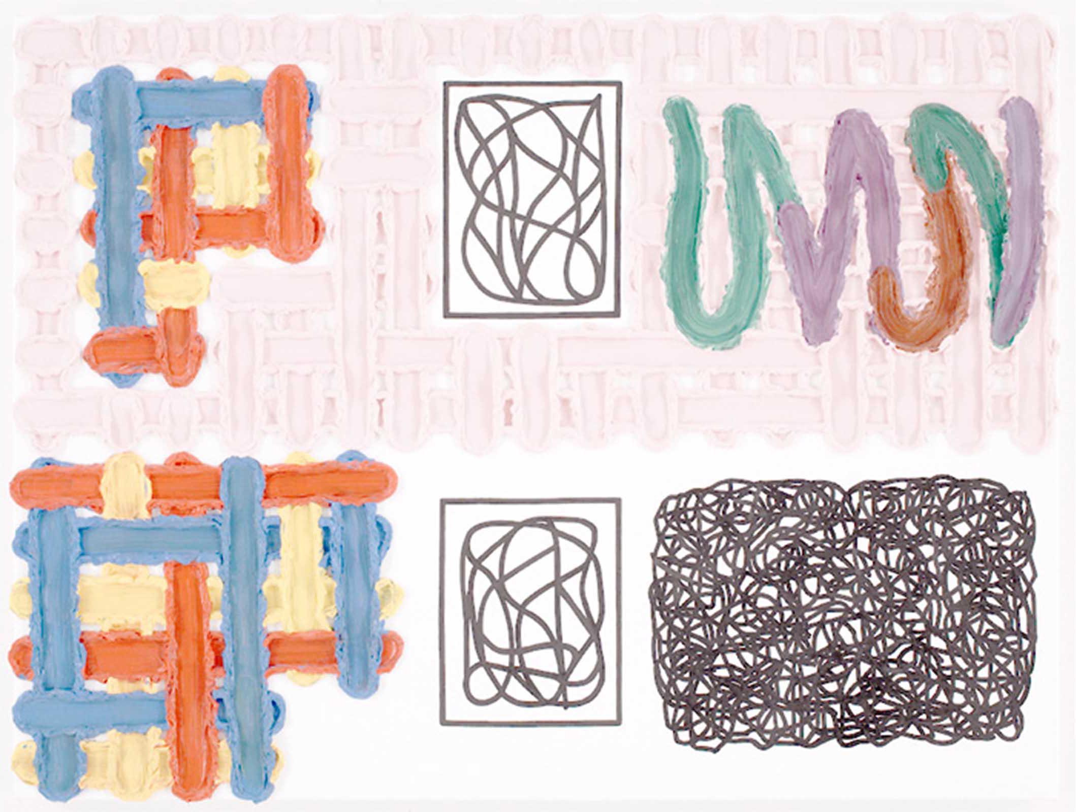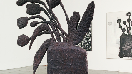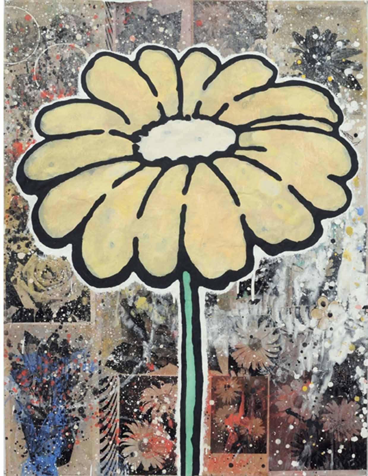 One of the fundamental paradoxes of these American painters is that, in its strictest sense, their image is not ‘image’: it is a platform for artistic negotiation and exploration, a departure point from the familiar to visual, emotive, and intellectual extremity. Their very concept of image is a constantly elusive fascination. In Baechler’s works on paper – all from his most recent flowers series – this notion manifests through his intense process of pictorial aggregation and obliteration: his collaged surfaces – built up from found material, some original, some adulterated through rigorous drawing and re-drawing – form fragmented planes, pre-charged with overloaded information and meanings. These networks of interconnectedness (of everything and nothing) function akin to visual white noise, their constant background hum a stark reminder of the technological anxiety that belies the primal imperative of his mark making and central motifs; a duplicity made totemic through his accompanying sculptural silhouettes.