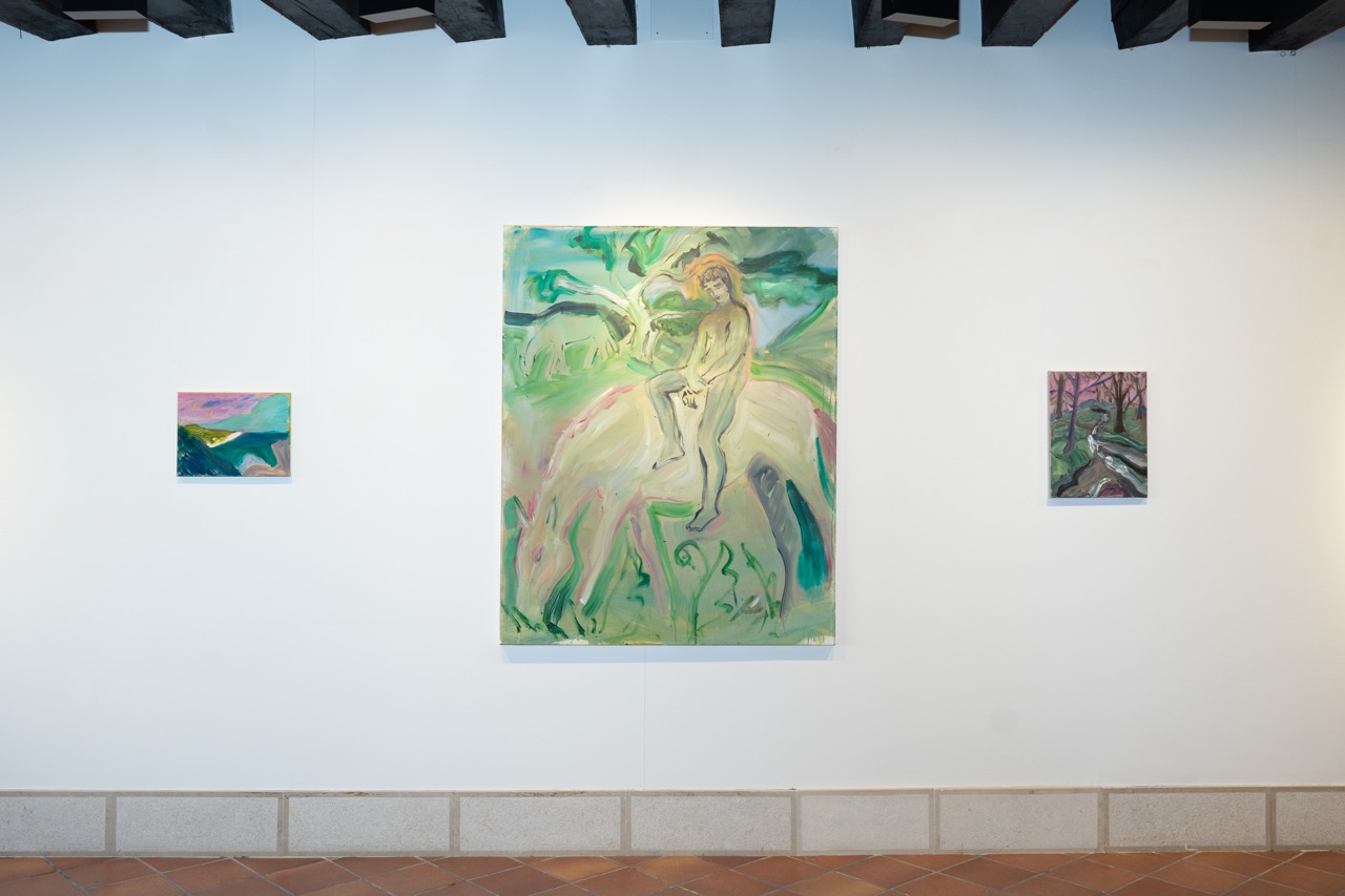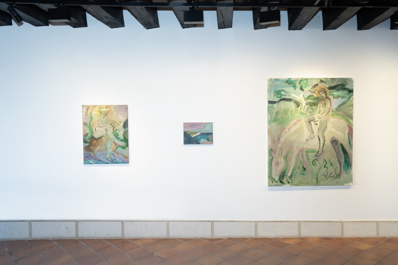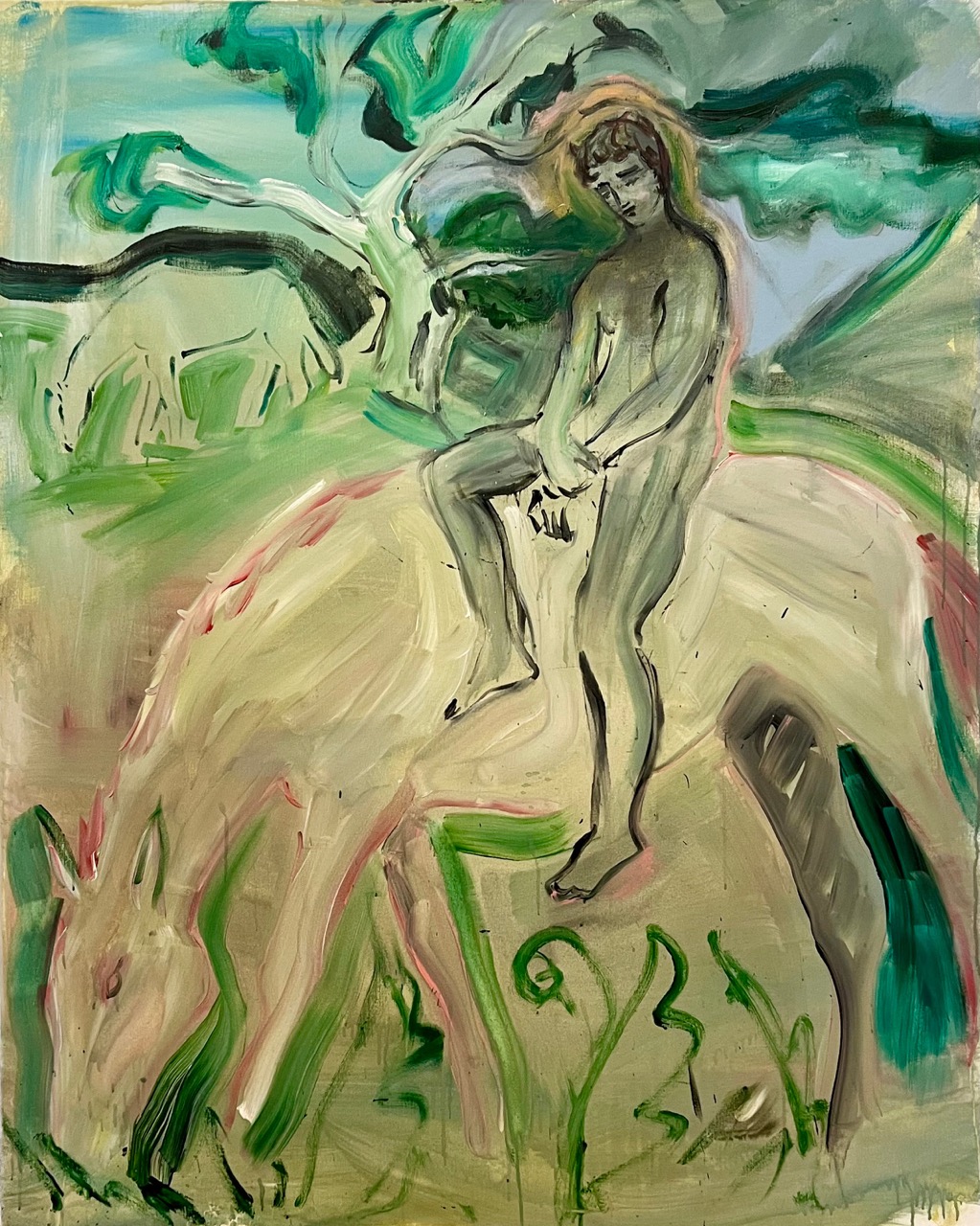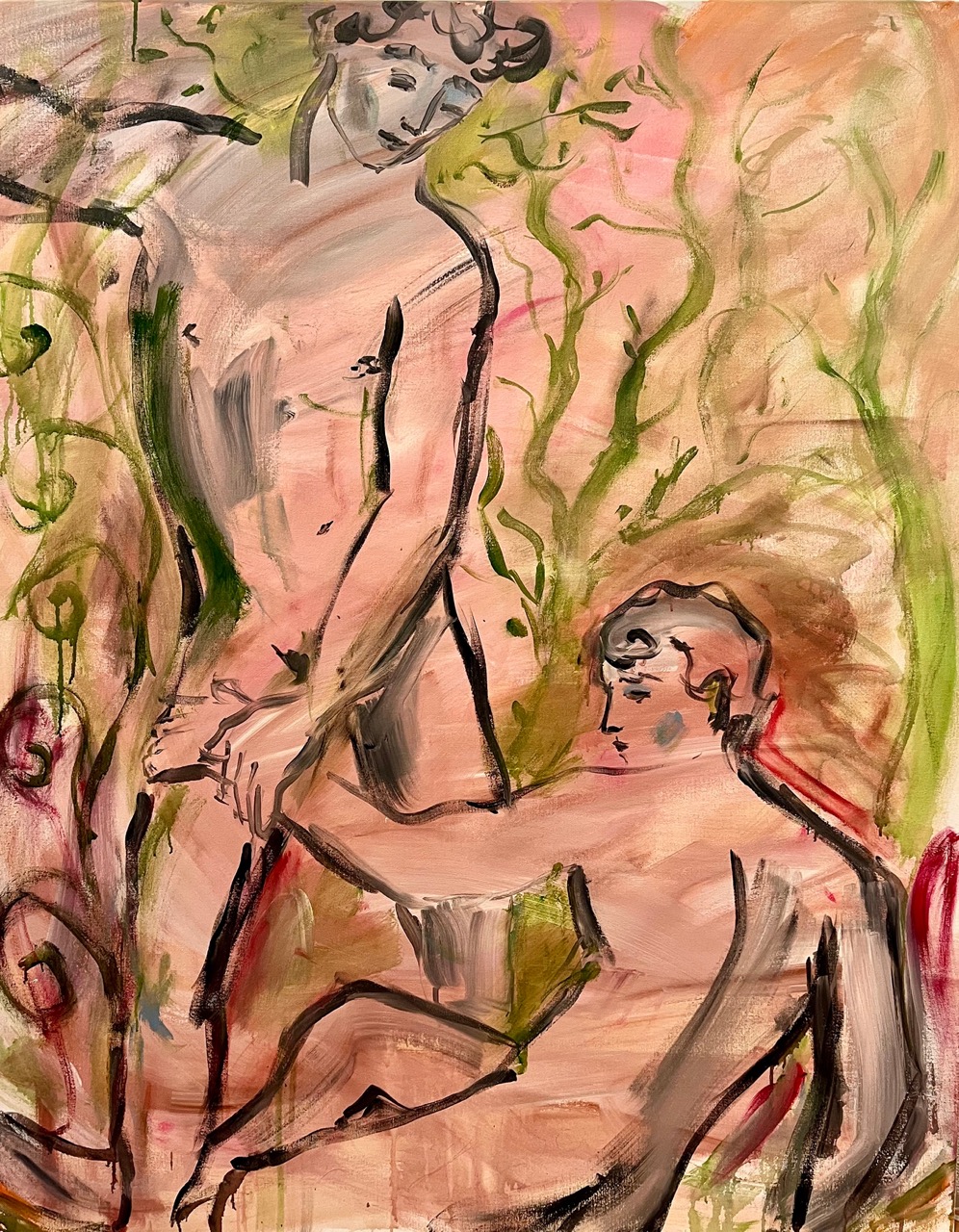 Luke Edward Hall’s solo exhibition at Patricia Low Contemporary, Venice, is set in ‘The Silver Vale’, a place where mythology and personal identity merge, where landscape and fantasy dissolve into one another. The exhibition presents new paintings created by Hall in his Oxfordshire studio over the past few months. The starting point for this new body of work is the large painting XXX made in September 2024—a vision of Pan, the Greek god of the wild, leading a figure into a glowing, dreamlike woodland. This moment of initiation, at once intimate and ecstatic, became the catalyst for a series of paintings and drawings that examine queer identity through the lens of mythology and nature.